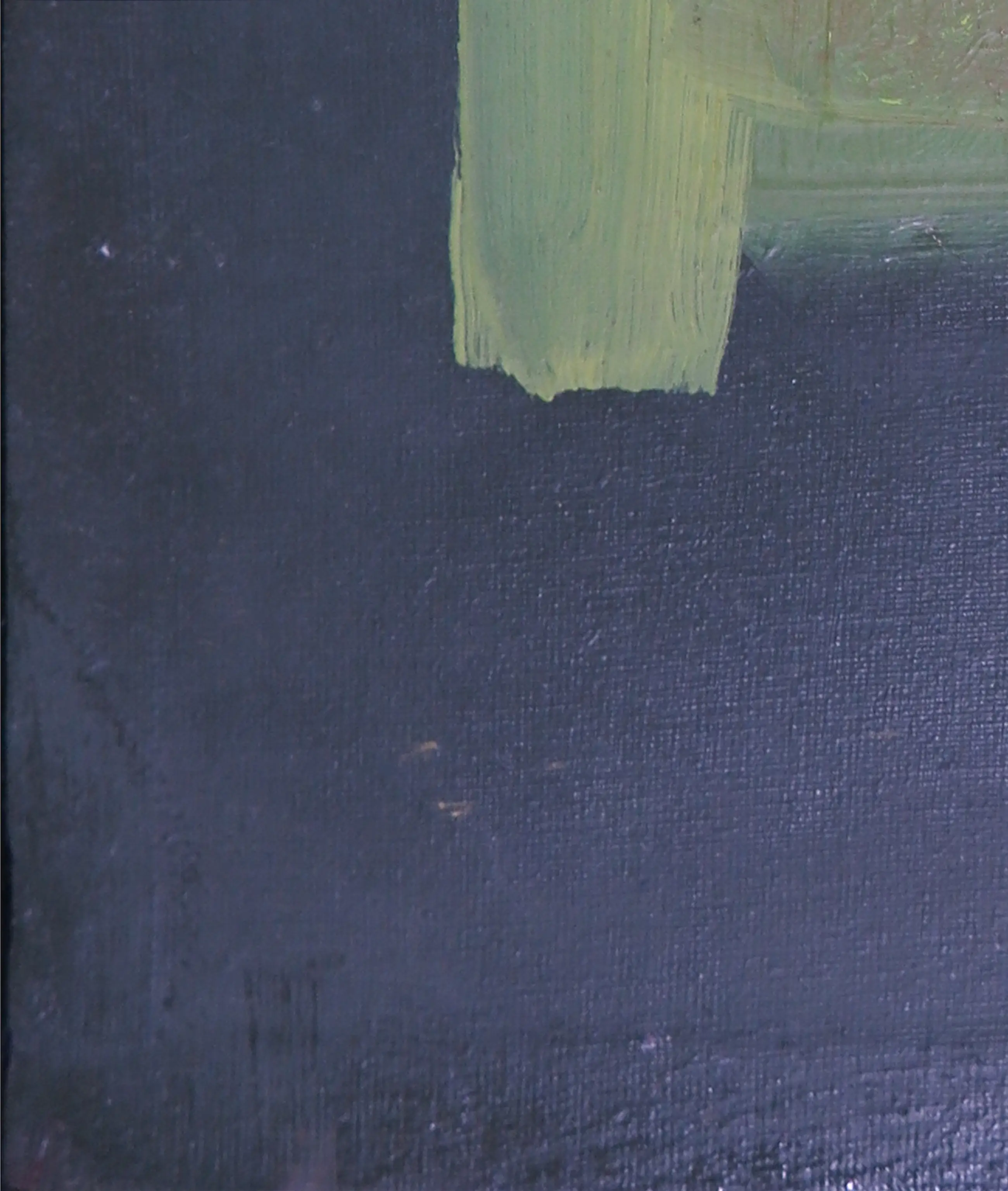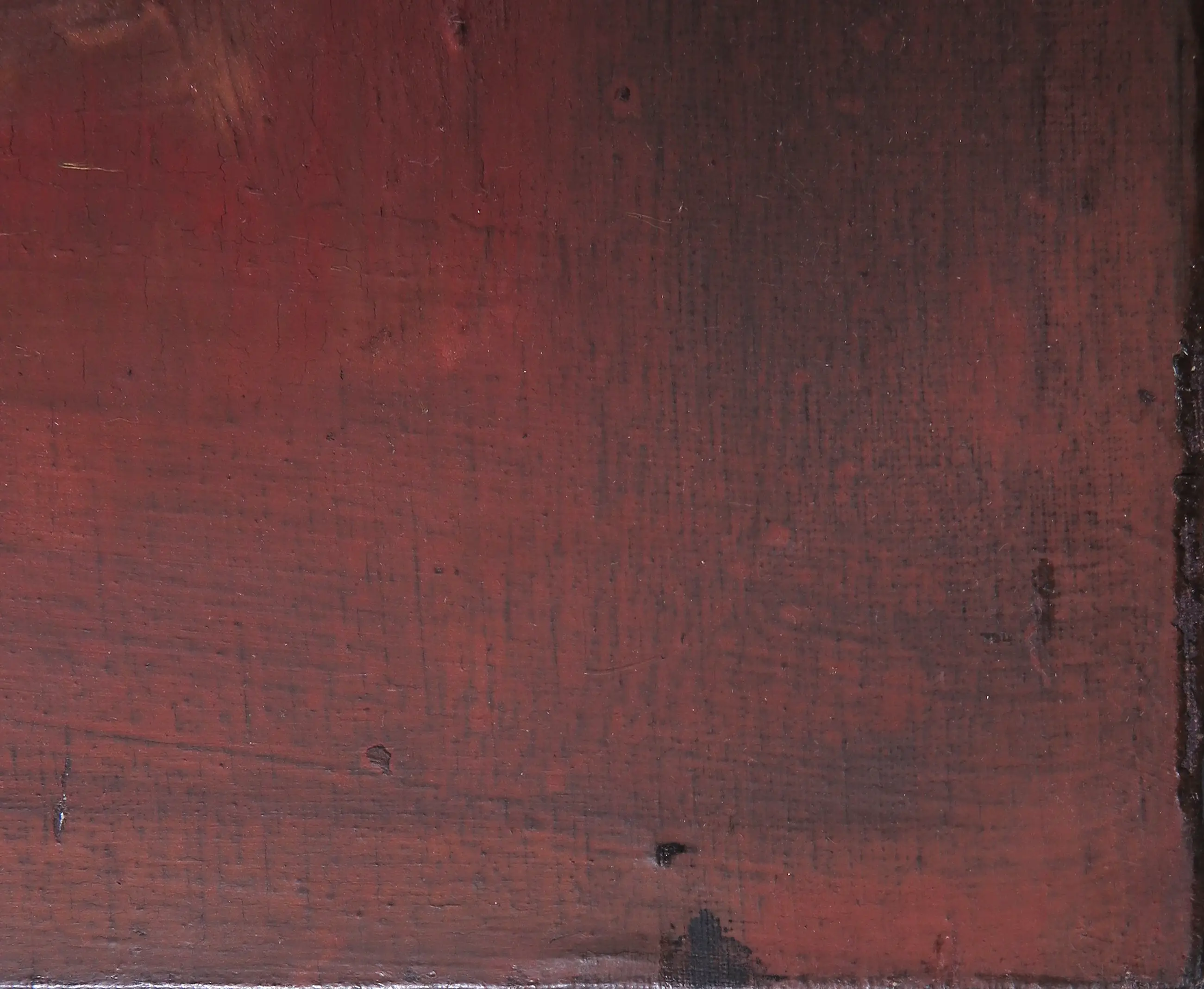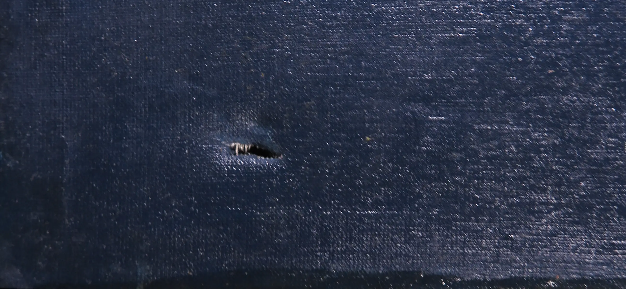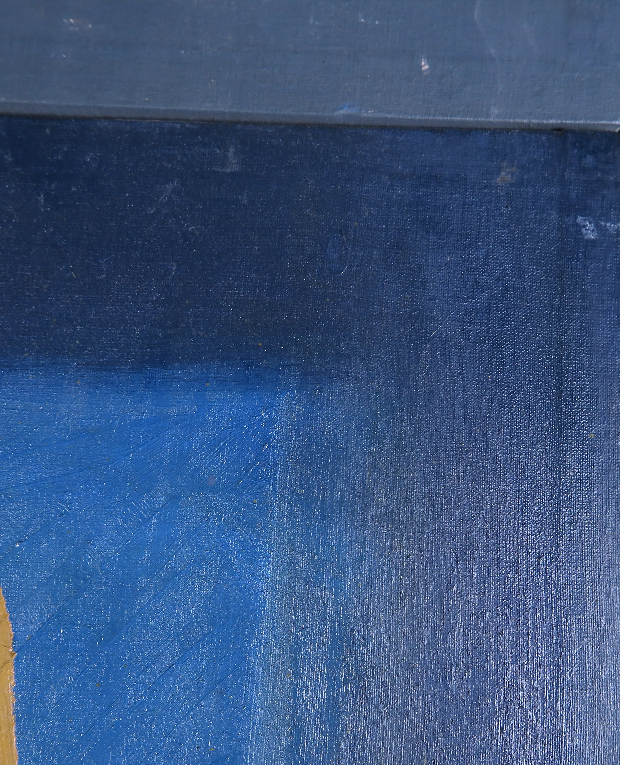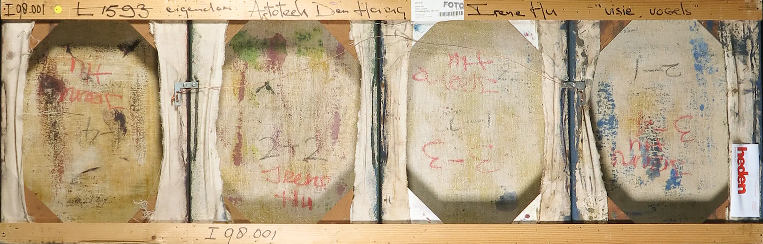 | In het tweede paneel zit linksonder een gat. Op alle panelen is verfschade te zien, vooral aan de randen van het werk. Daarnaast bevat het gehele werk hier en daar craquelé en vuil. Zie ook de detailfoto's. | |
