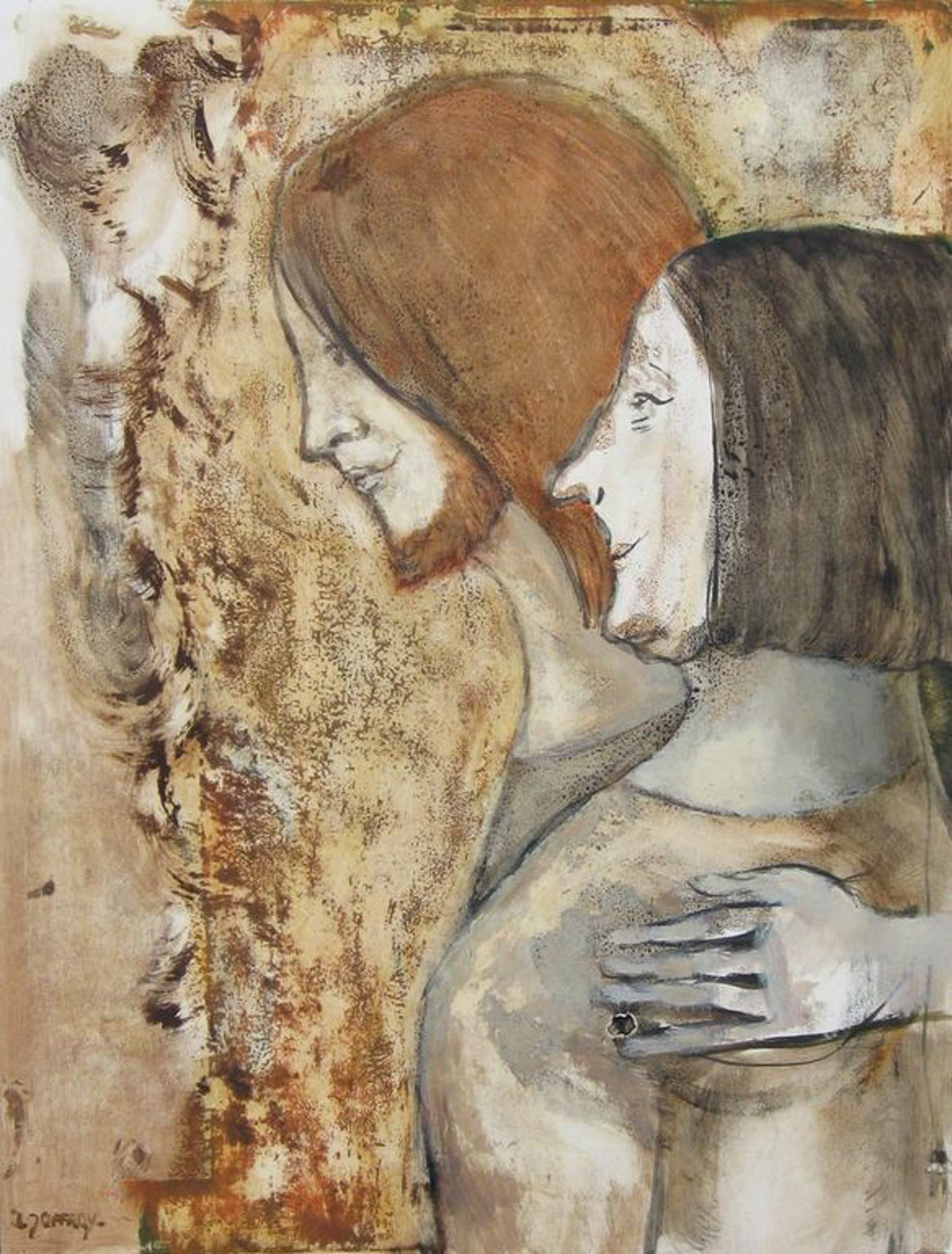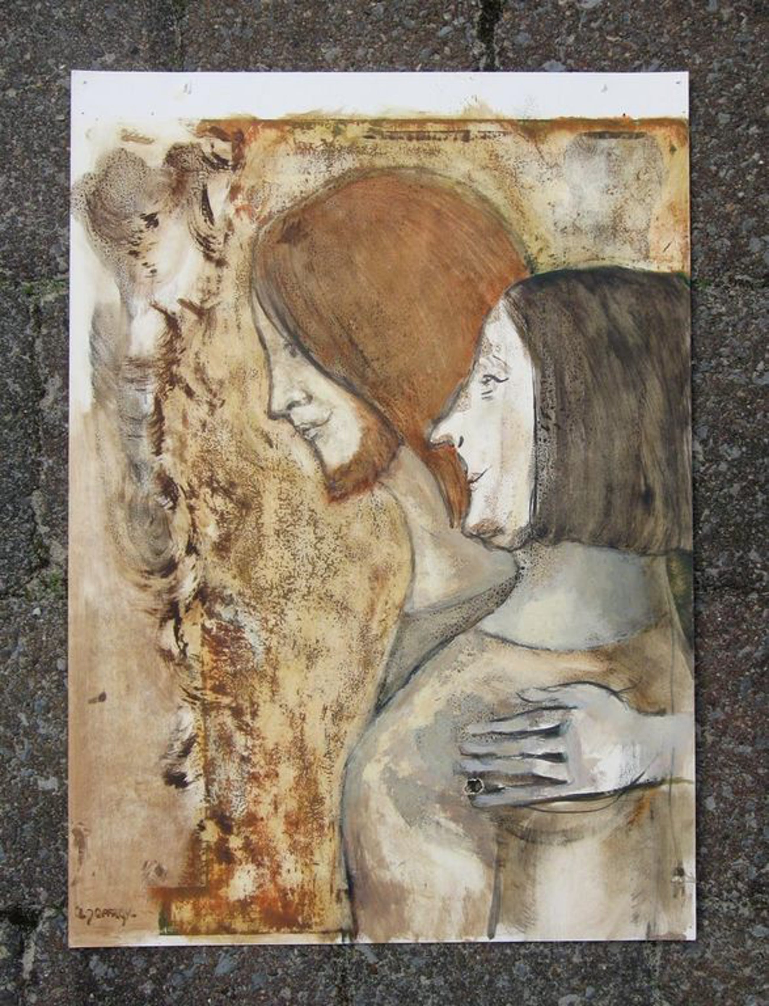 Dubbelportret en profil - Irene Joffroy - olieverf en monotype op stevig dik papier, gesigneerd l.o. Geschatte datum omstreeks 1975. Uit nalatenschap. Afm: 30 x 42 cm. Verzending NL 10,- euro; Belgie 15,- euro.