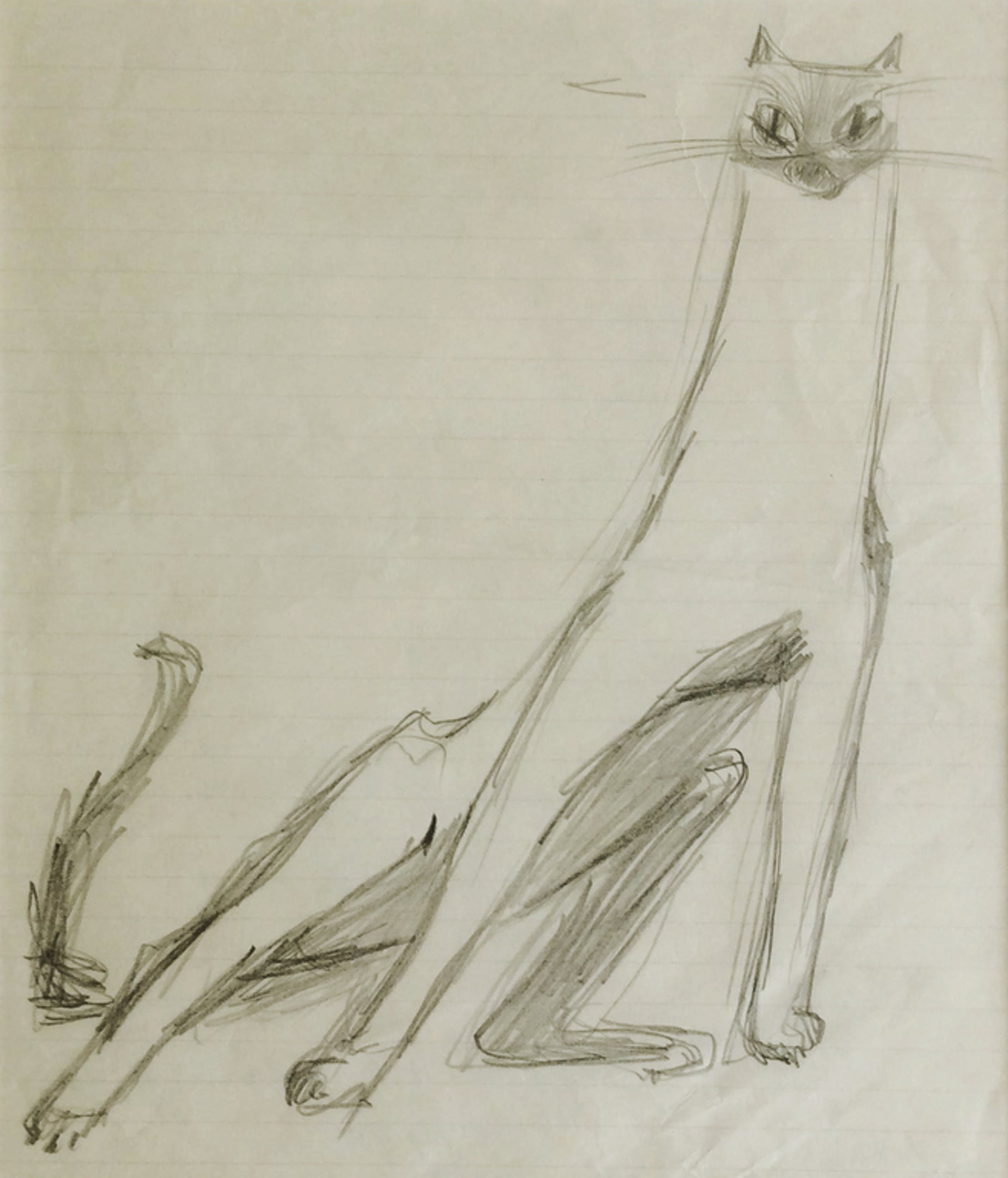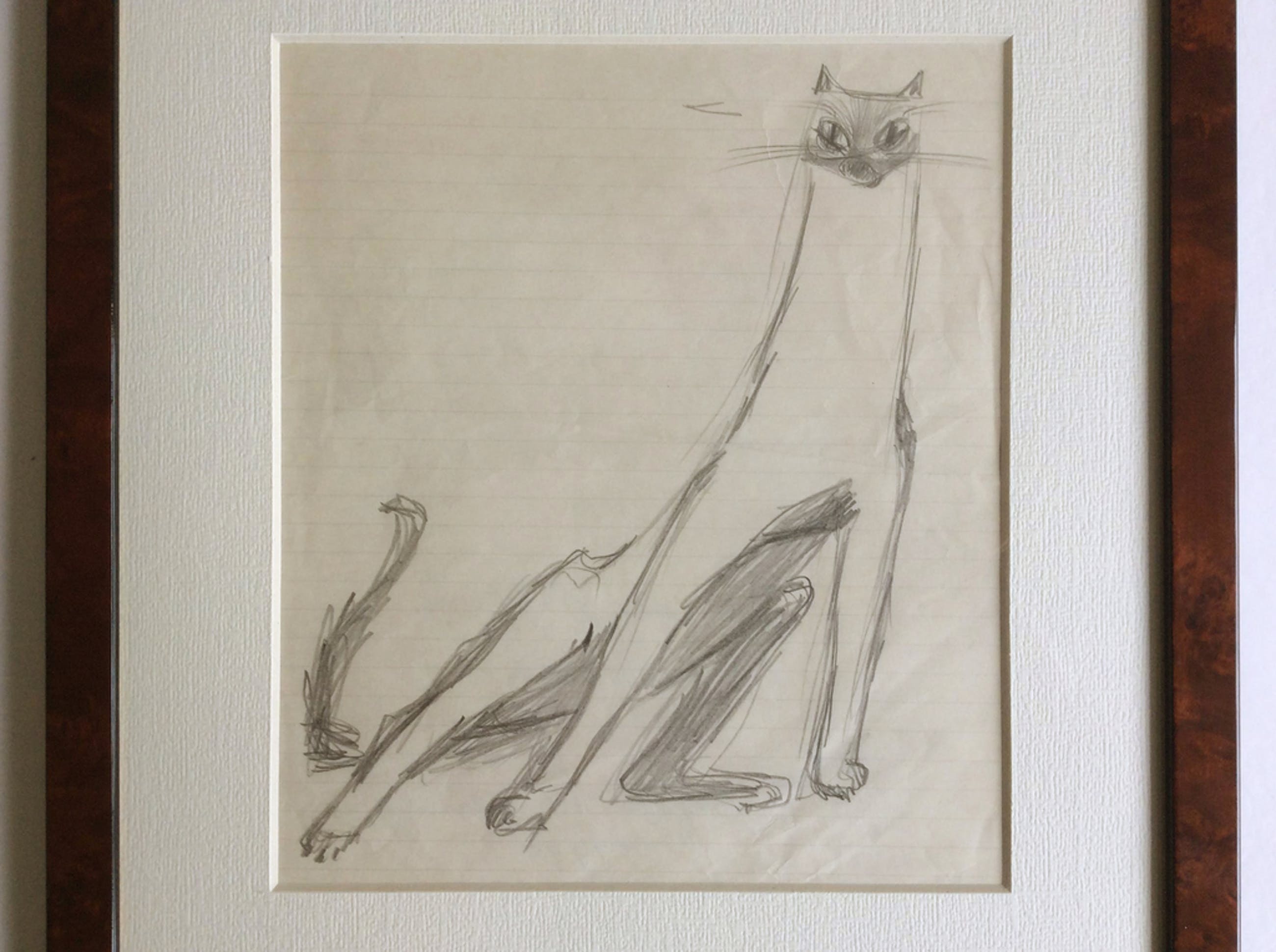 De kat - schets in potlood, voor een gelijknamig schilderij met dezelfd kat - Irene Joffroy. In fraaie gepolitoerde houten lijst. Formaat incl. 32 x 32 cm, tekening blad 20 x 24 cm. (niet gesigneerde kunstwerken van Irene Joffroy zijn meestal achterop van informatie voorzien). Uit nalatenschap van de kunstenares.