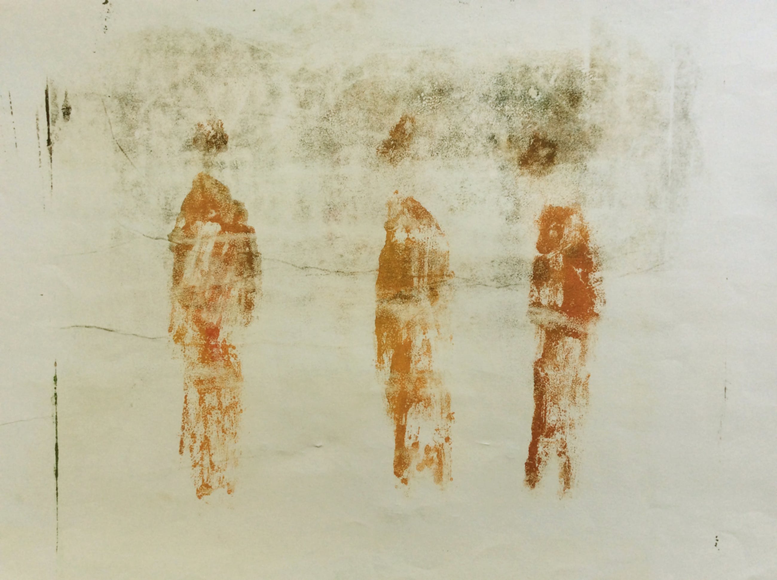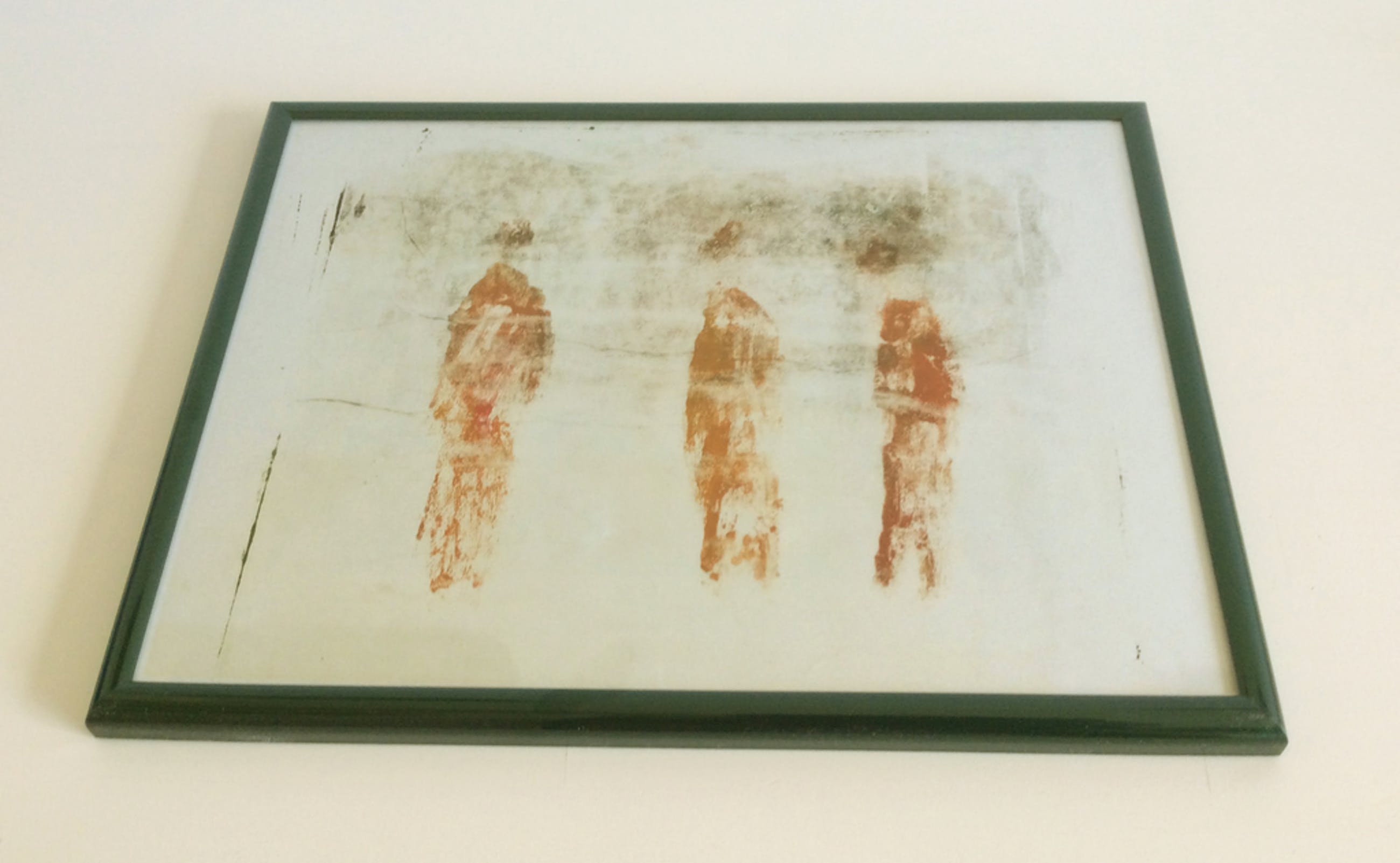 Irene Joffroy - Drie etherische figuren - olieverf op papier. In eenvoudige metalic donker groene kunststoflijst. Formaat incl. 43 x 33 cm, schilderij ca 30 x 24 cm. Niet gesigneerd, zoals zo vaak bij de kunstwerken op papier van Irene Joffroy (Maastricht 1923-2011).