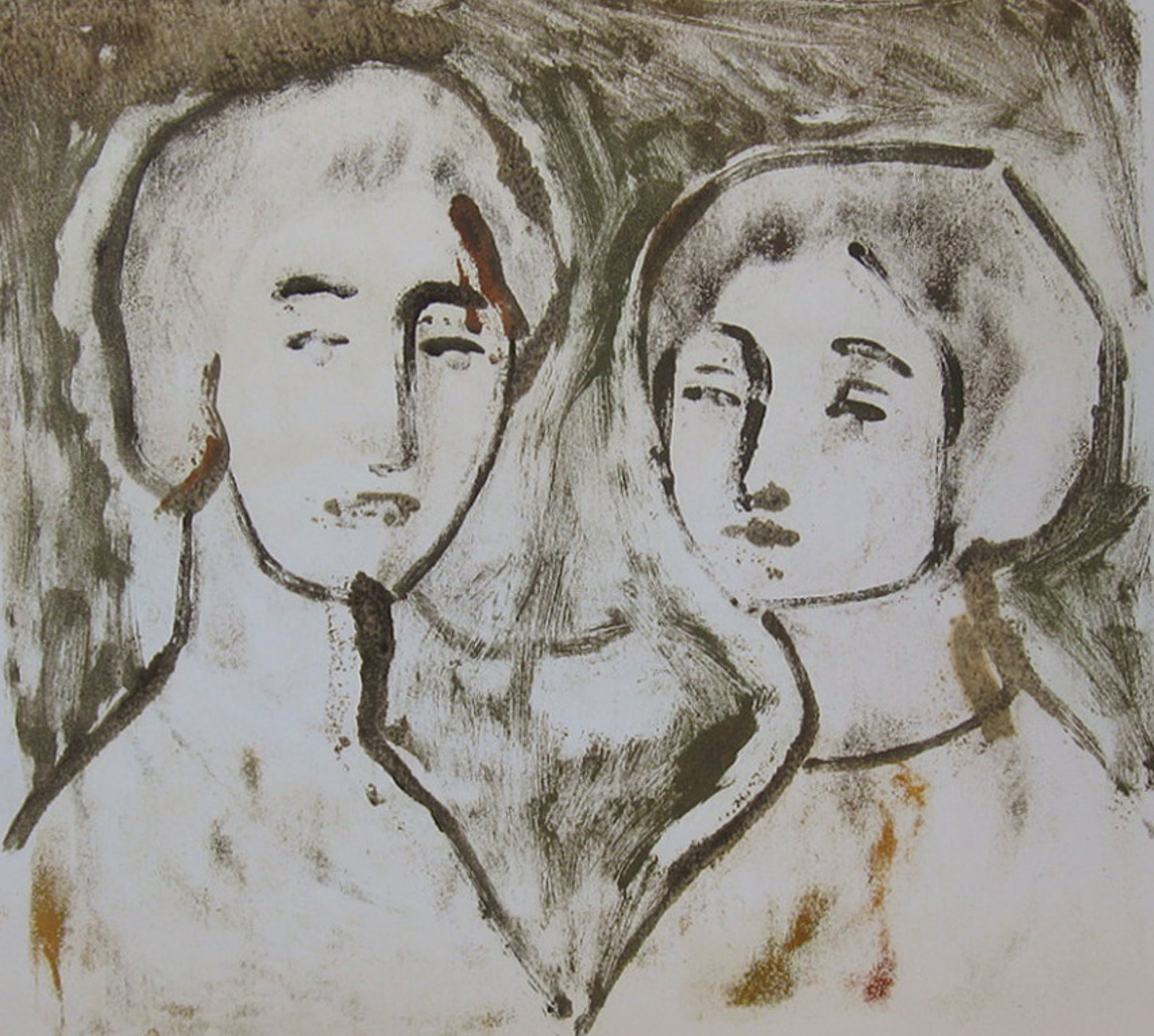 Van de Limburgse kunstenares Irene Joffroy: DUBBELPORTRET. Niet gesigneerd, gedateerd rond 1970. Uit nalatenschap. Afm. blad: 50 x 32 cm, afm. schildering 32 x 30 cm. Verzending NL 10,- Belgie 15,-