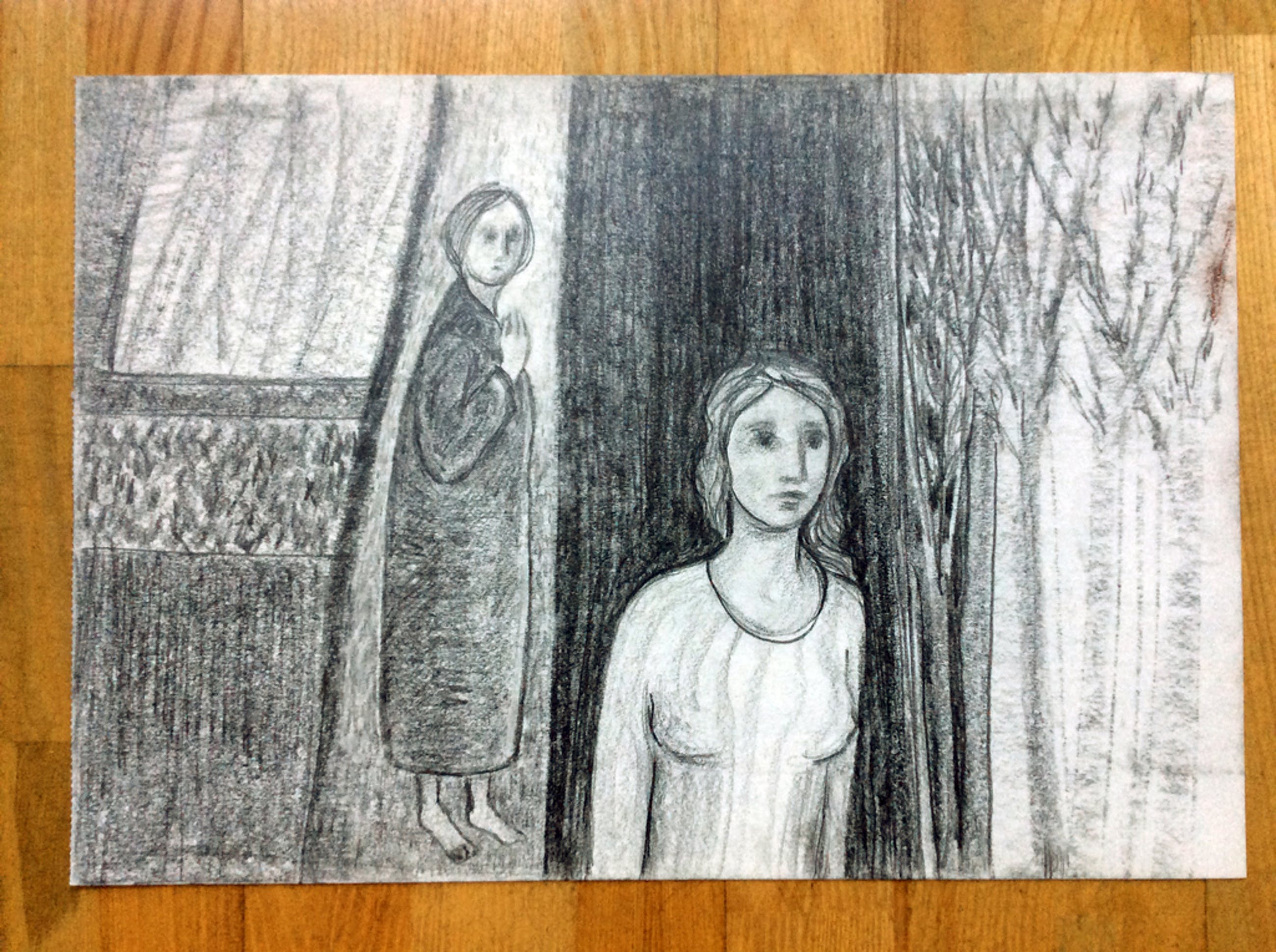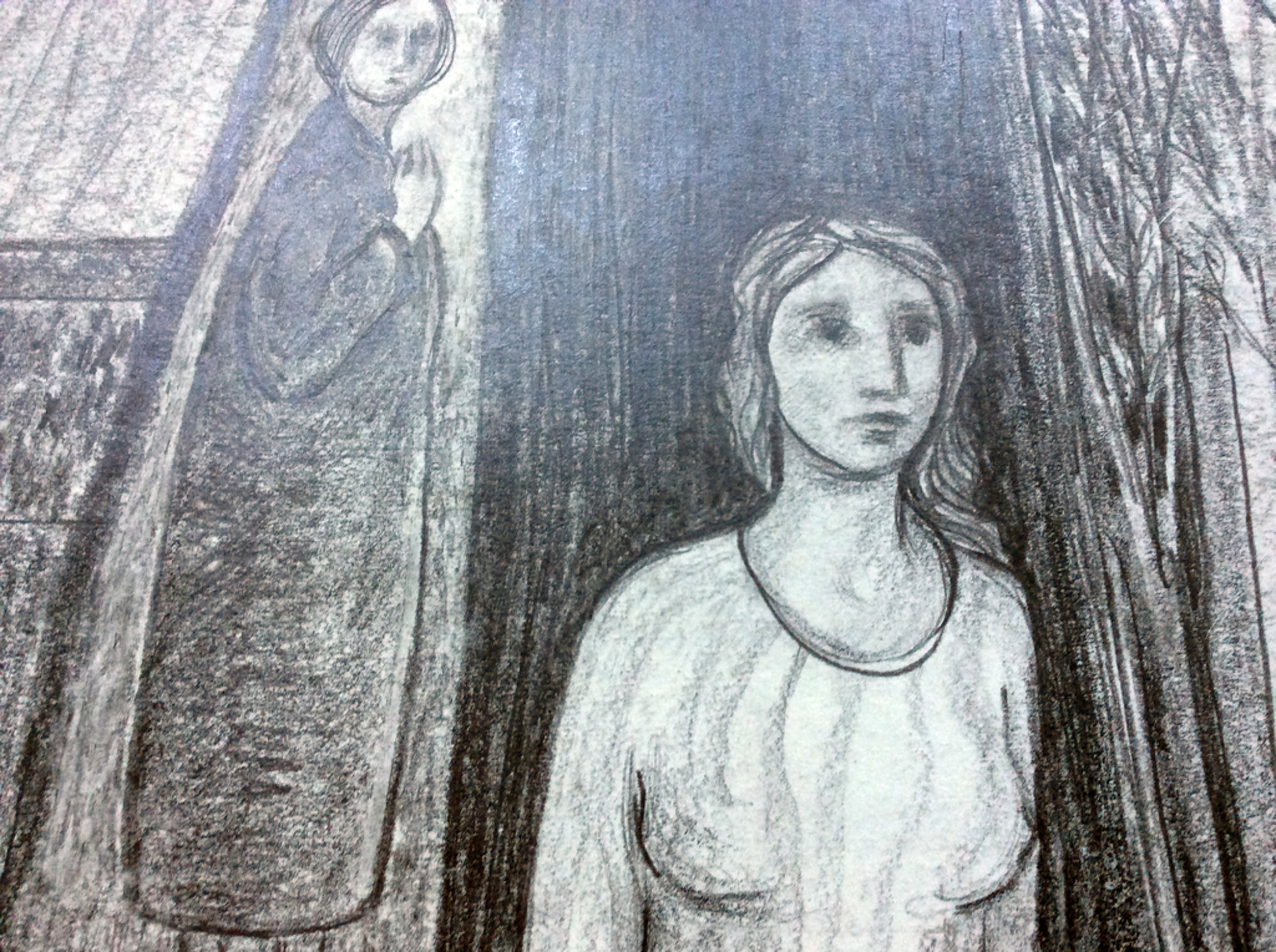 Irene Joffroy: Twee vrouwen. Potloodtekening op stevig papier. Niet gesigneerd, uit nalatenschap van de kunstenares. Formaat incl. 45 x 32 cm.