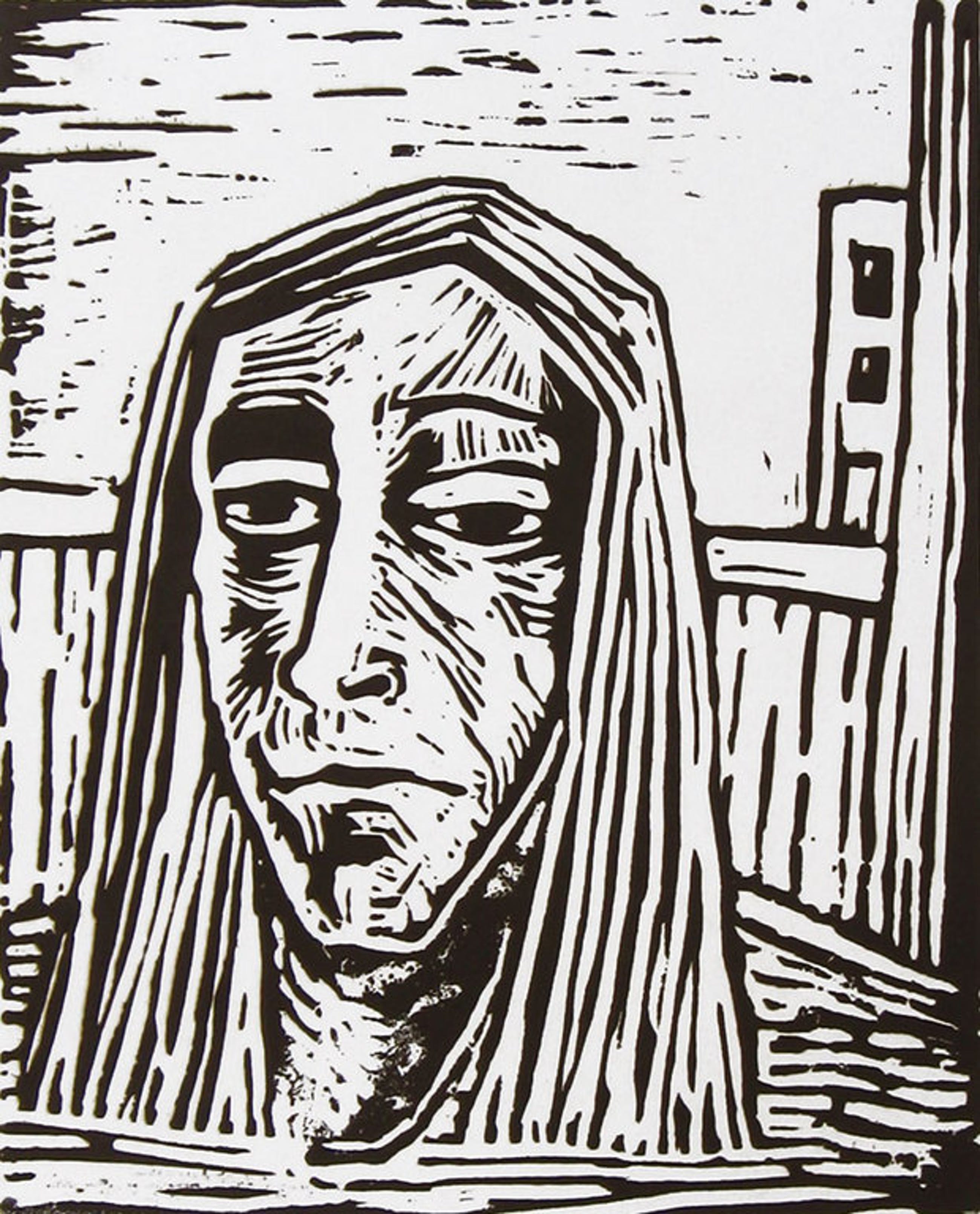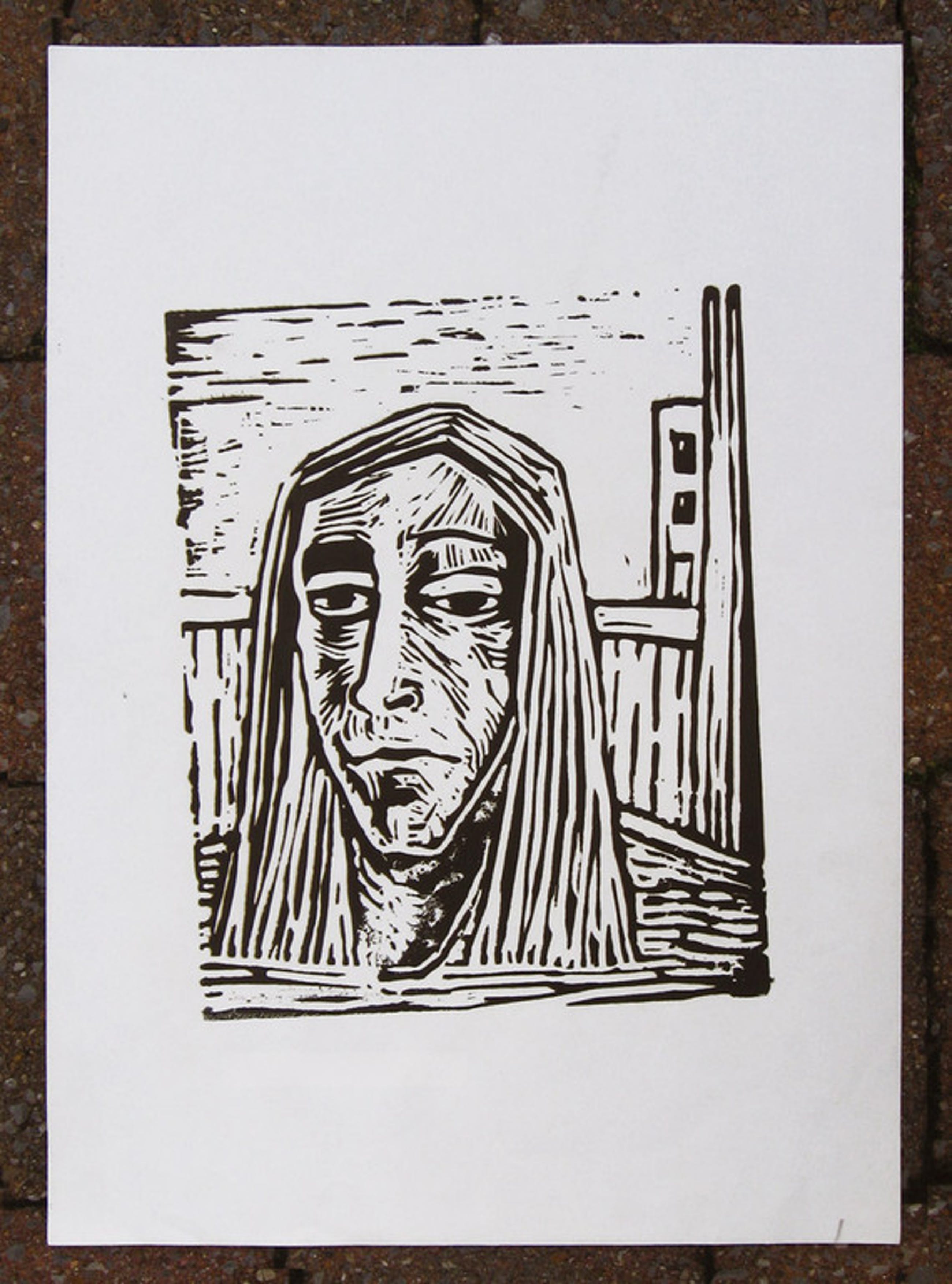 Irene Joffroy: Vrouw. Linodruk in kleine oplage. Niet gesigneerd, uit nalatenschap van de kunstenares. Formaat incl. 30 x 42 cm, druk 19 x 24 cm.