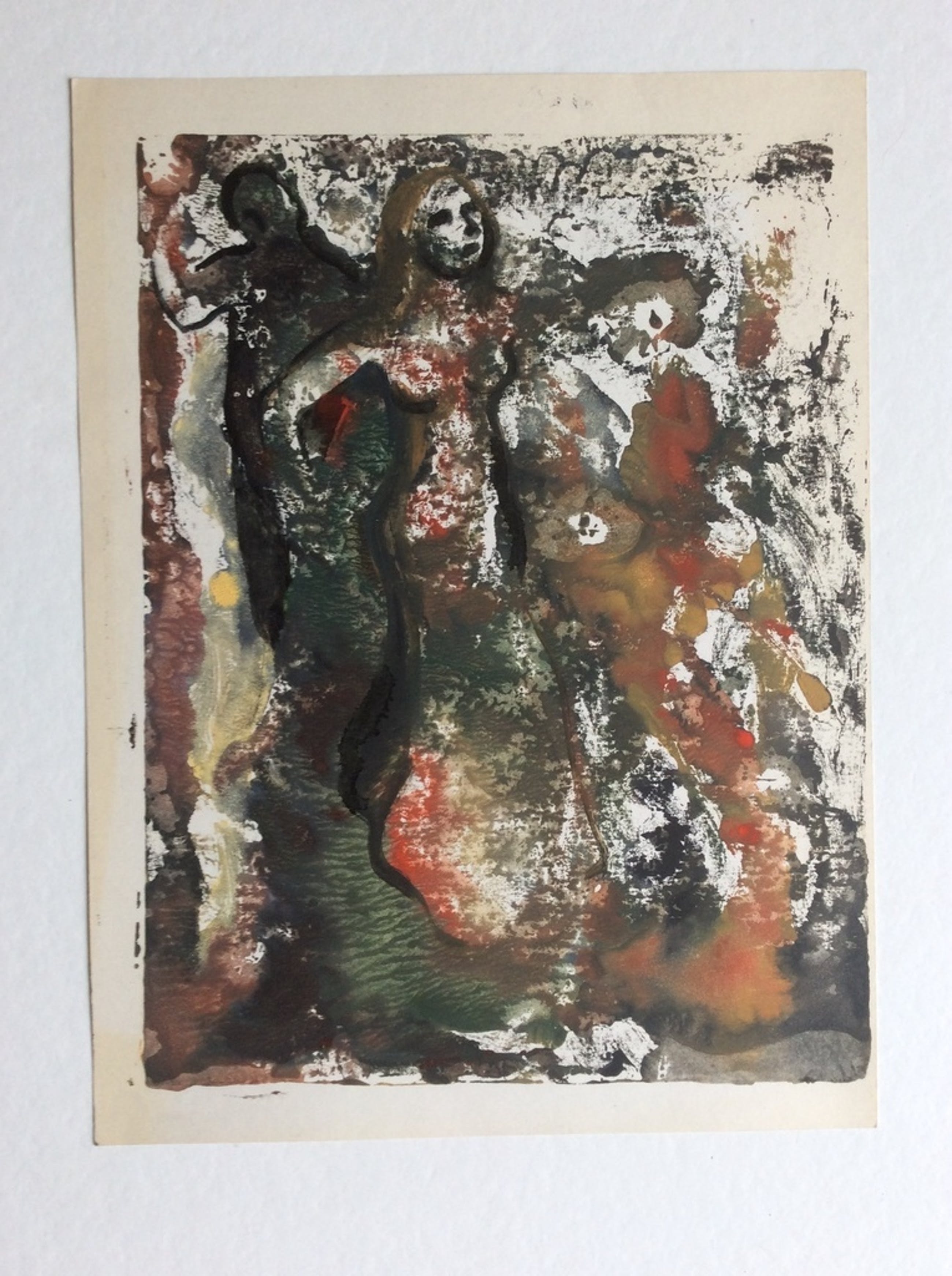 origineel werk op papier van Irene Joffroy: scene met figuren. Olieverf op papier, niet gesigneerd, uit nalatenschap van de kunstenares. Ca. 1970. Formaat incl. 29 x 39 cm