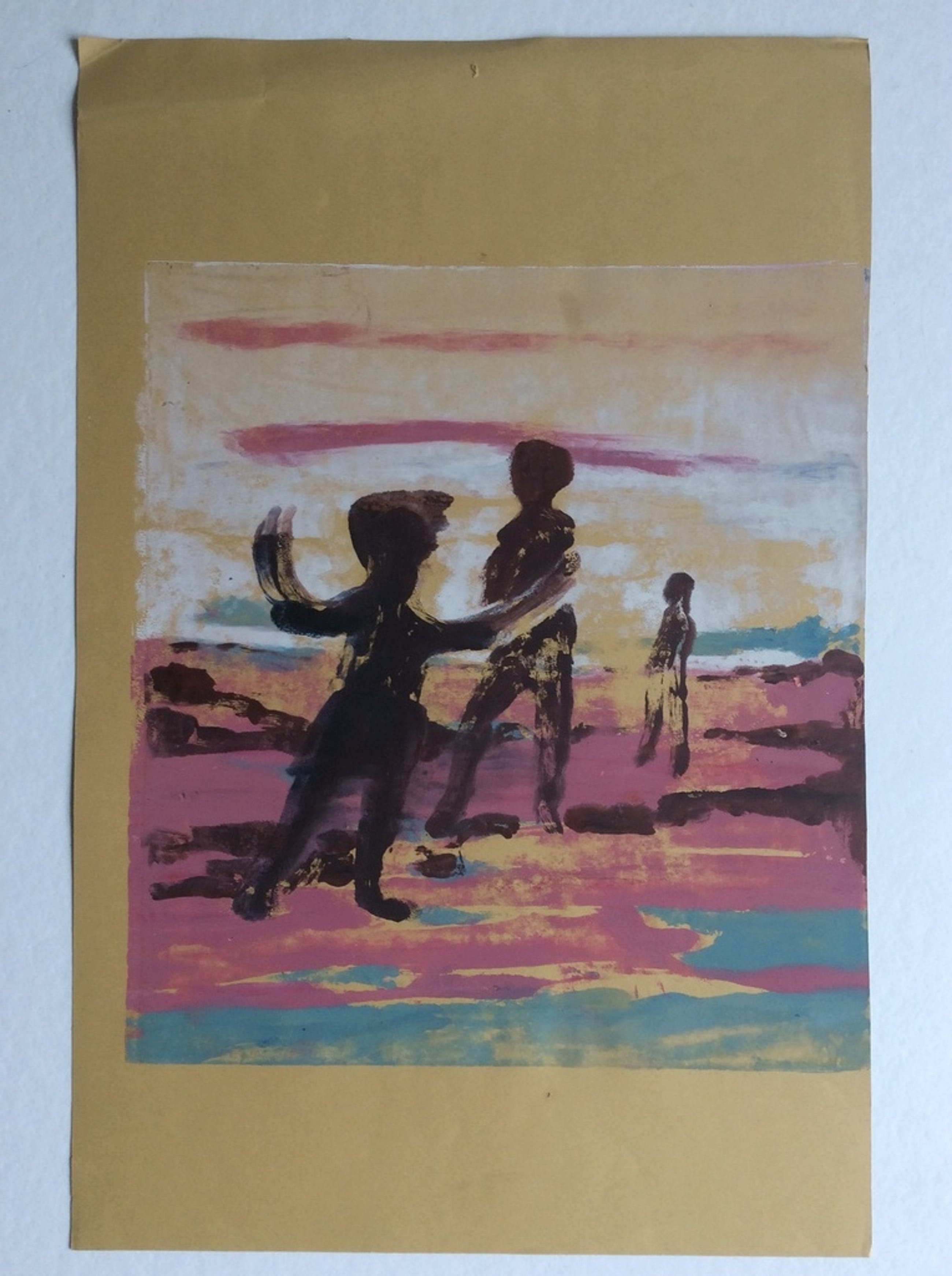 origineel werk op papier van Irene Joffroy: scene met figuren. Olieverf op papier, niet gesigneerd, uit nalatenschap van de kunstenares. Ca. 1970. Formaat incl. 32 x 50 cm