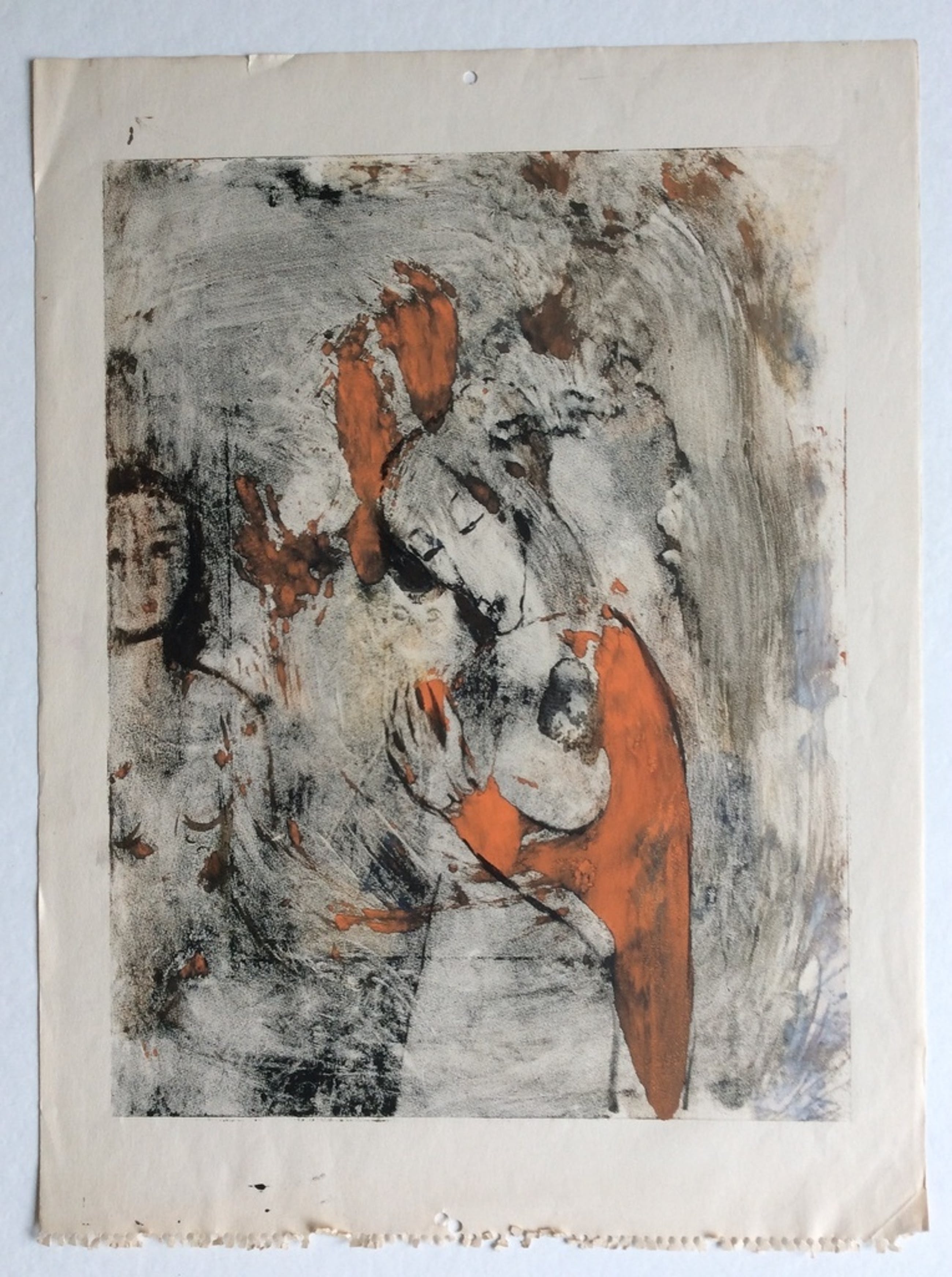 origineel werk op papier van Irene Joffroy: scene met figuren. Olieverf op papier, niet gesigneerd, uit nalatenschap van de kunstenares. Ca. 1970. Formaat incl. 35 x 48 cm
