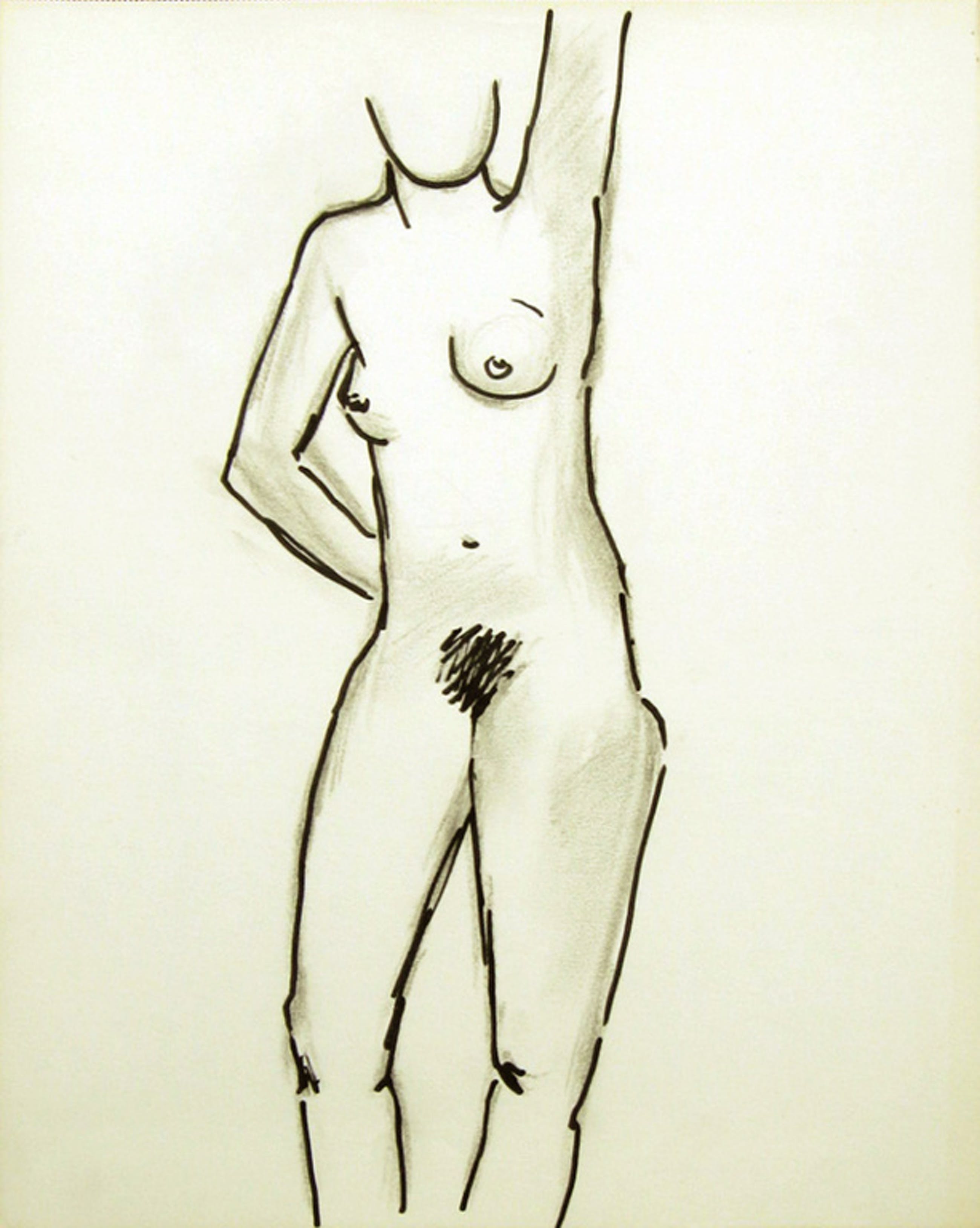 Irene Joffroy: Staand vrouwelijk naakt. Pen en potlood op papier, blad uit schetsboek. Datering ca. '65. Uit de nalatenschap van de kunstenares. Info achter op label. Afm. blad: 32 x 39,5 cm. Verzending NL 10,- euro, Belgie 15,- euro