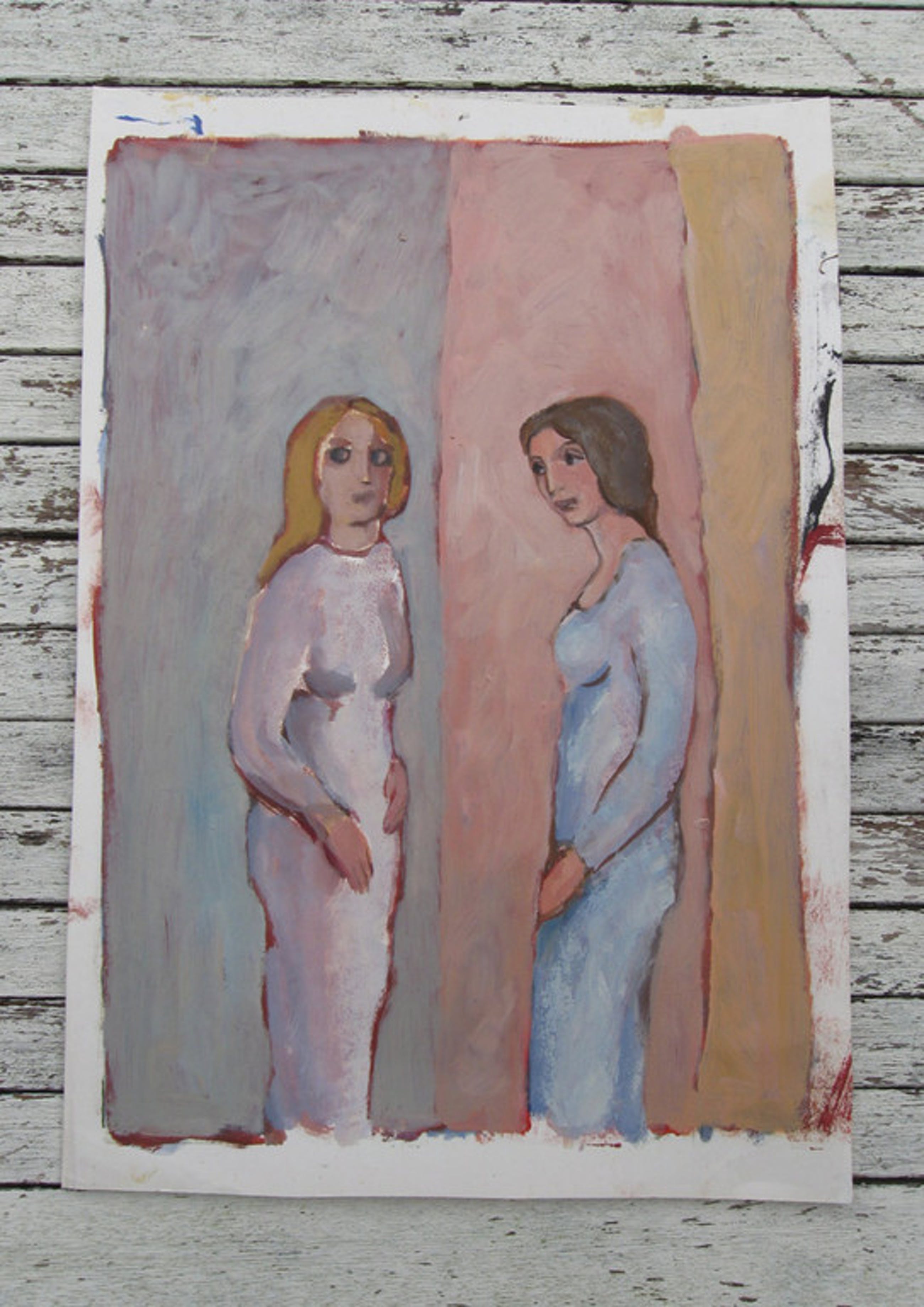 Prachtig dubbelportret Twee Vrouwen van de Limburgse kunstenares Irene Joffroy (1923-2011). Olieverf op papier. Afm. blad: ca. 26,5 x 36,5. Formaat schildering: ca. 23 x 32 cm. Niet gesigneerd, uit nalatenschap van de kunstenares. Omstreeks 1970. Verzending NL 10,- Belgie 15,-