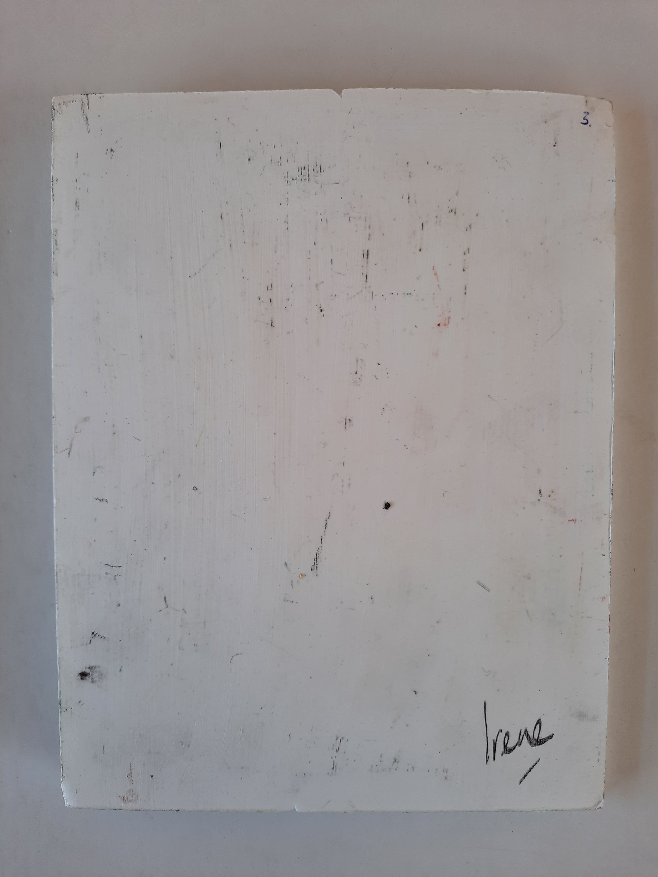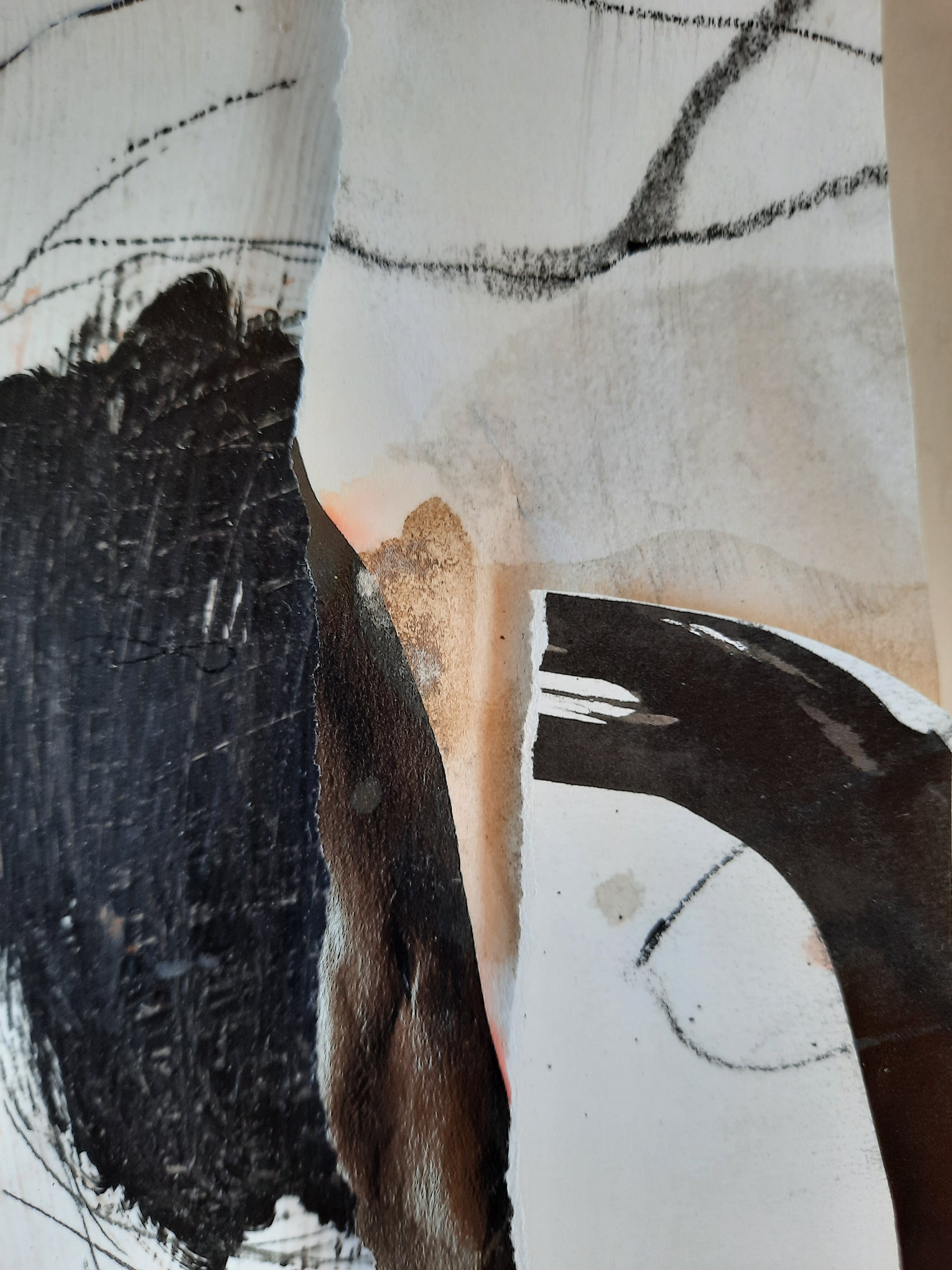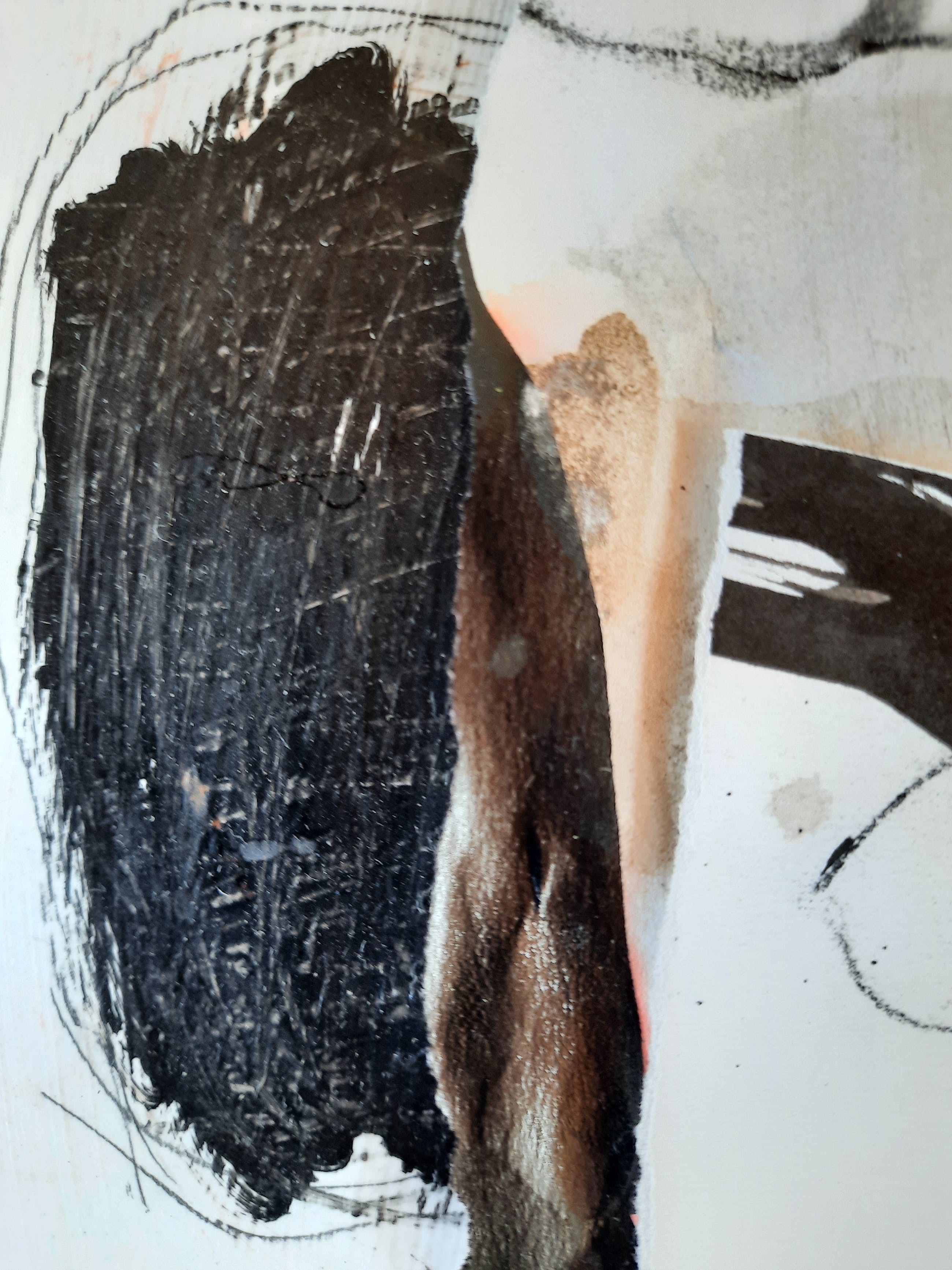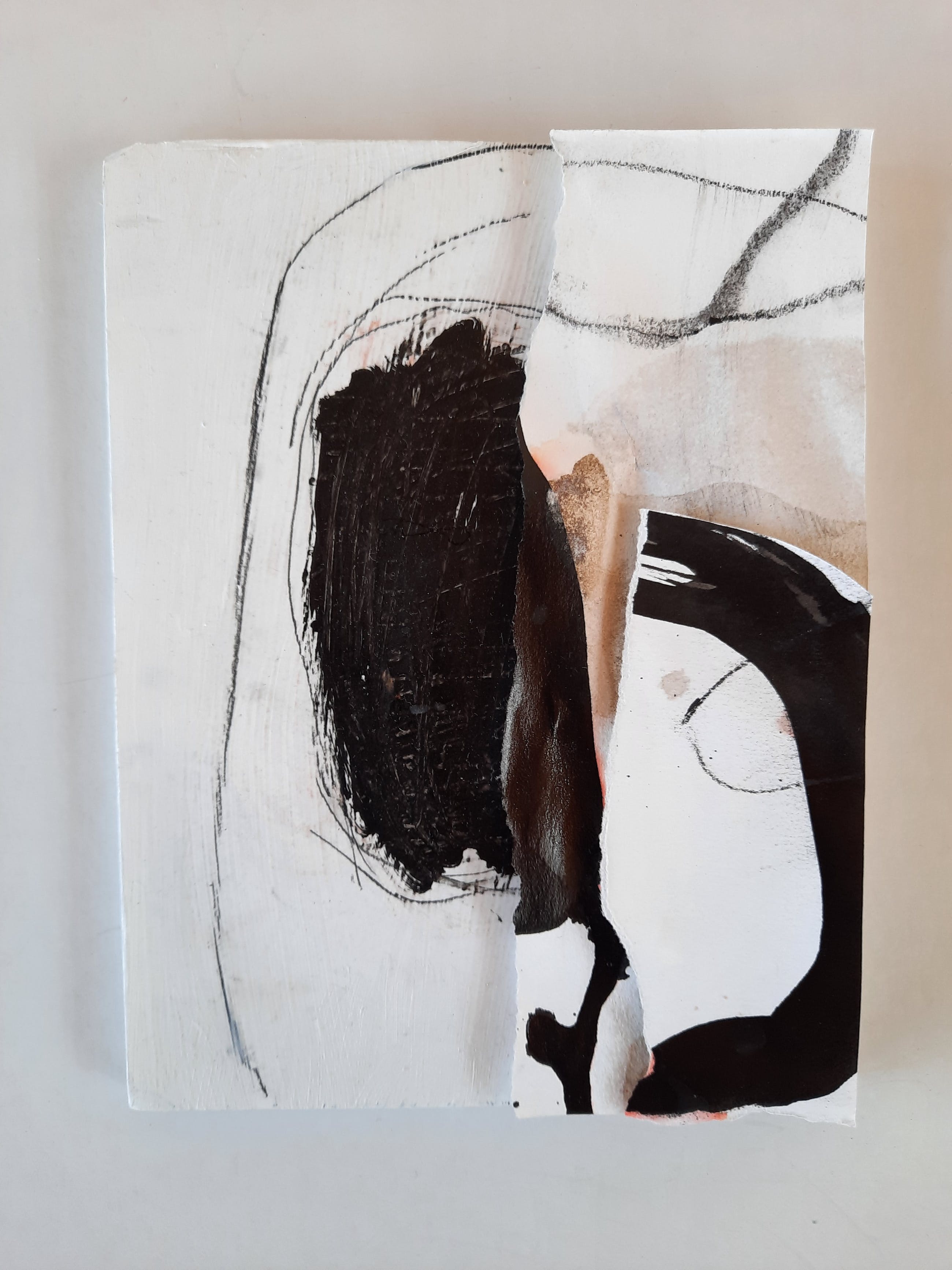 Kop. ( vrije variatie) Op foamboard in mixed media techniek: collage, inkt, verf.