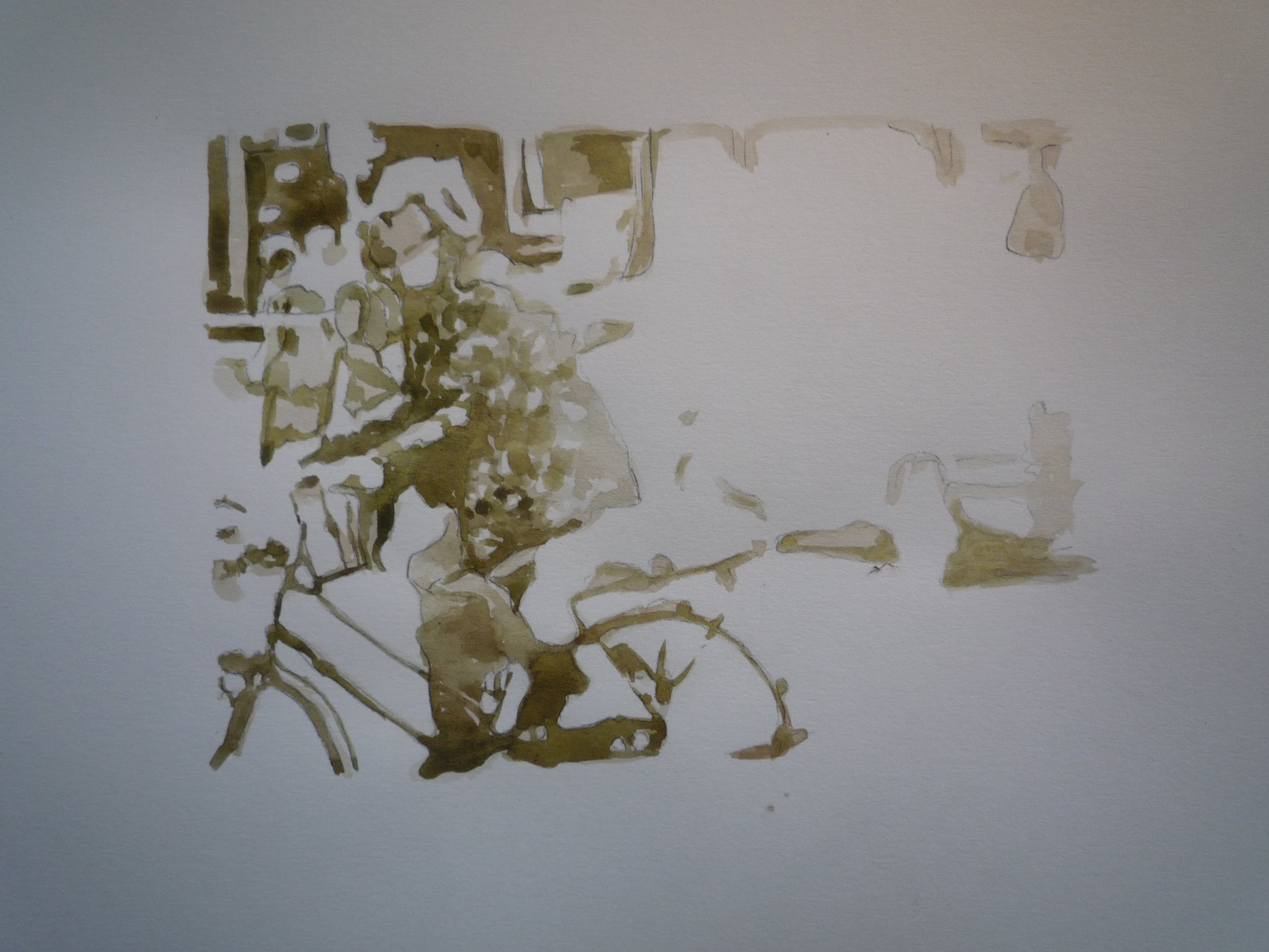 Aquarel van een fietser in de regen in de hoofdstad. Gemaakt tijdens een artist in residency in Amsterdam Slotermeer in januari 2018 bij AtelierOpen van Edith Brouwer.