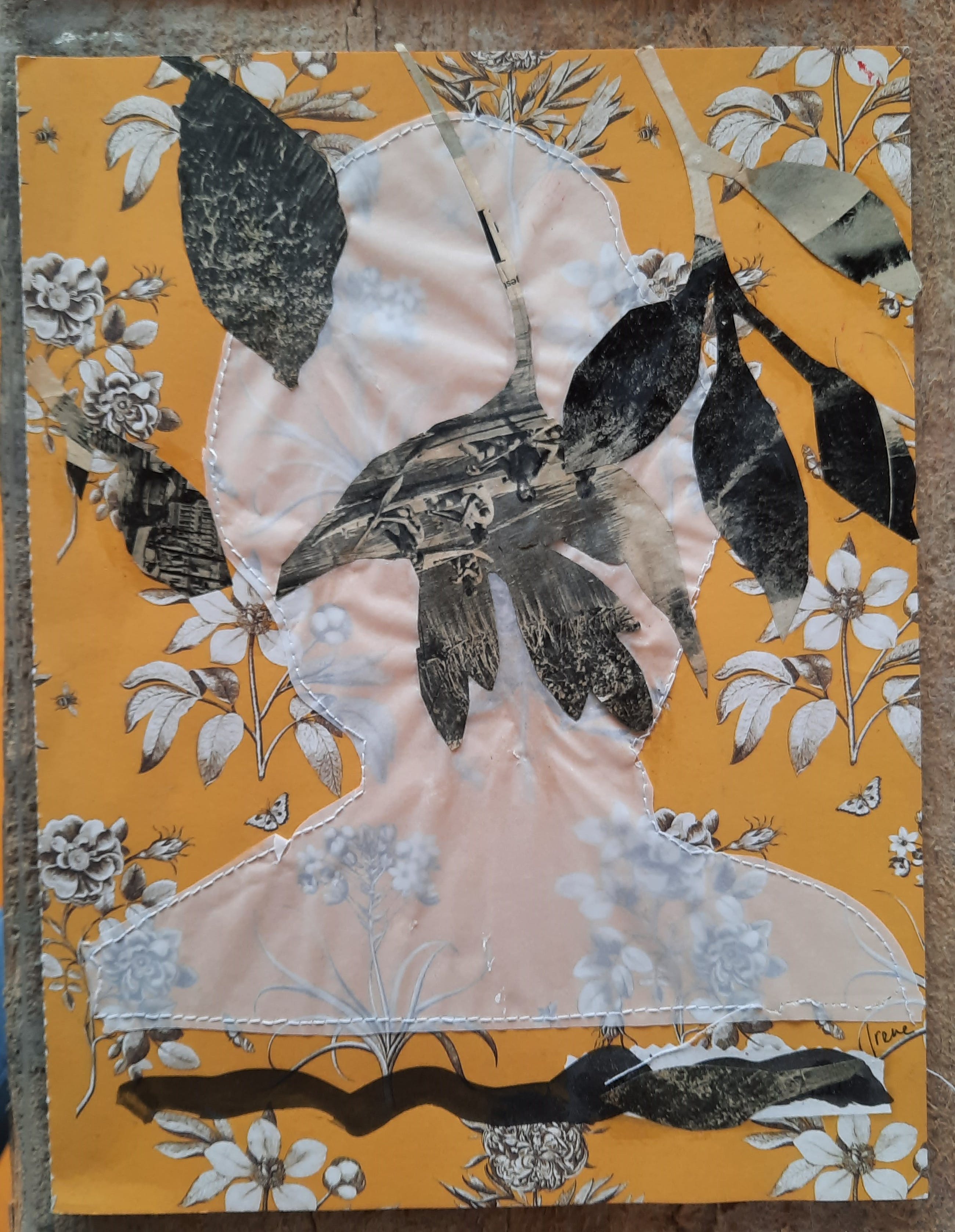 Silhouet van een kop van transparant papier. Genaaid op papier met de naaimachine. Collage op gedessineerd papier van plant en bloemmotieven. Inkt.