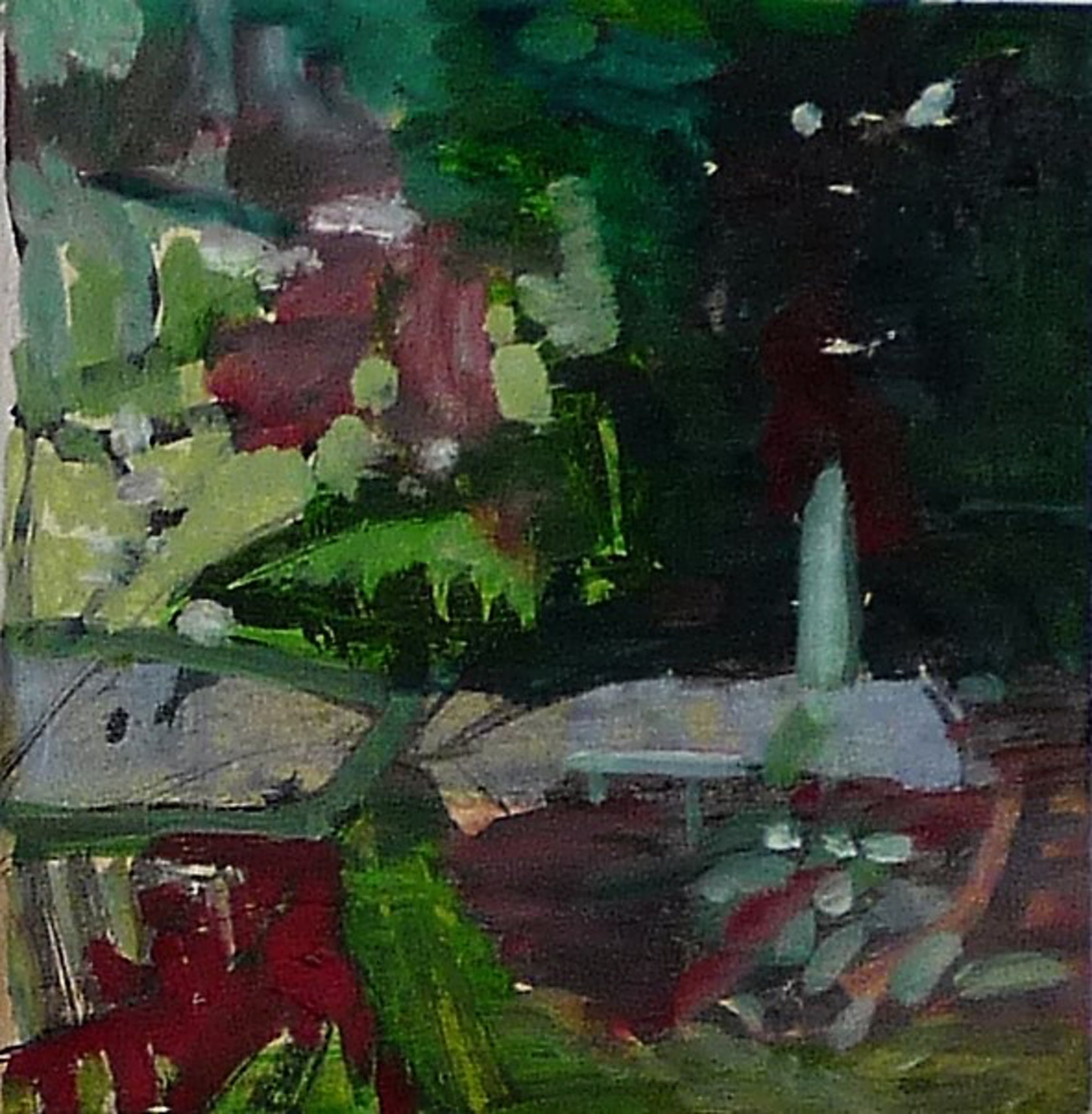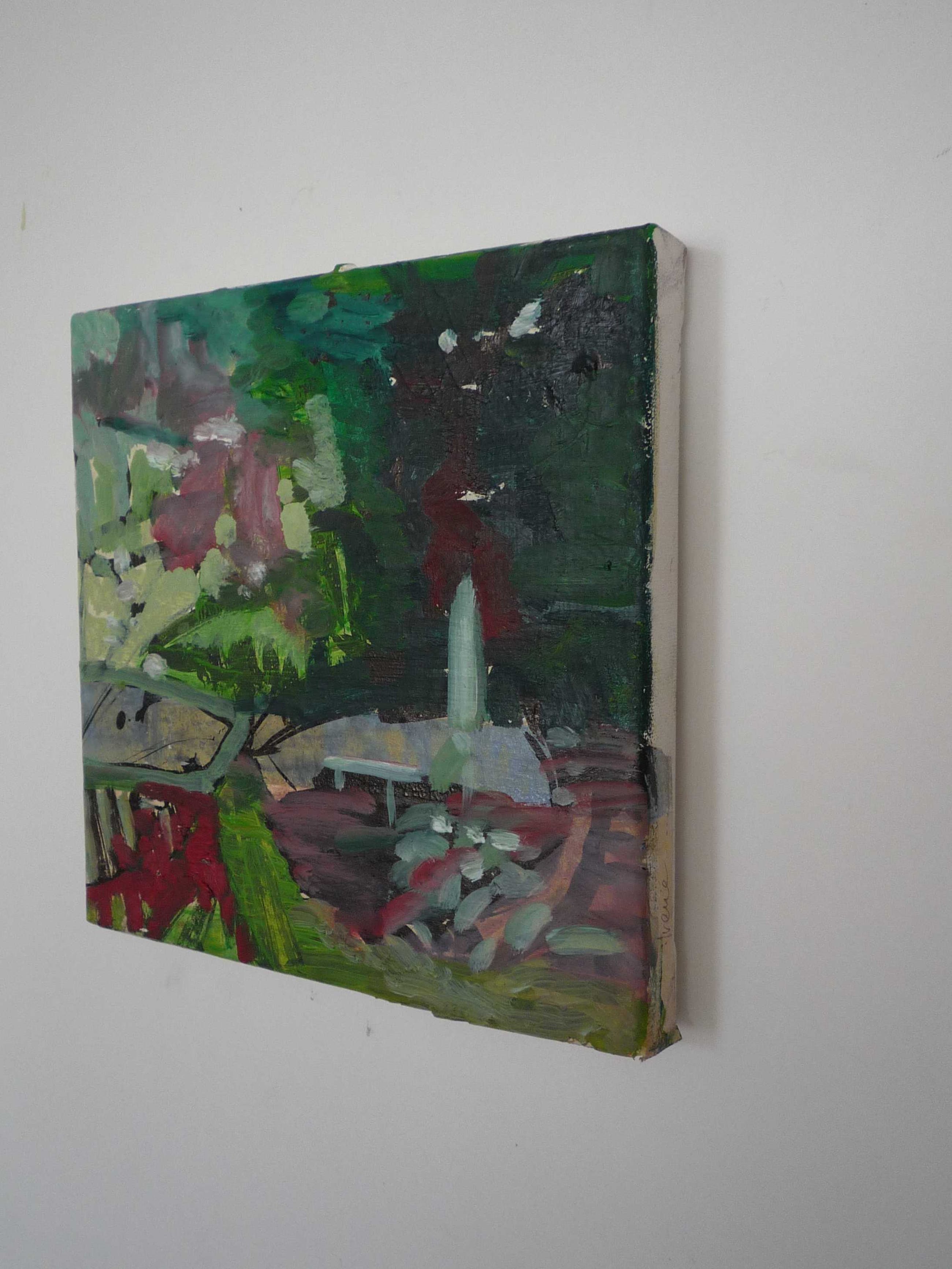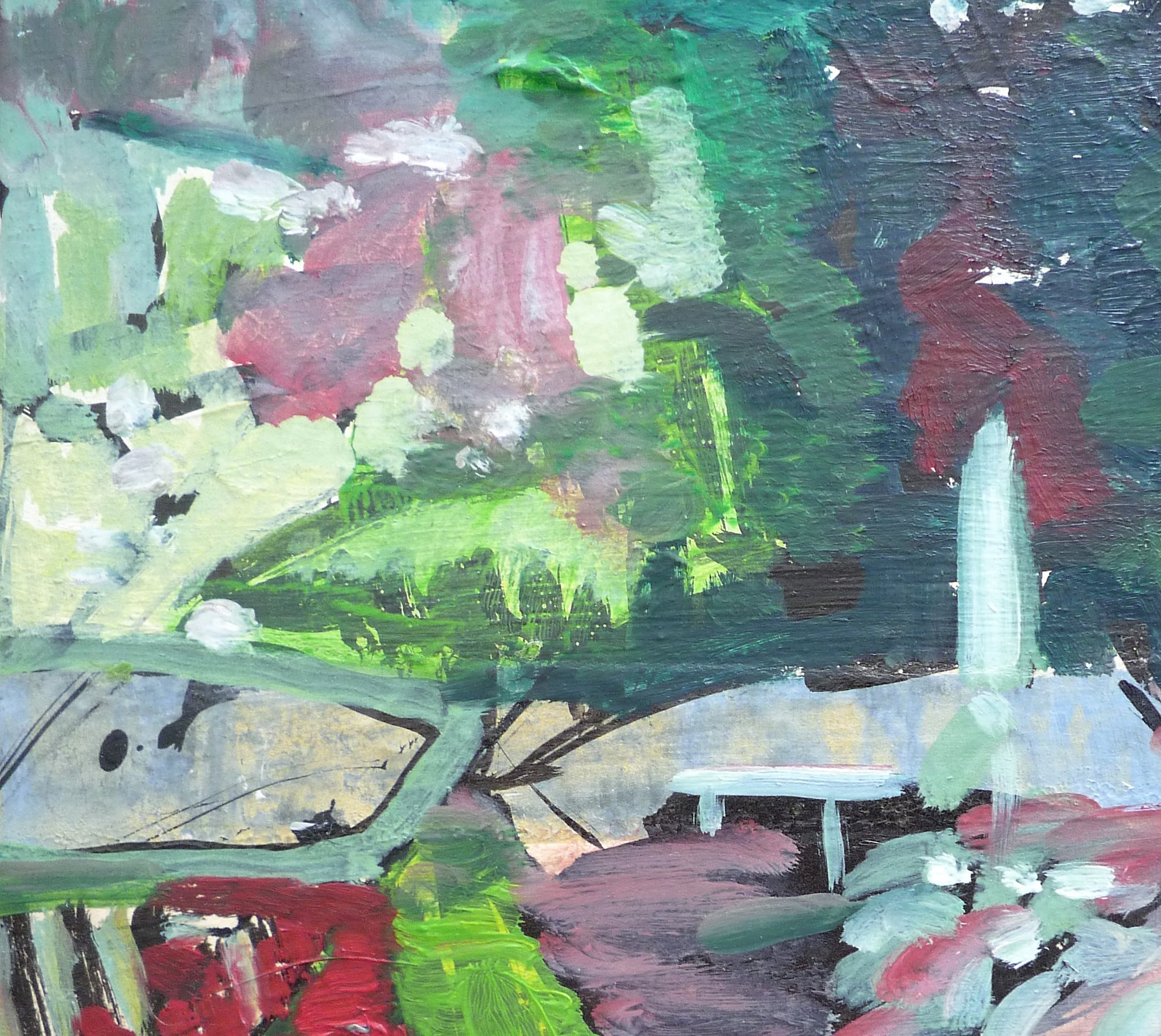 Vorige jaar was ik als artist in residence op het landgoed Oosterhouw te Leens, NO Groningen. Ik heb toen veel studies, foto's en schilderijen gemaakt van de aangelegde tuin in 19e eeuwse landschapsstijl. Het was een heel mooie periode die me veel heeft opgeleverd aan grote en kleine schilderijen. Dit is er een van.