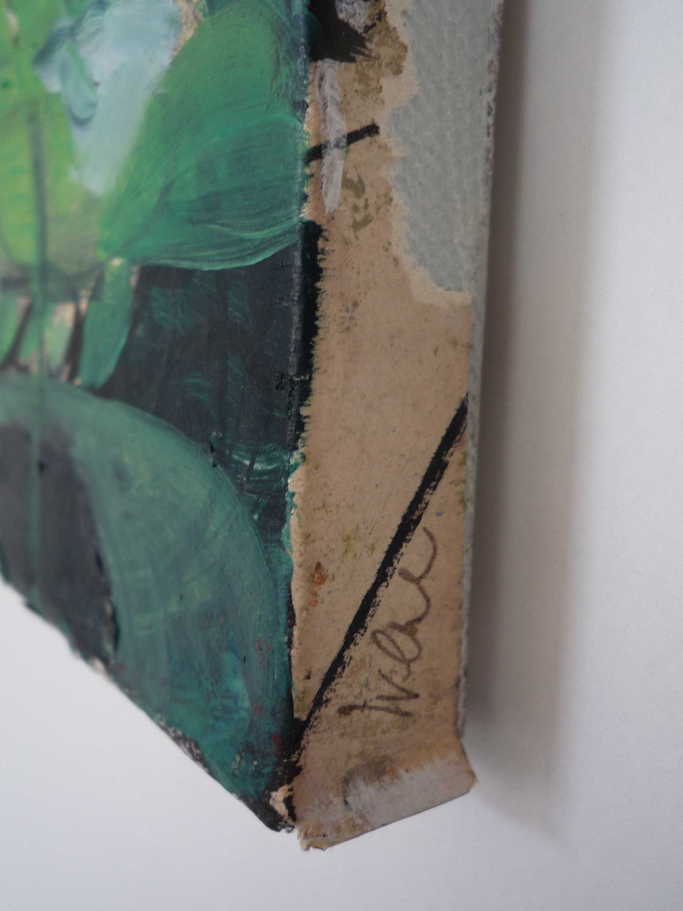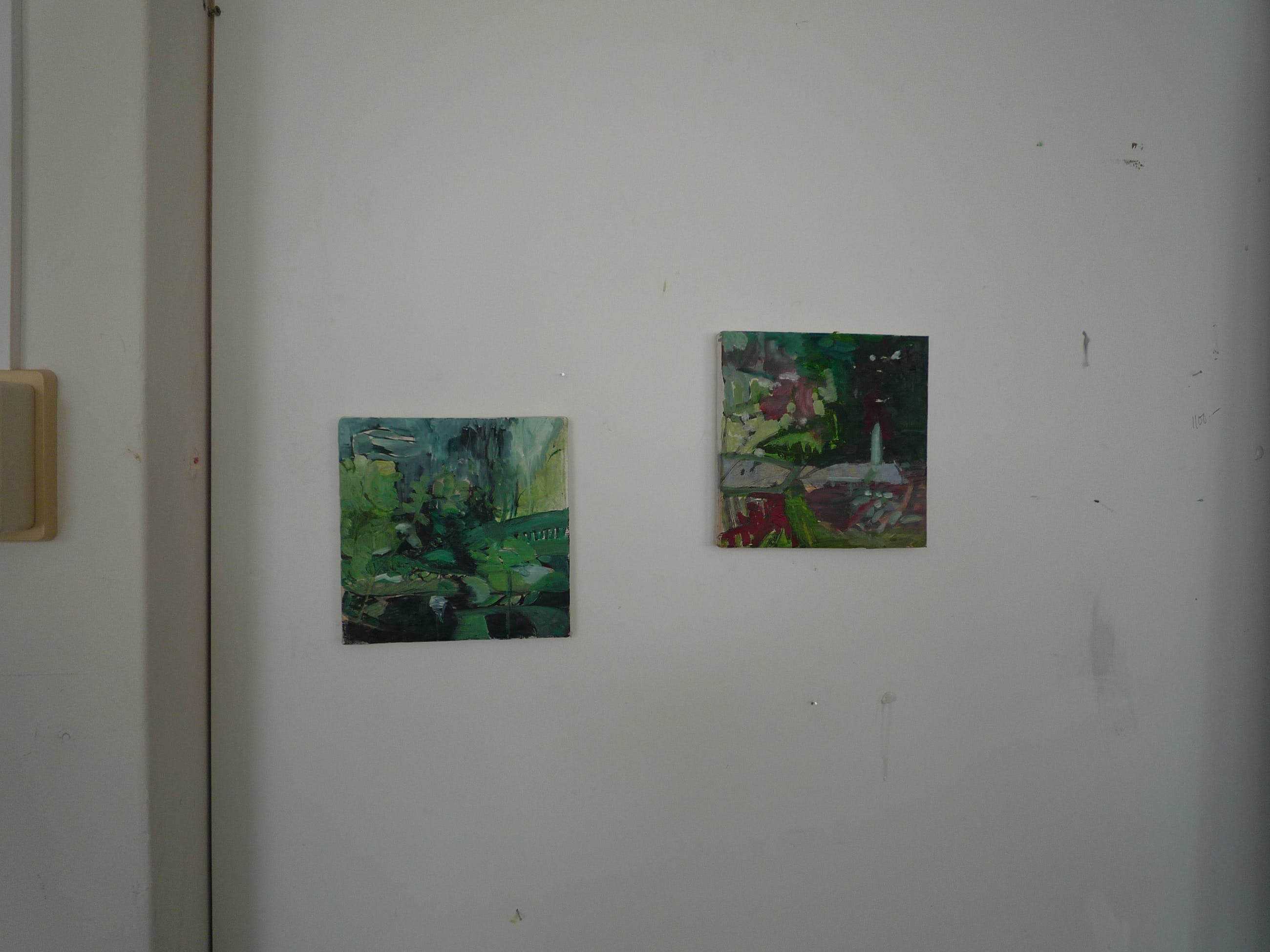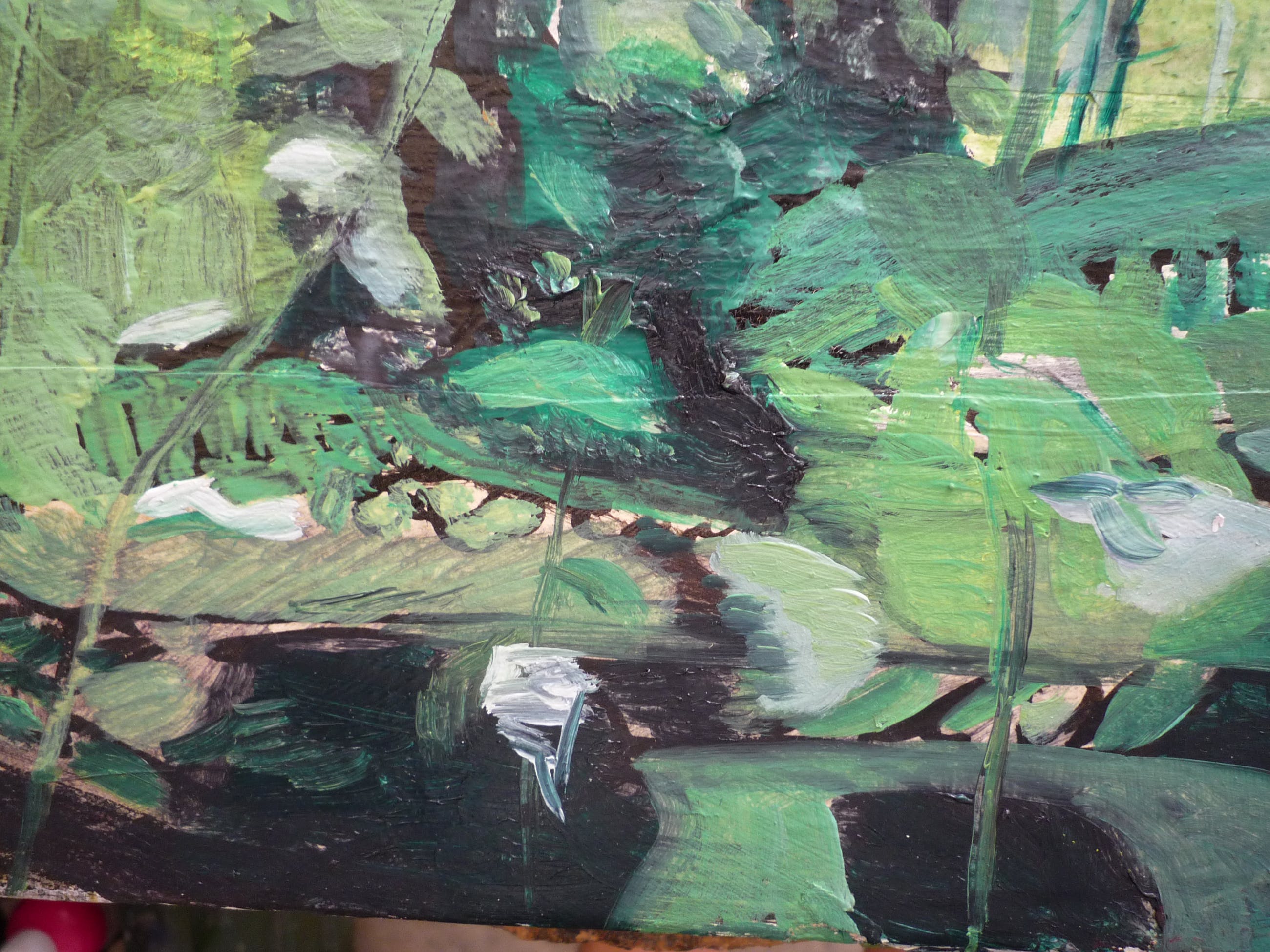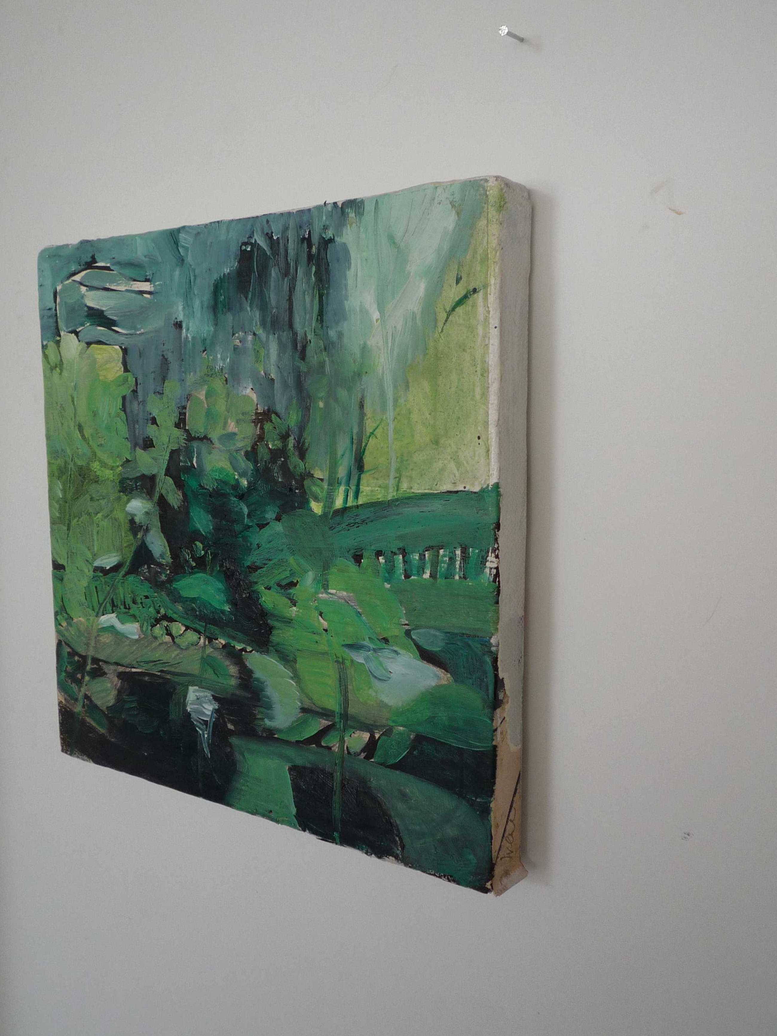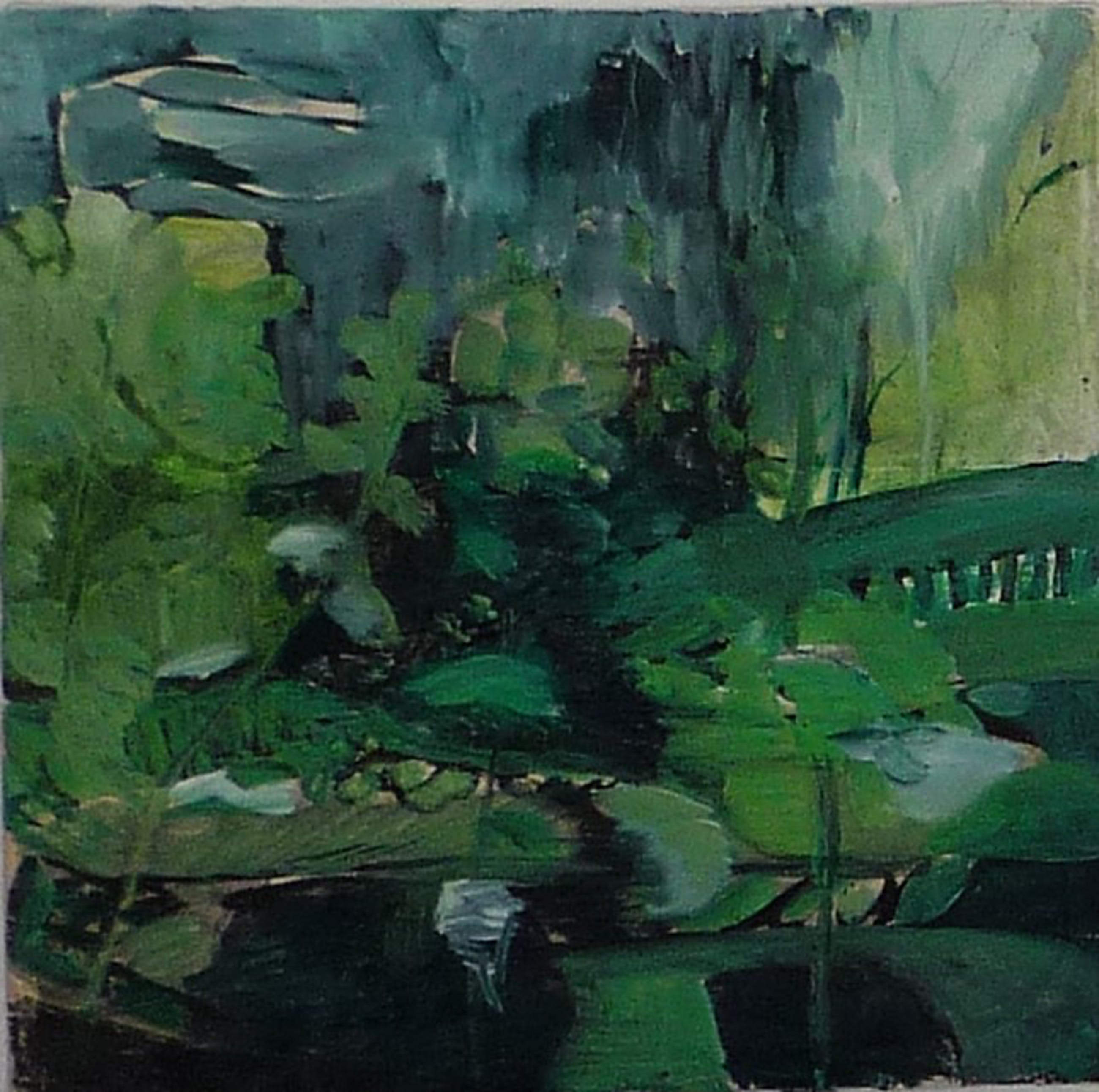 Ik ben een poosje artist in residence geweest op 19e eeuwse landgoed Oosterhouw in het Noordoosten van Groningen. De tuin daar was ontzettend mooi, aangelegd door een landschapsarchitect. Er waren verschillende tuinen, een slingertuin, een moestuin, een 'witte'tuin etc. Ik heb daar de omgeving op me in laten werken en veel studies en foto's gemaakt. In mijn atelier heb ik die verder uitgewerkt. Deze kleine studie van een deel van de tuin is er een van.
