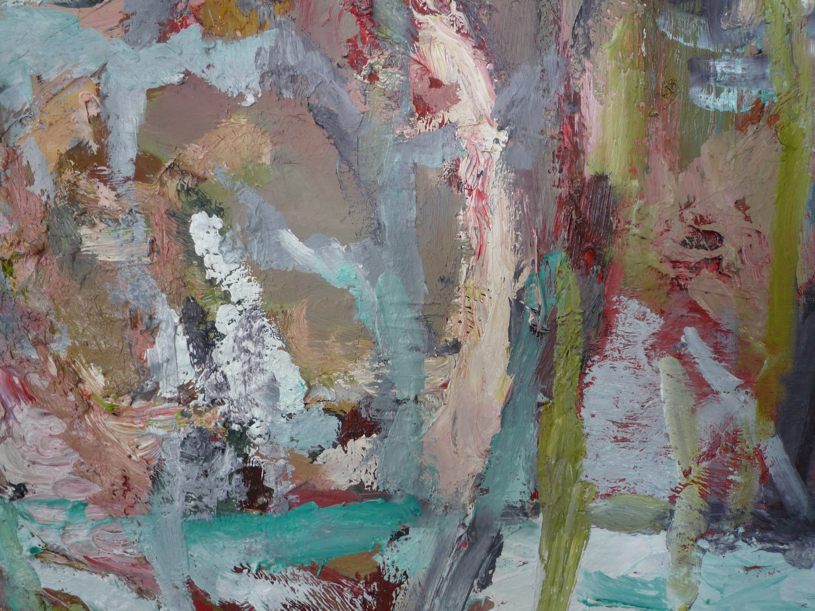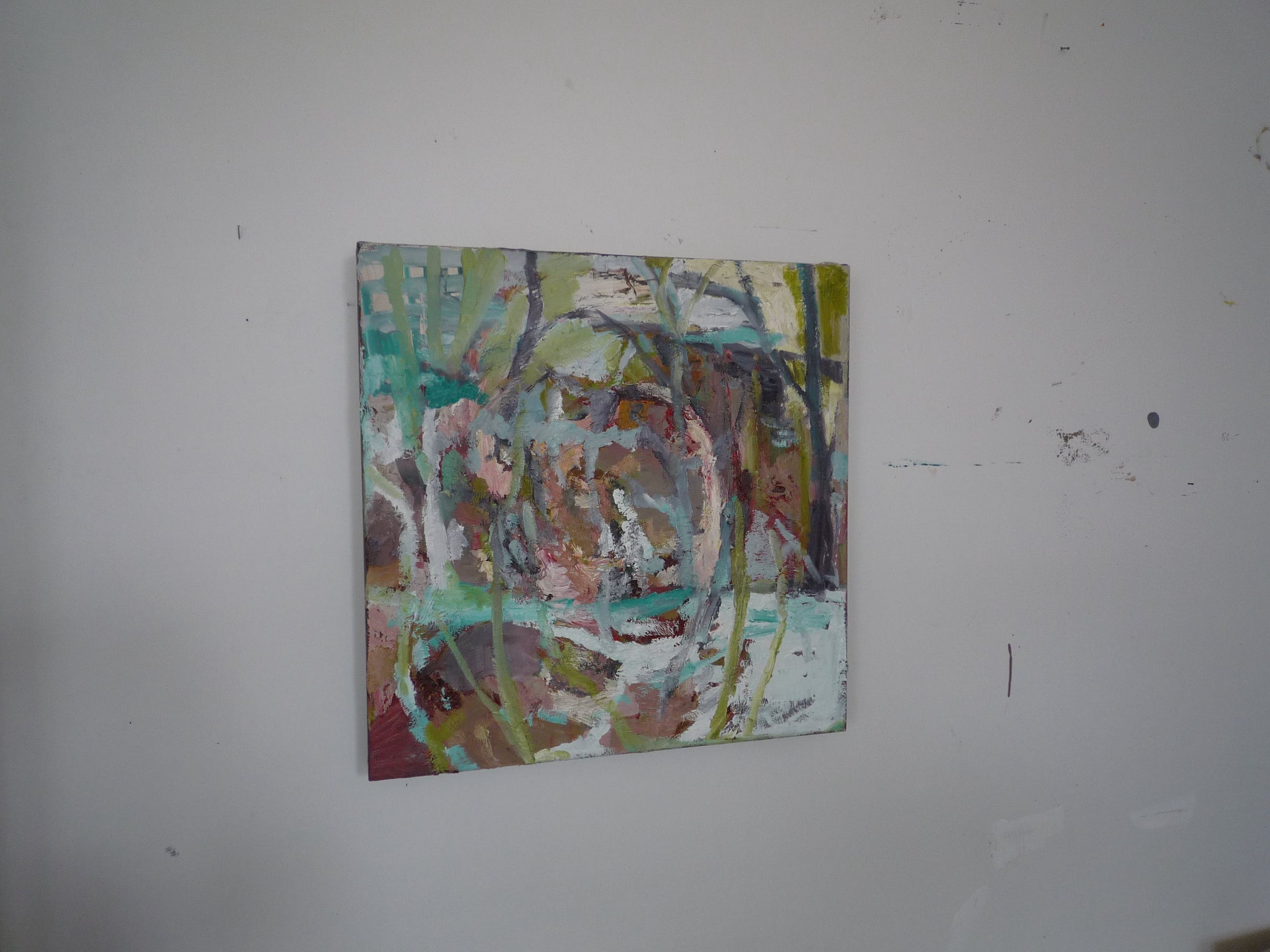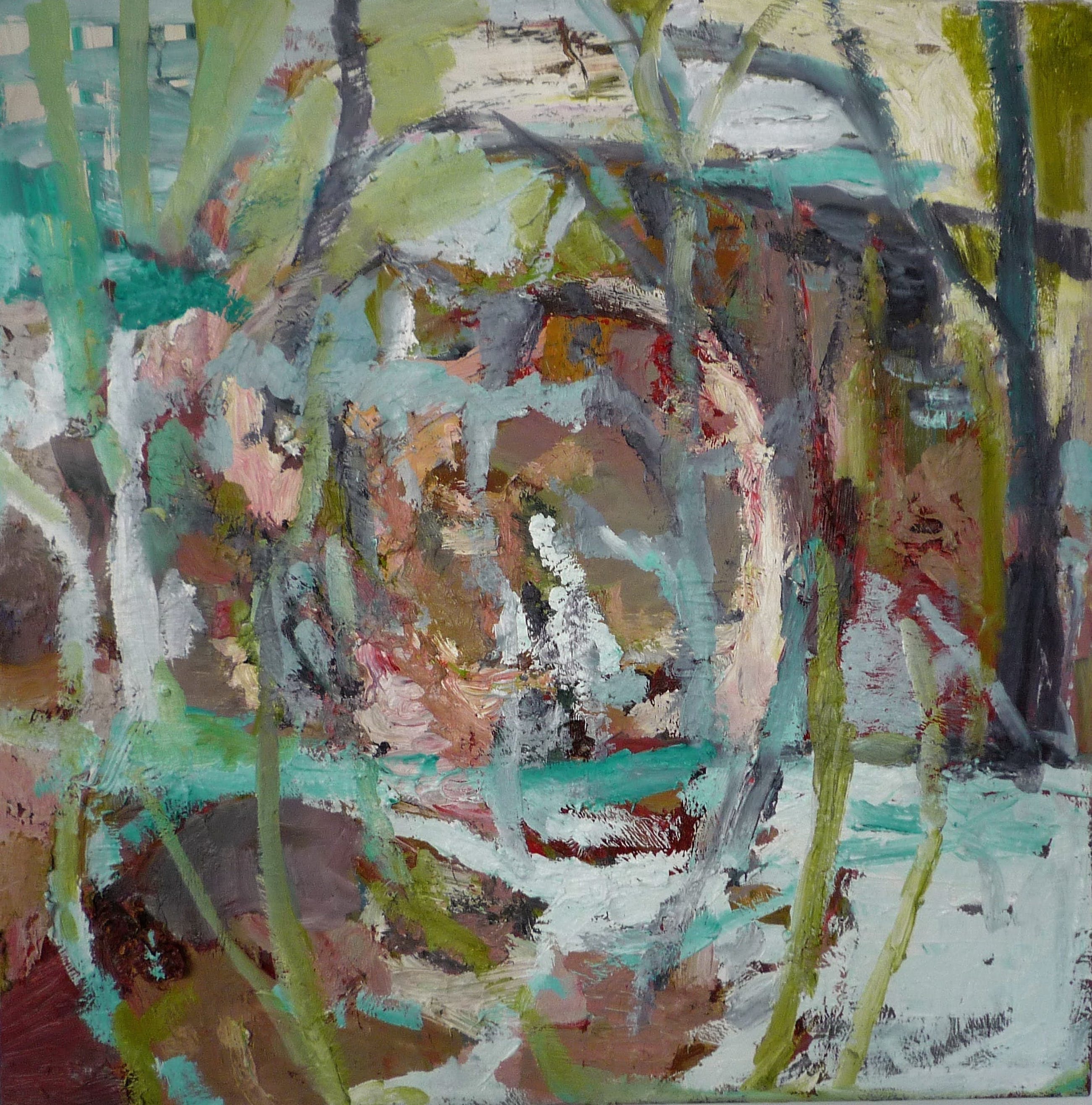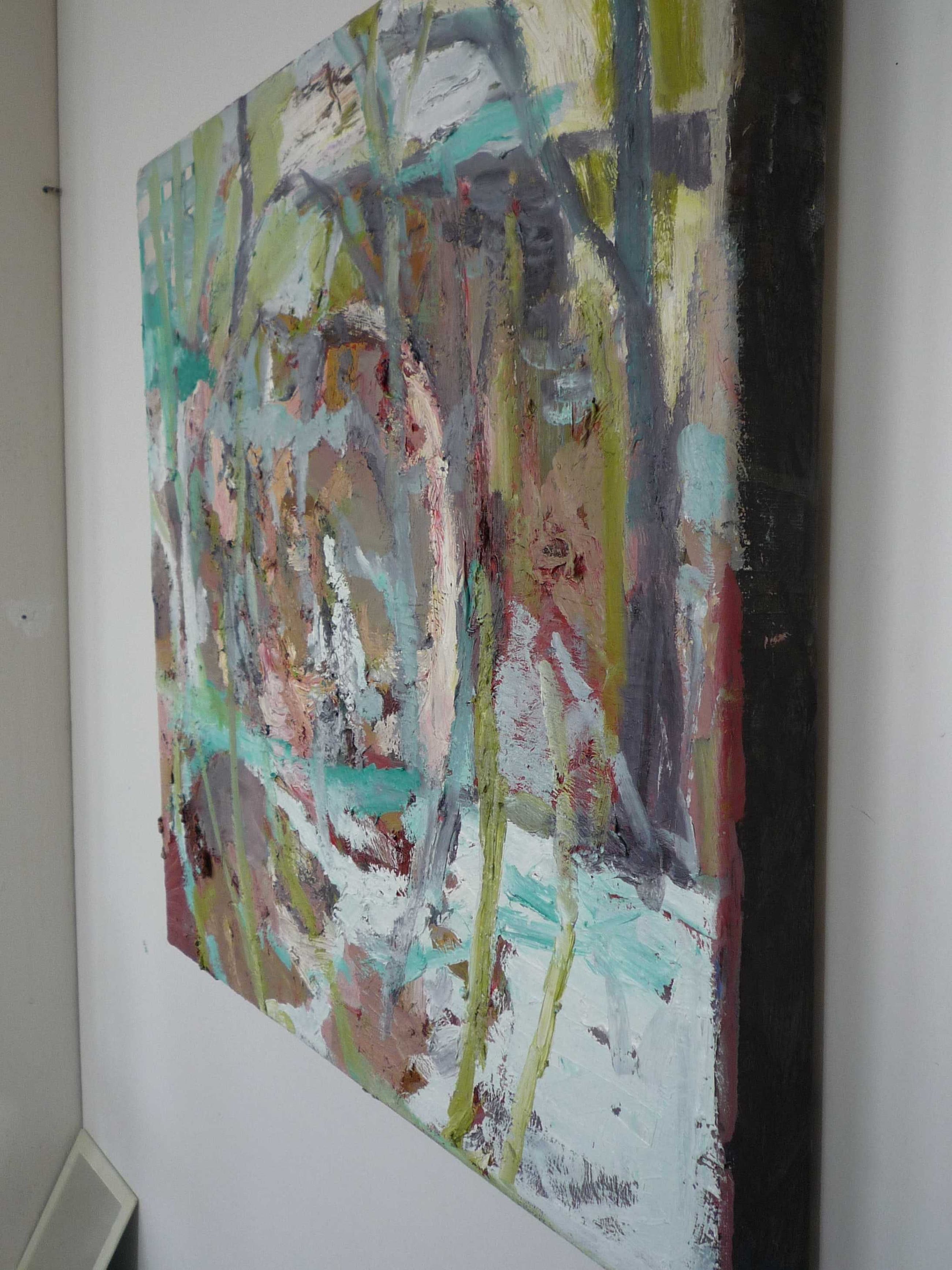 In atelier gemaakt. Naar aanleiding van een periode in het noorden van Groningen toen ik daar als artist in residence werkte in een 19e eeuws landhuis met een enorme tuin. De bloei, groei en overdadigheid van die tuin heb ik in een serie werken vastgelegd. Het is een gelaagd werk dwz er zijn meerdere lagen olieverf over elkaar heen gezet en zodoende krijg je een vrij dik reliefachtig oppervlak. Wat impasto wordt genoemd.