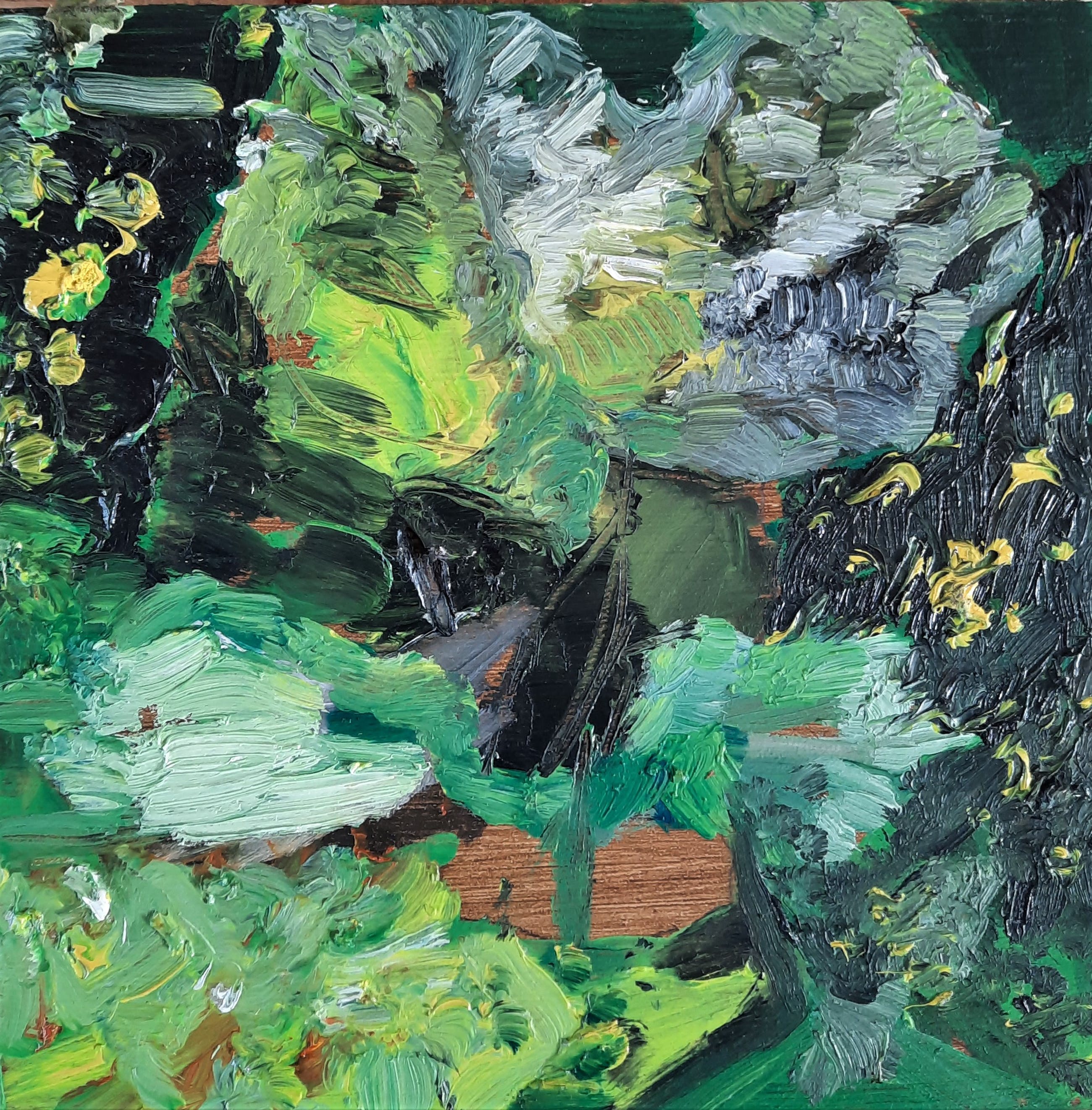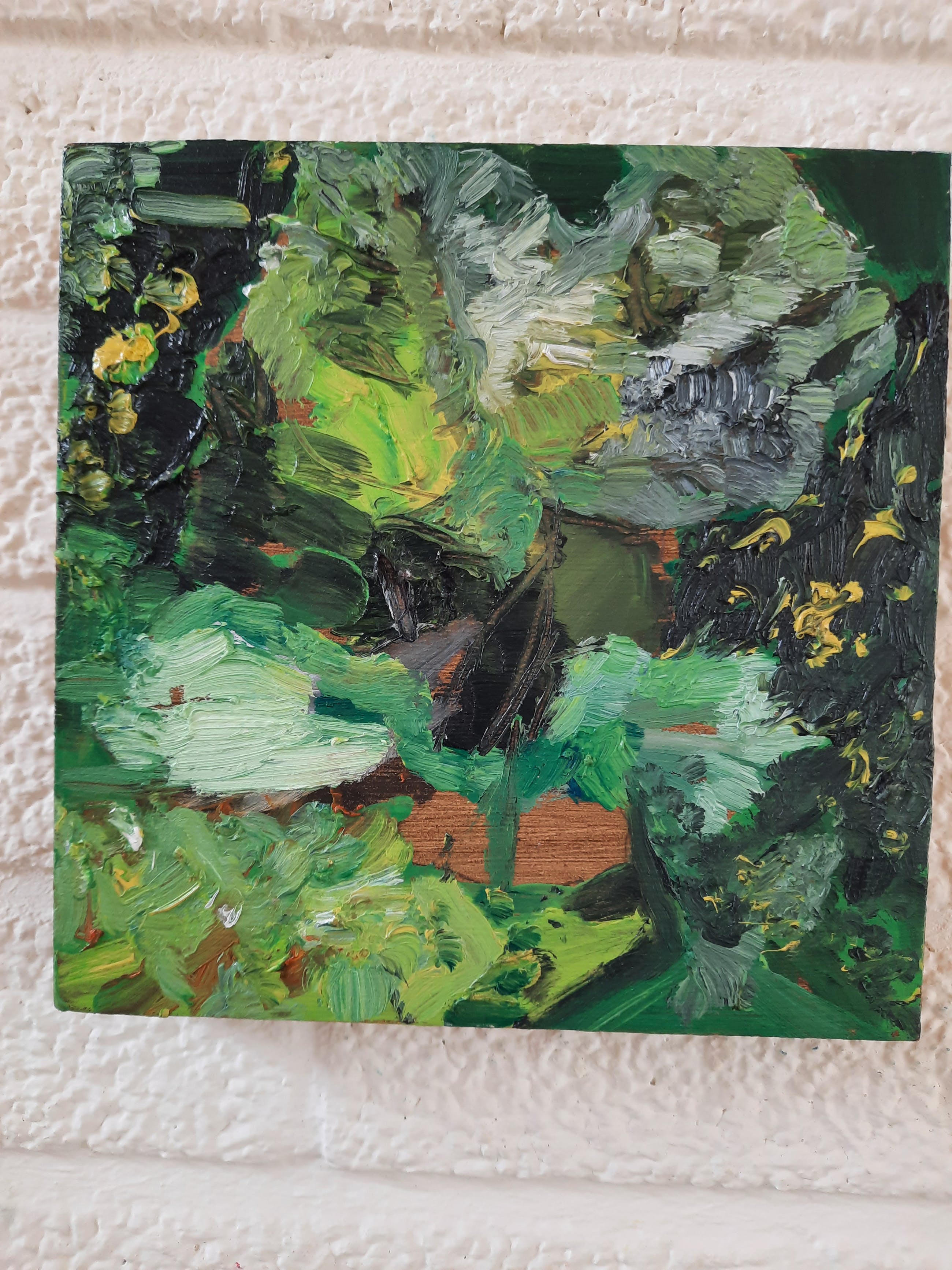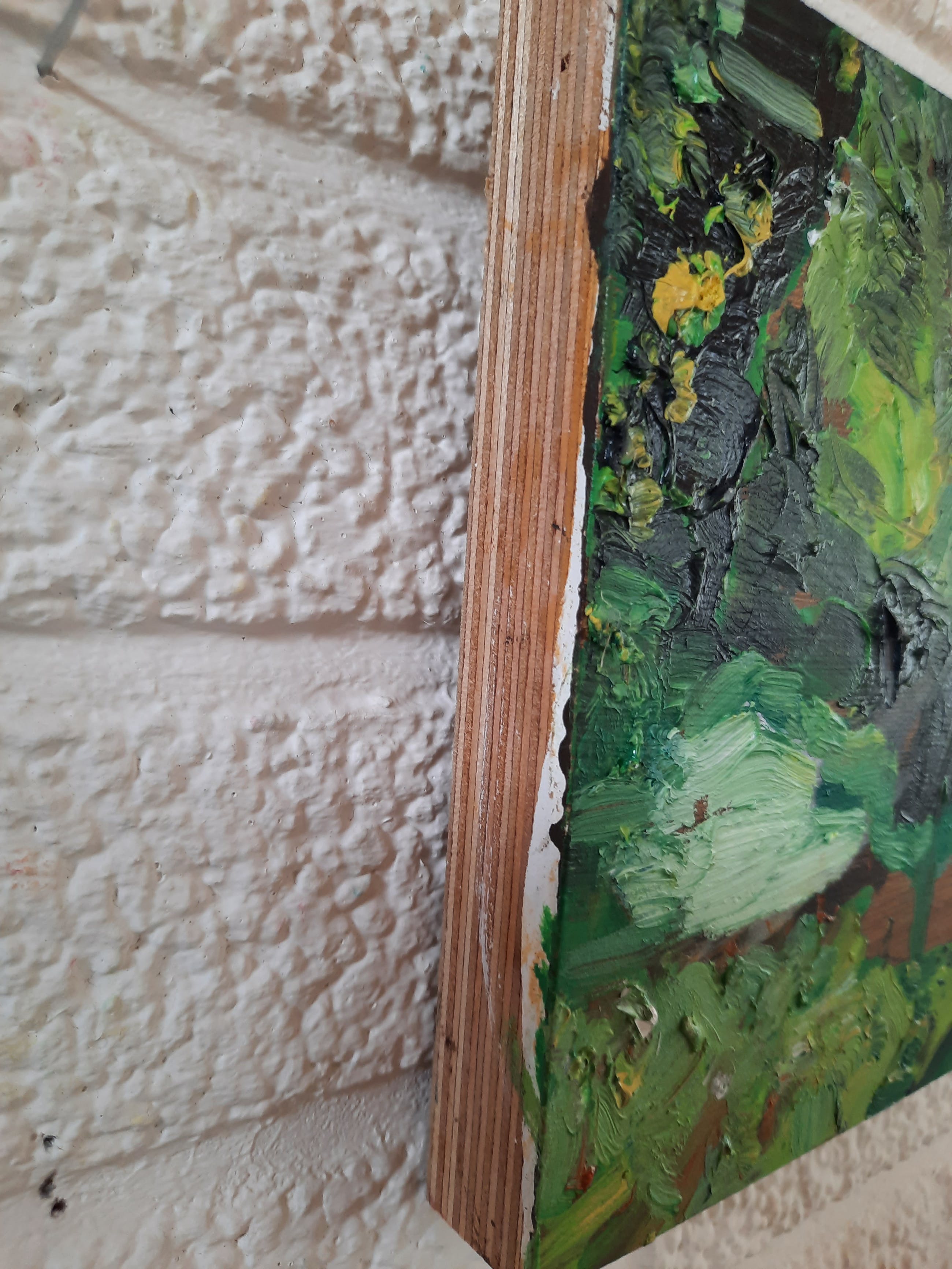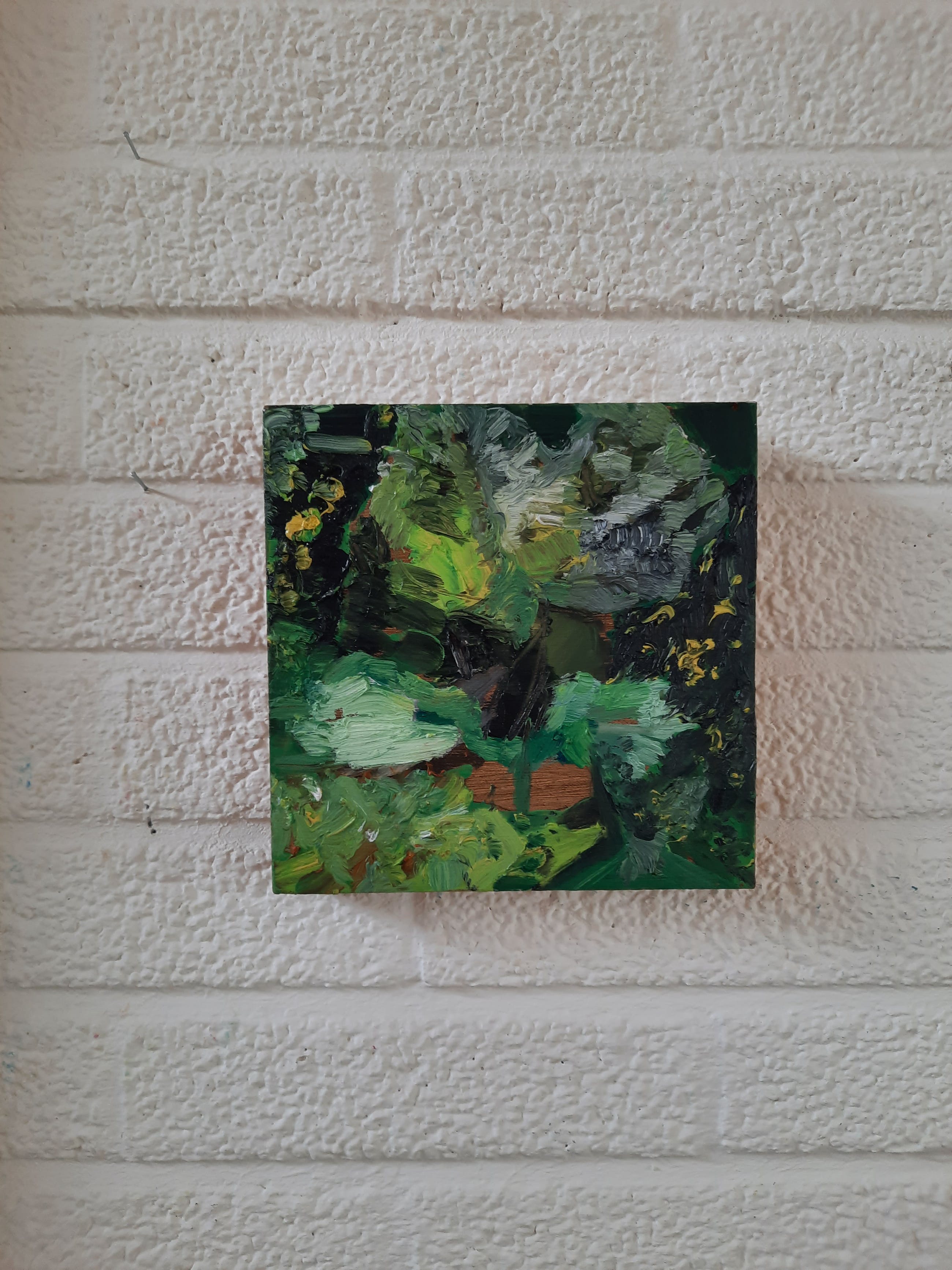 Het werk kan met een spijkertje om het gaatje worden opgehangen.