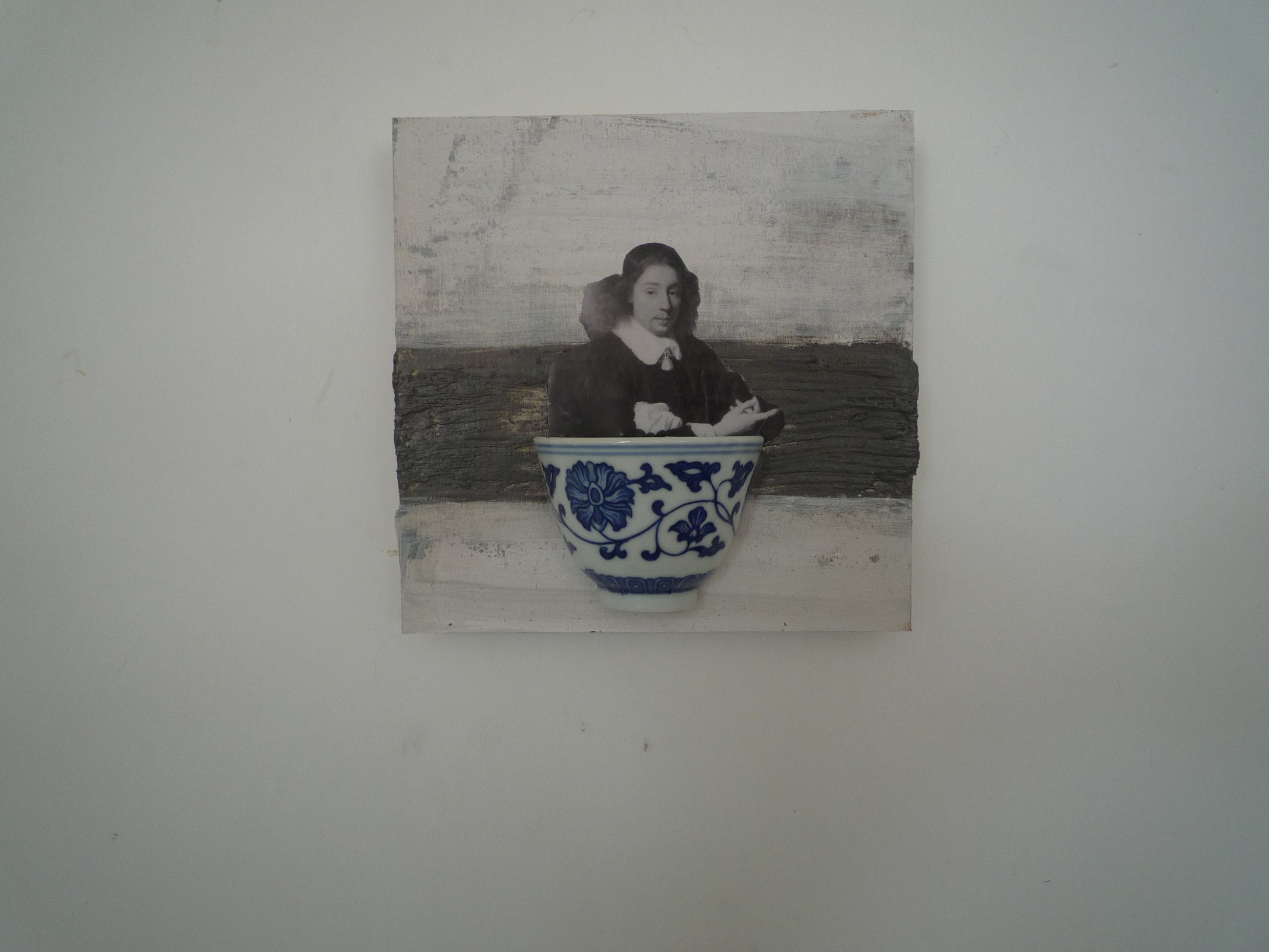 Dit is een klein paneeltje ( 2.5 cm dik) met een collage van een edelman. Een knipsel van een zwart-wit afbeelding van een 17e eeuws schilderijtje. Ik heb het gecombineerd met een half chinees theekopje. Als verwijzing naar de Gouden Eeuw met zijn bloeiend koopmanschap en voorliefde voor chinees porselein. De ondergrond is olieverf en bijenwas. Ook al een verwijzing naar de Hollandse 17e eeuw . Olieverfschilderijen werden toen aan de lopende band gemaakt, vooral van belangrijke koopmannen en andere functionarissen. Bijenwas werd gebruikt als bindmiddel voor pigmenten.