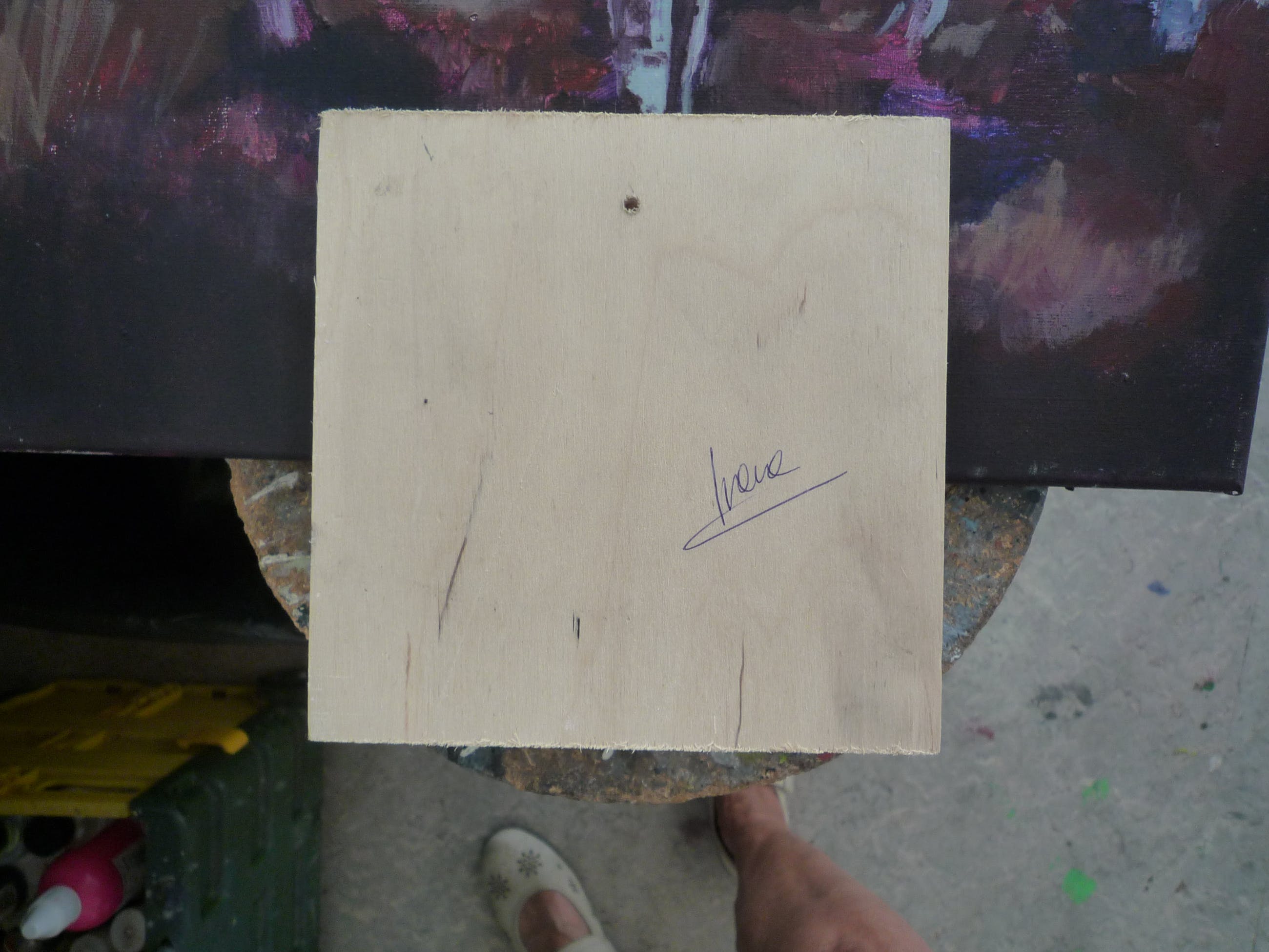 In de achterkant zit een geboord gaatje, waaraan u het werkje kunt hangen. Aan een spijkertje of schroefje. Dan hangt het mooi plat.