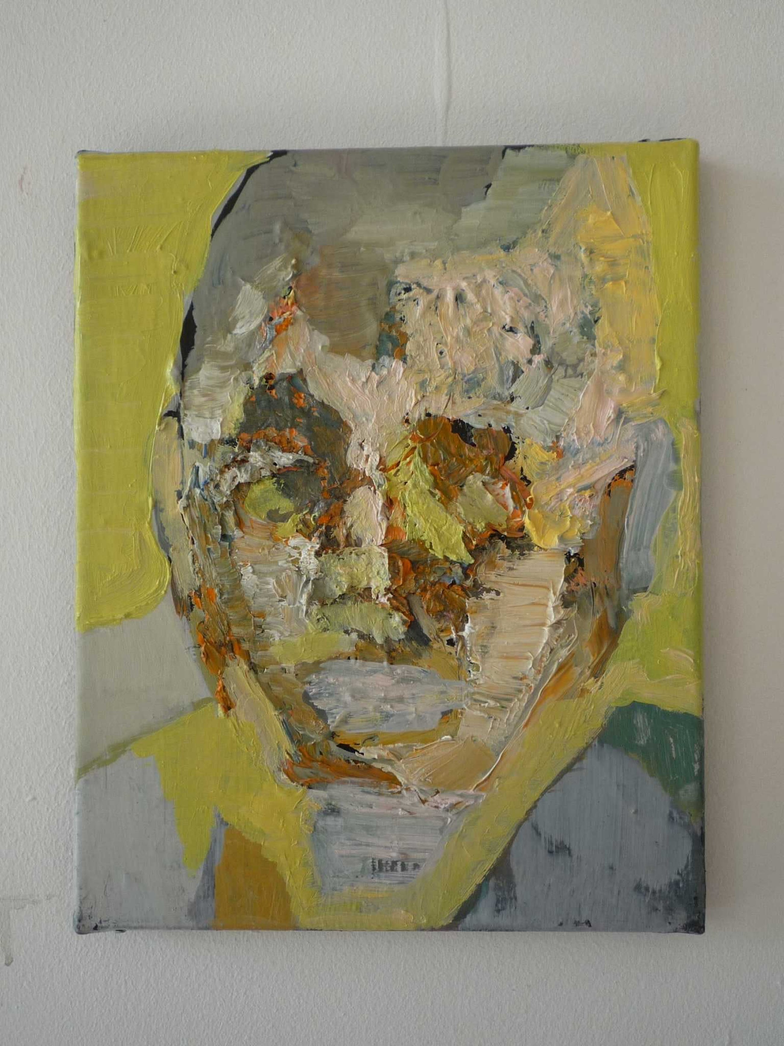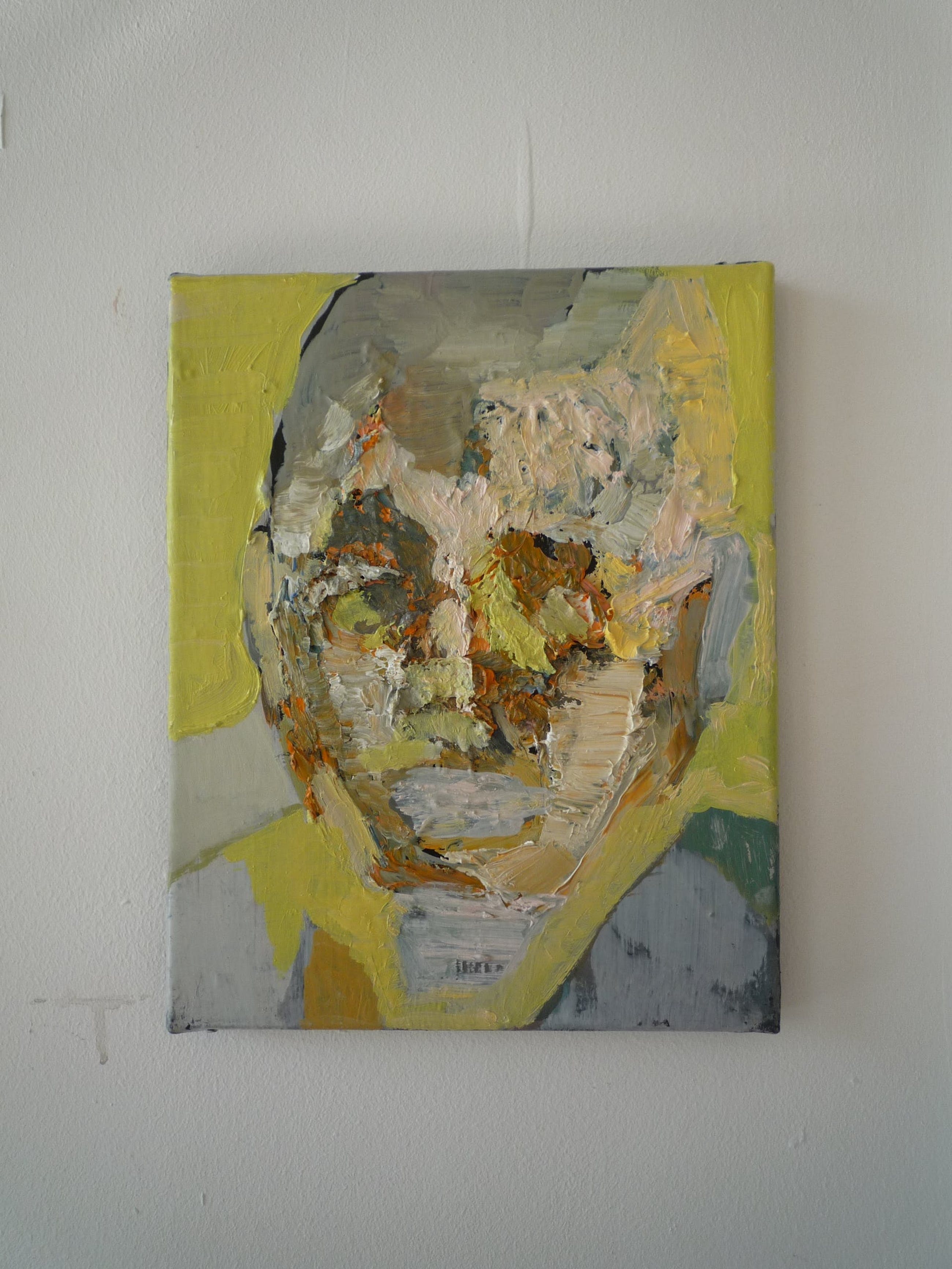 Gelaagd schilderij , d.w.z. dikke lagen olieverf, zgn. impasto.Abstracte kop op canvas doek.