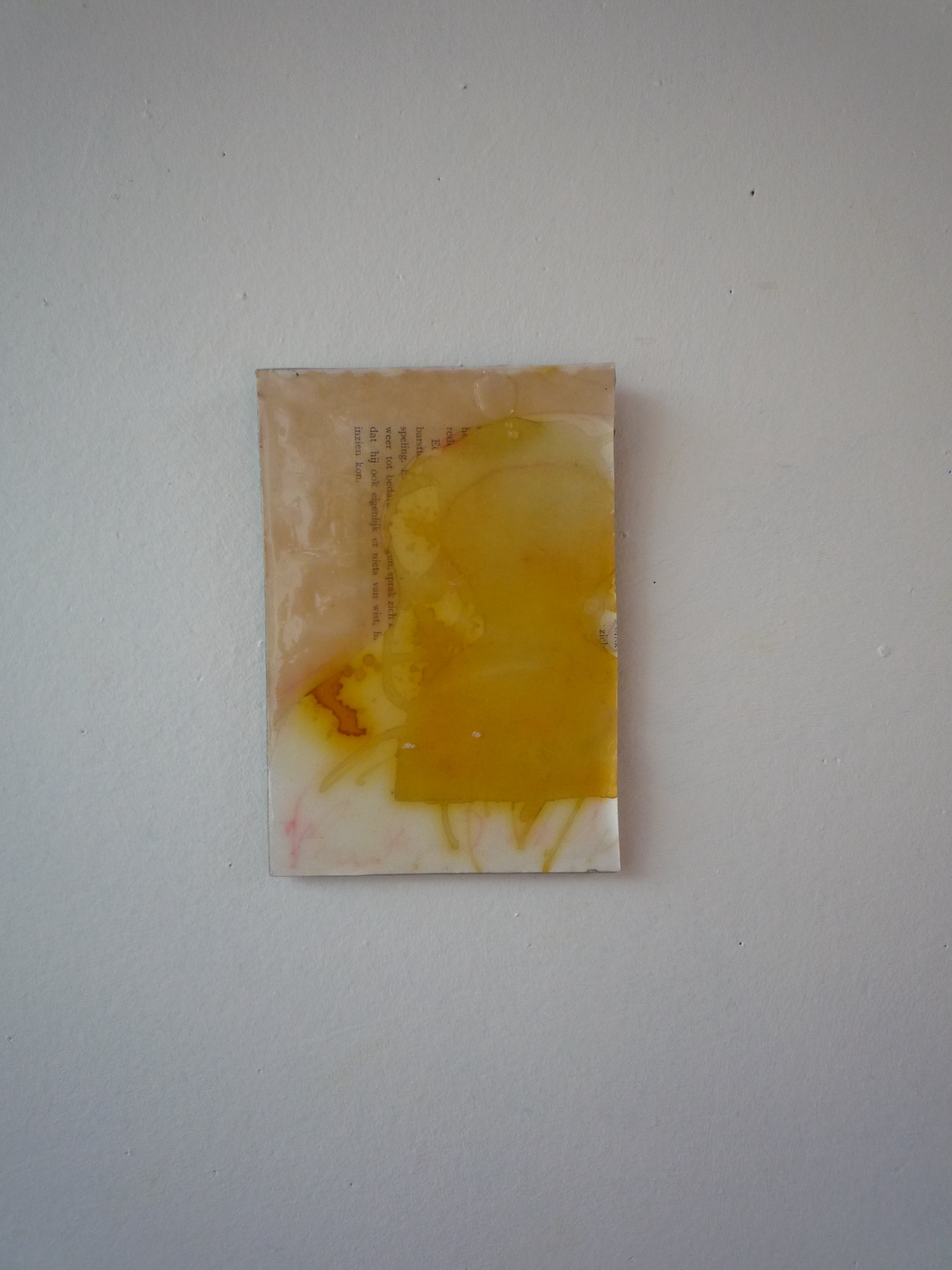 Werk in collage en gemengde technieken op oude kunstkaarten, opgeplakt op karton. Met laklaag. Aan de achterkant kartonnen strips. Op te hangen met een klein spijkertje of eventueel punaise aan de bovenste strip.