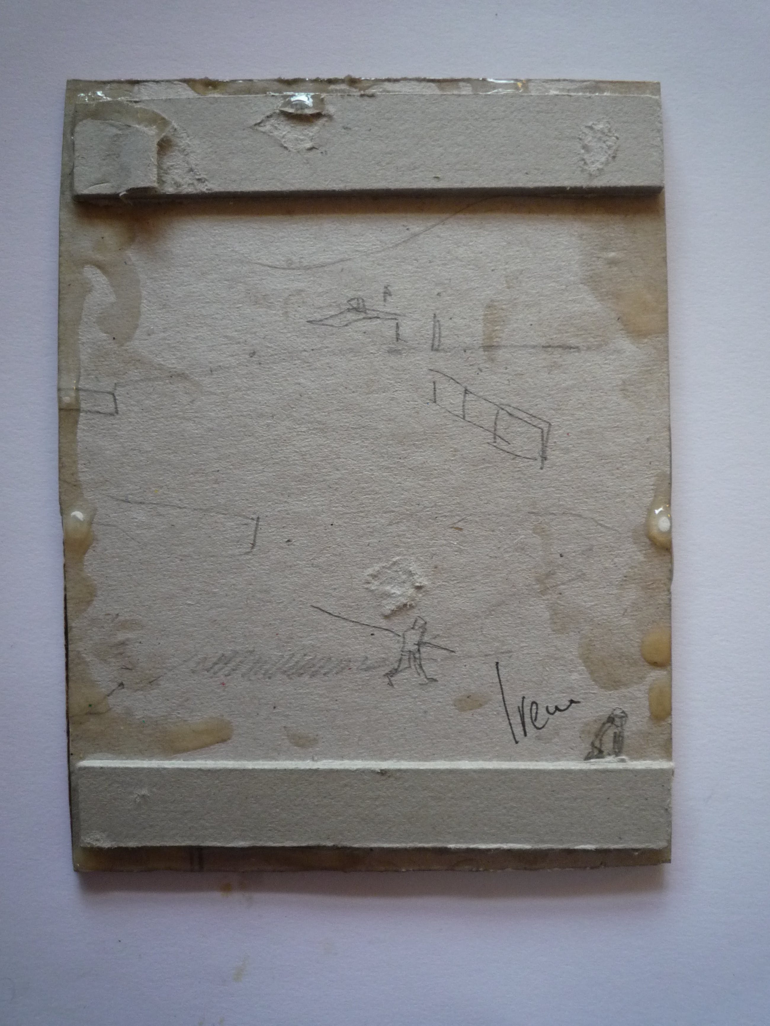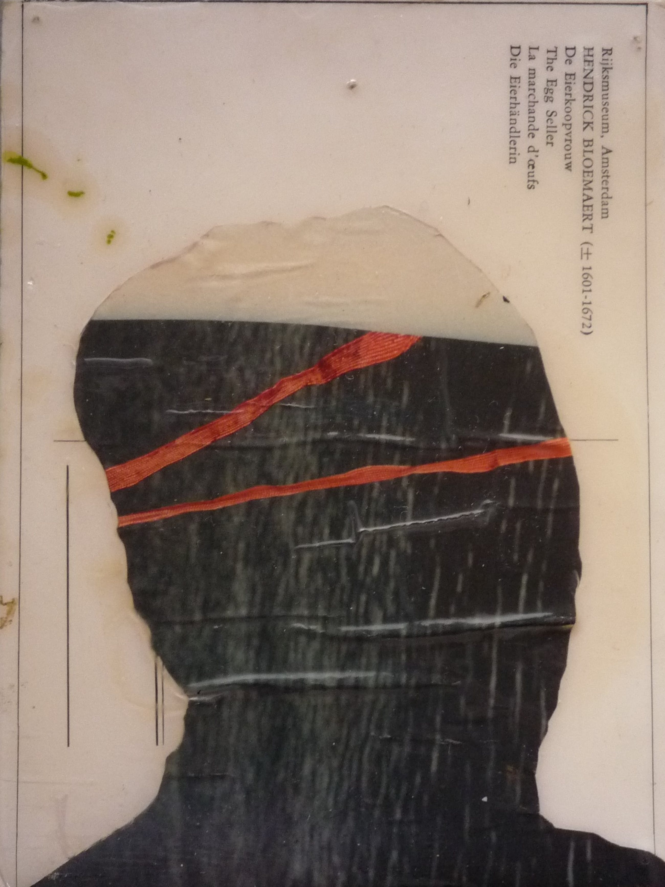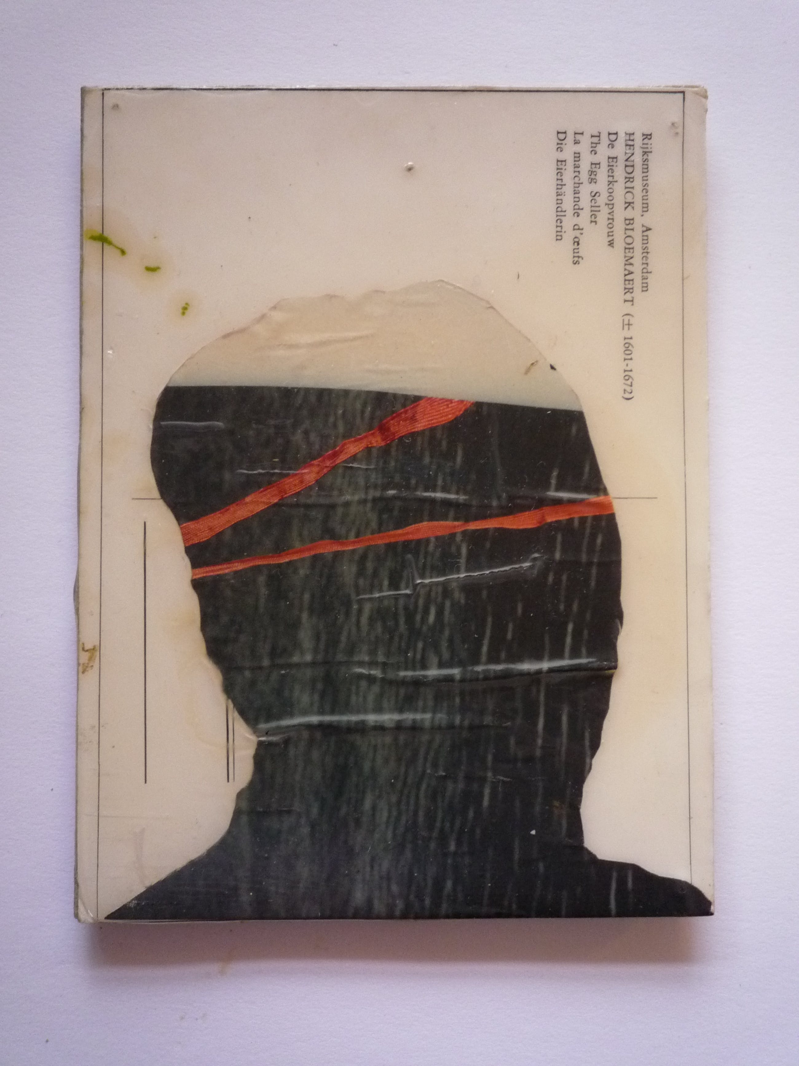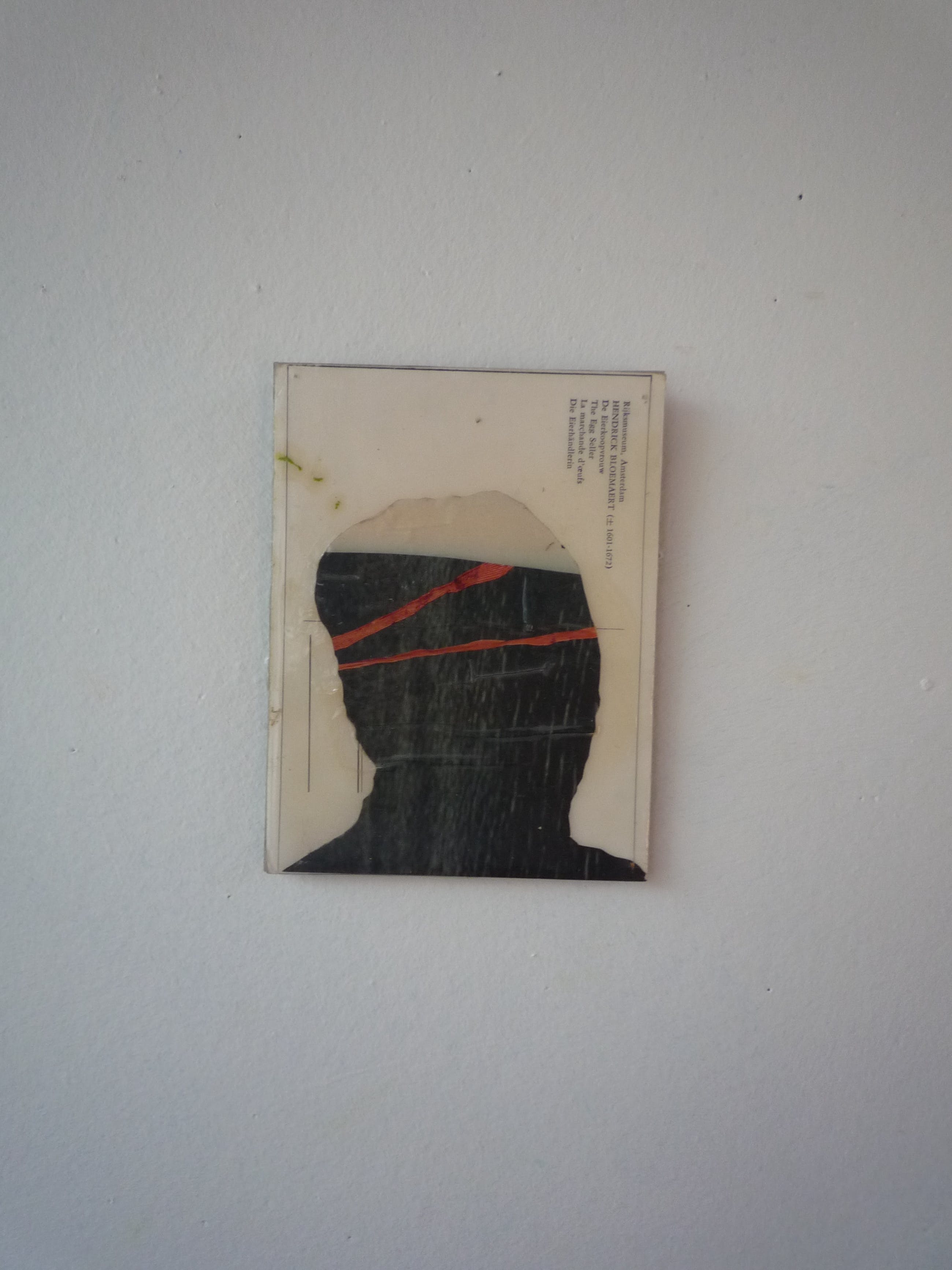 Werk in collage en gemengde technieken op oude kunstkaarten, opgeplakt op karton. Met laklaag. Aan de achterkant kartonnen strips. Op te hangen met een klein spijkertje of eventueel punaise aan de bovenste strip.