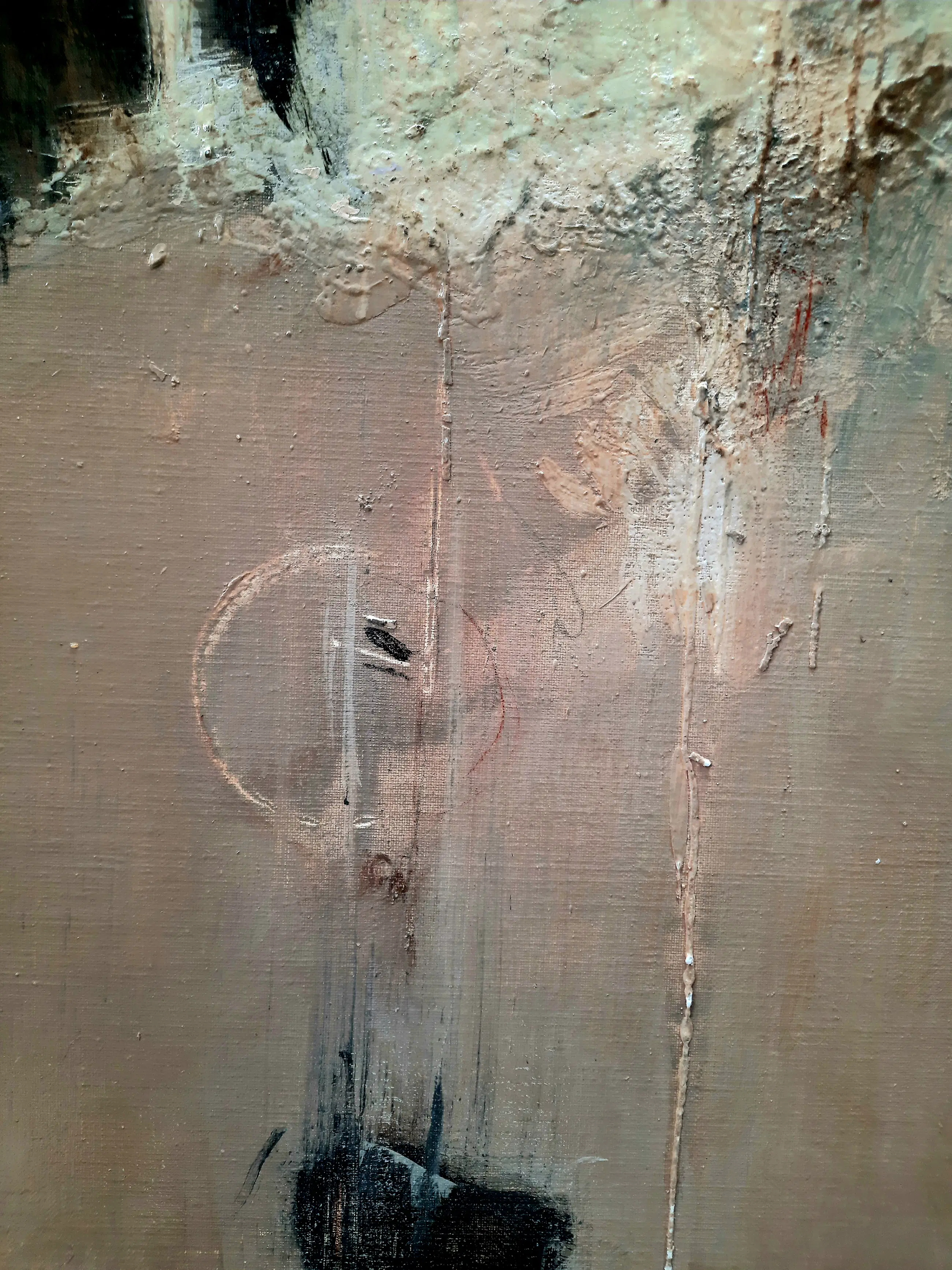 Een abstract werk in gemengde techniek. Plaatselijk met structuur. Verder glad. Dikte van het doek: 4.5 cm.