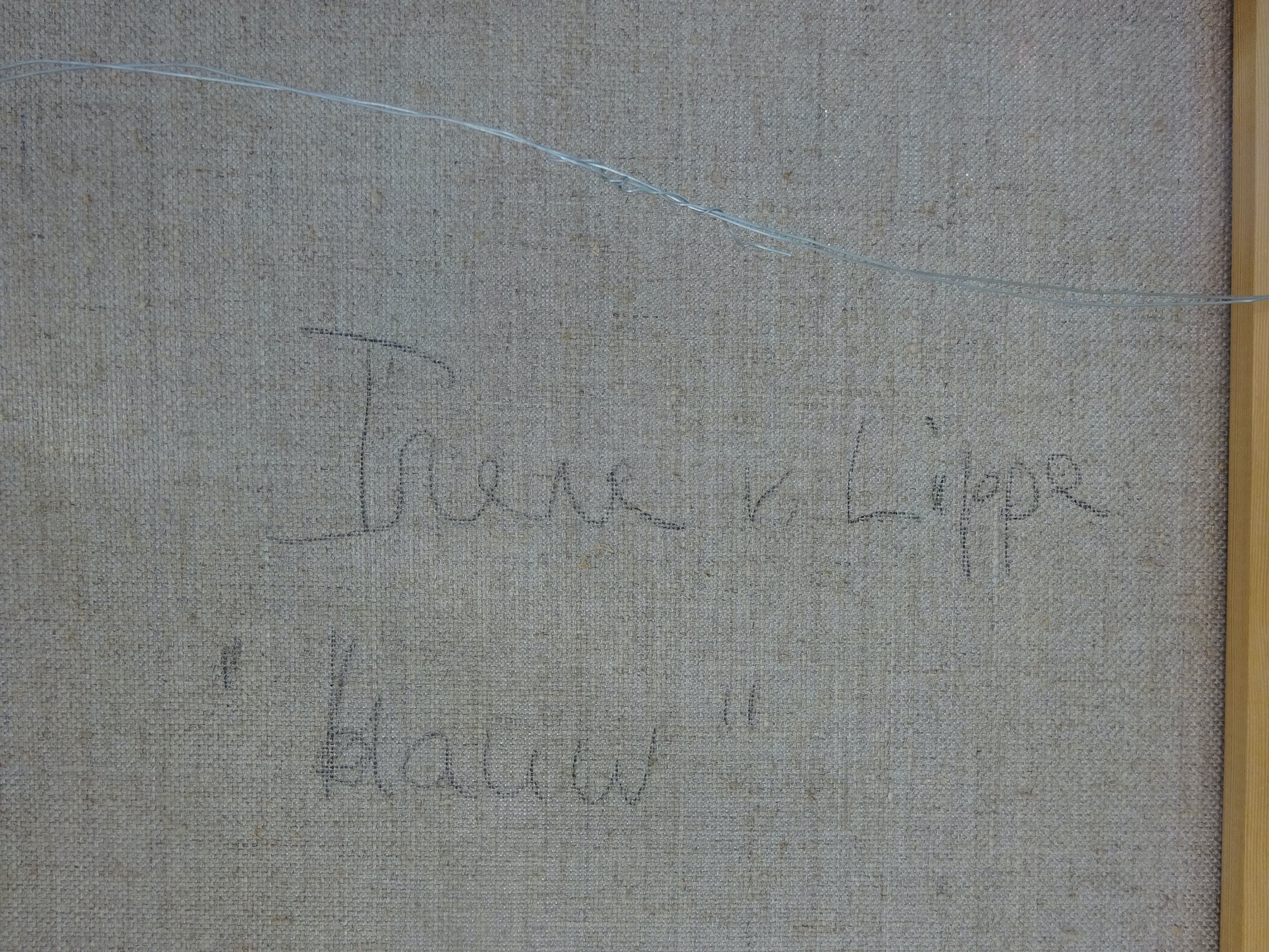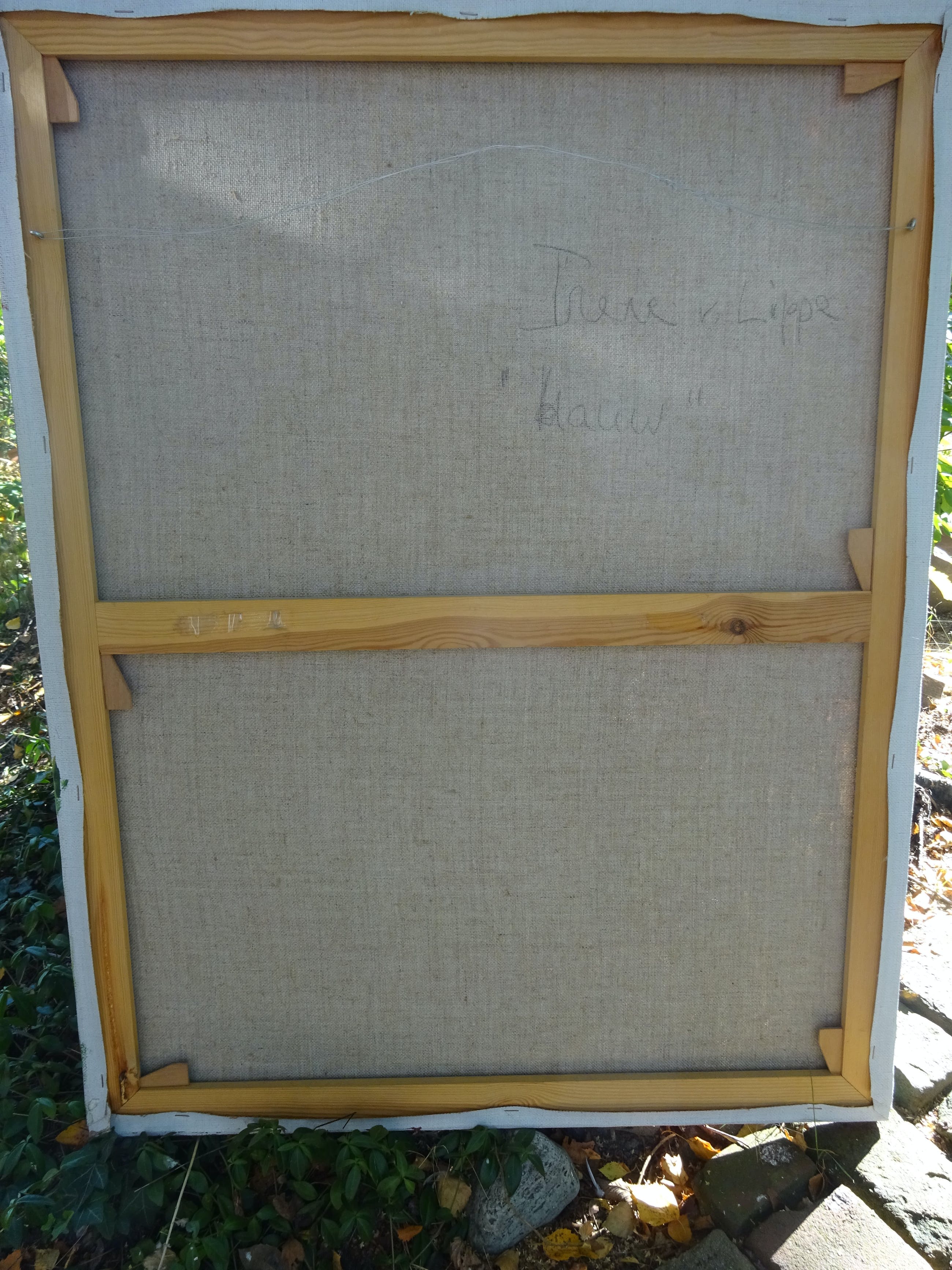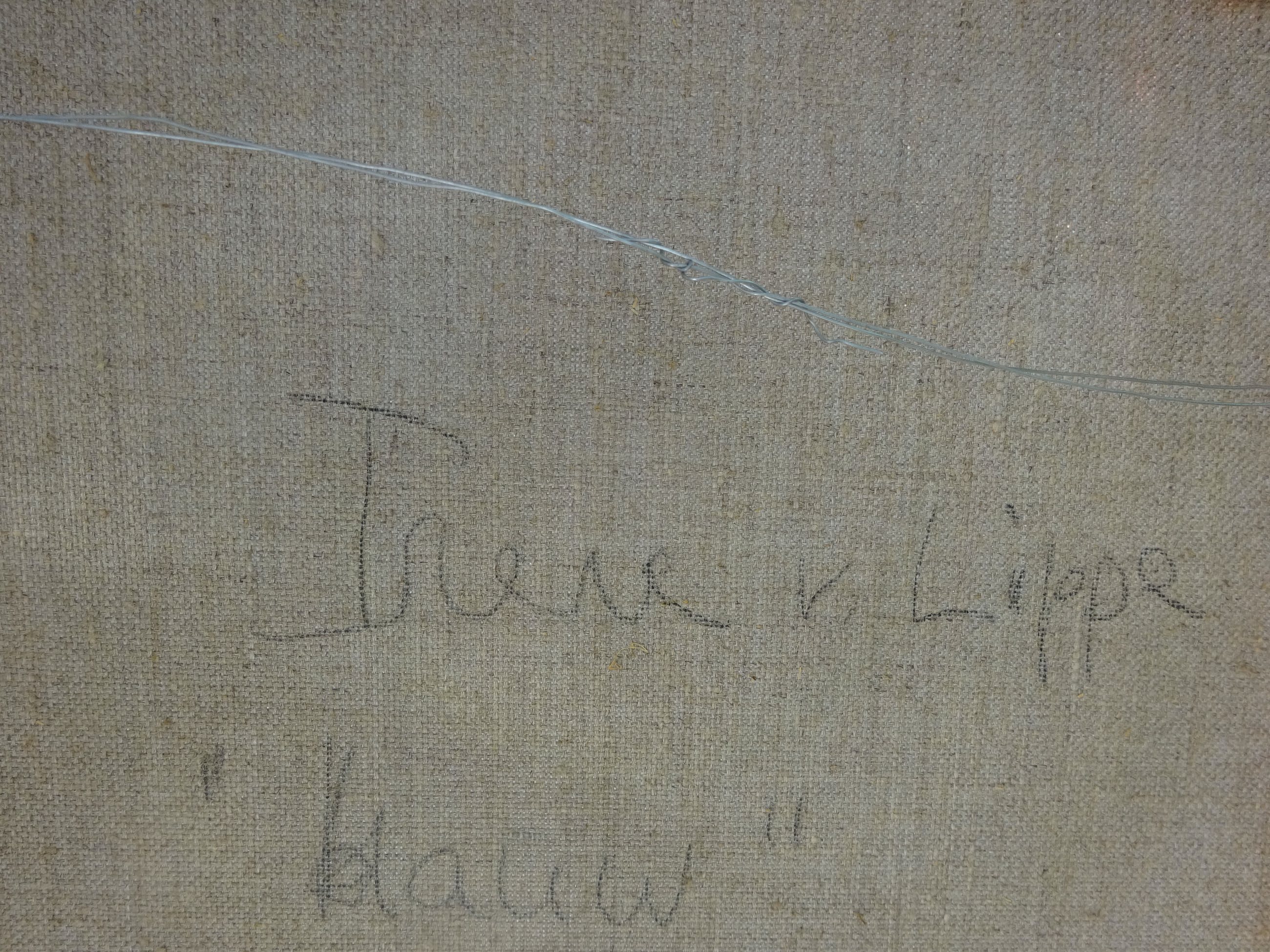 Gesigneerd olieverfschilderij met blauwe bloemen in het groen. Titel: Blauw Het schilderij is in 2003 gekocht bij De Nije Poorte in Wijk bij Duurstede. De opbrengst is gegaan naar de Stichting Lippe - Biesterveld, Natuurcollege ( factuur ter inzage) Beeldend Kunstenaar: Irene van Lippe Biesterveld 1939 Materiaal: olieverf op linnen Afmeting: 70 x 90 x 1.5 cm Conditie: mooie staat, aankoop factuur ter inzage op aanvraag.