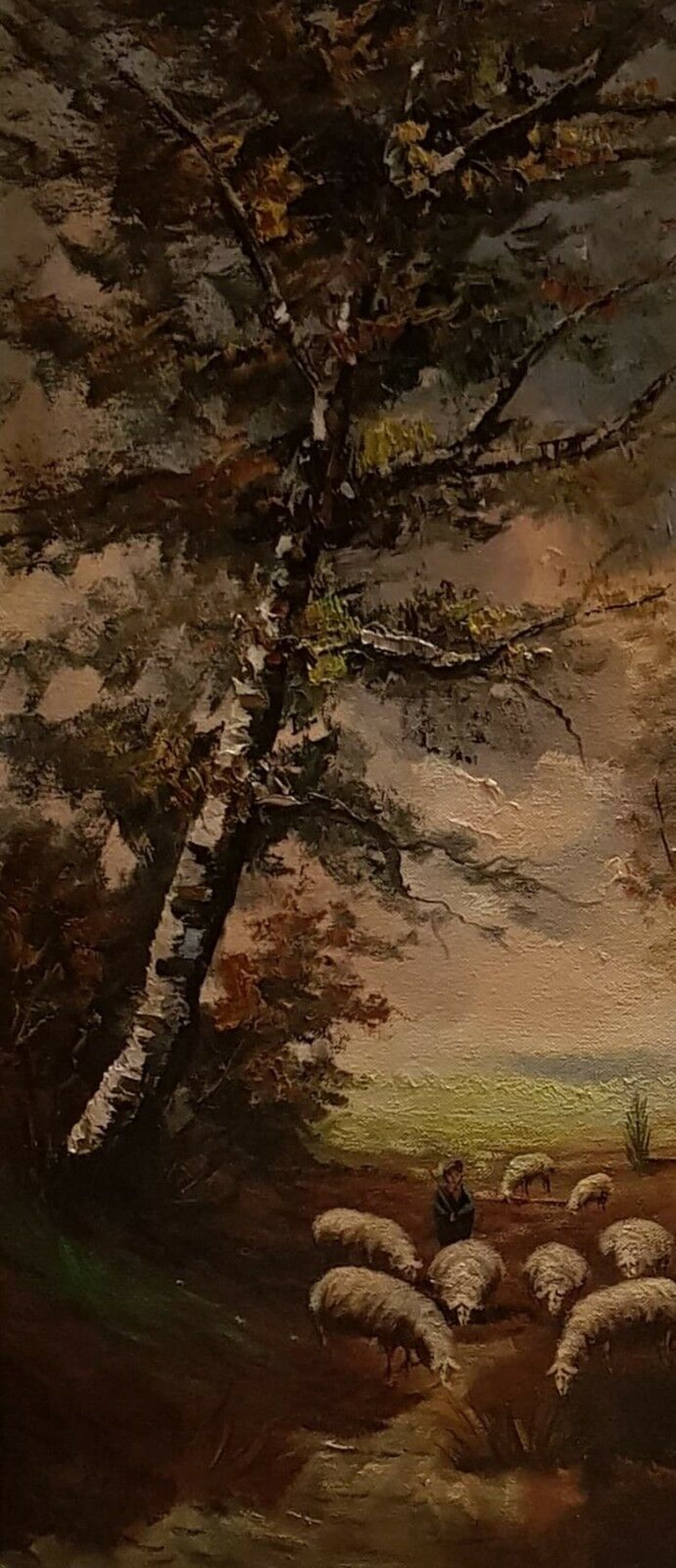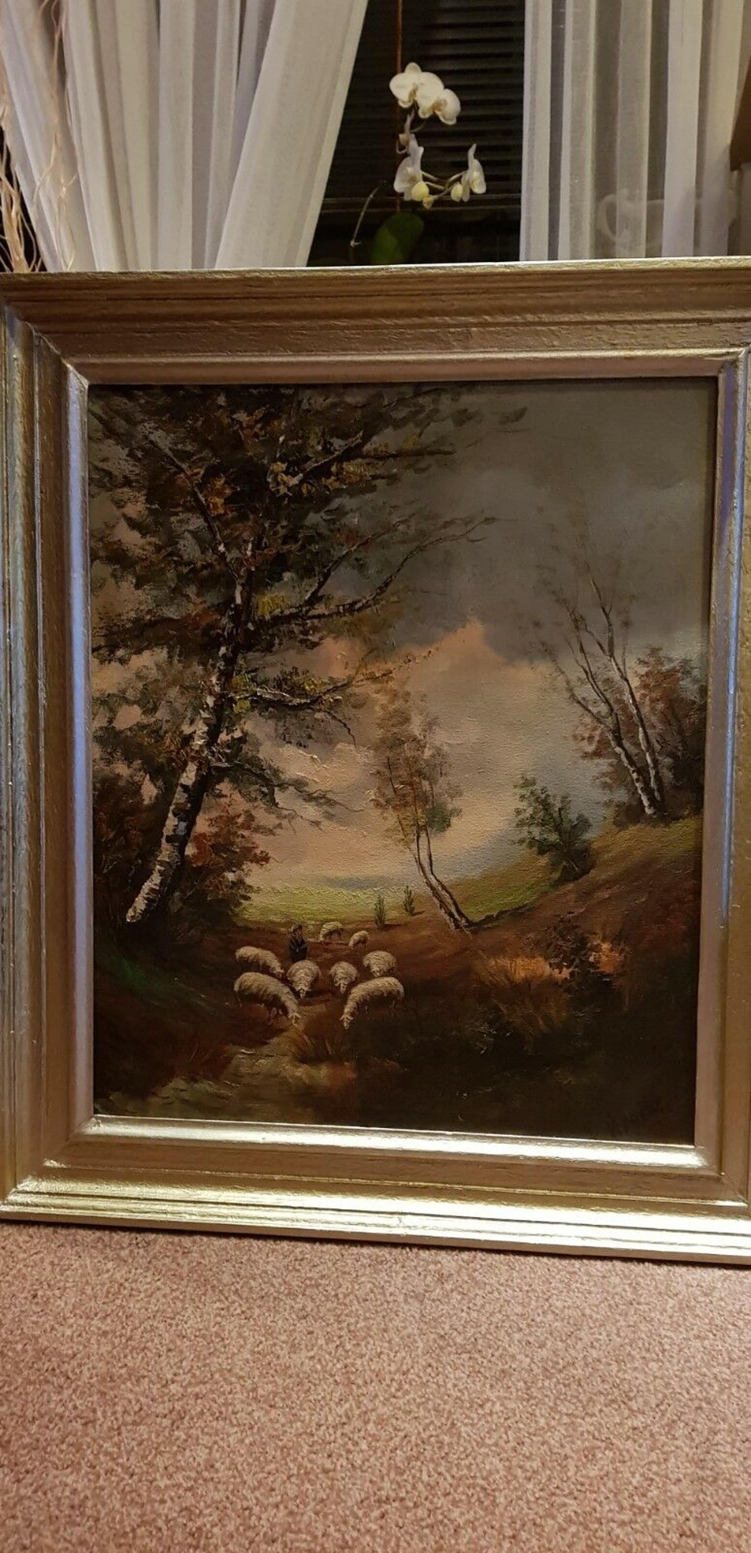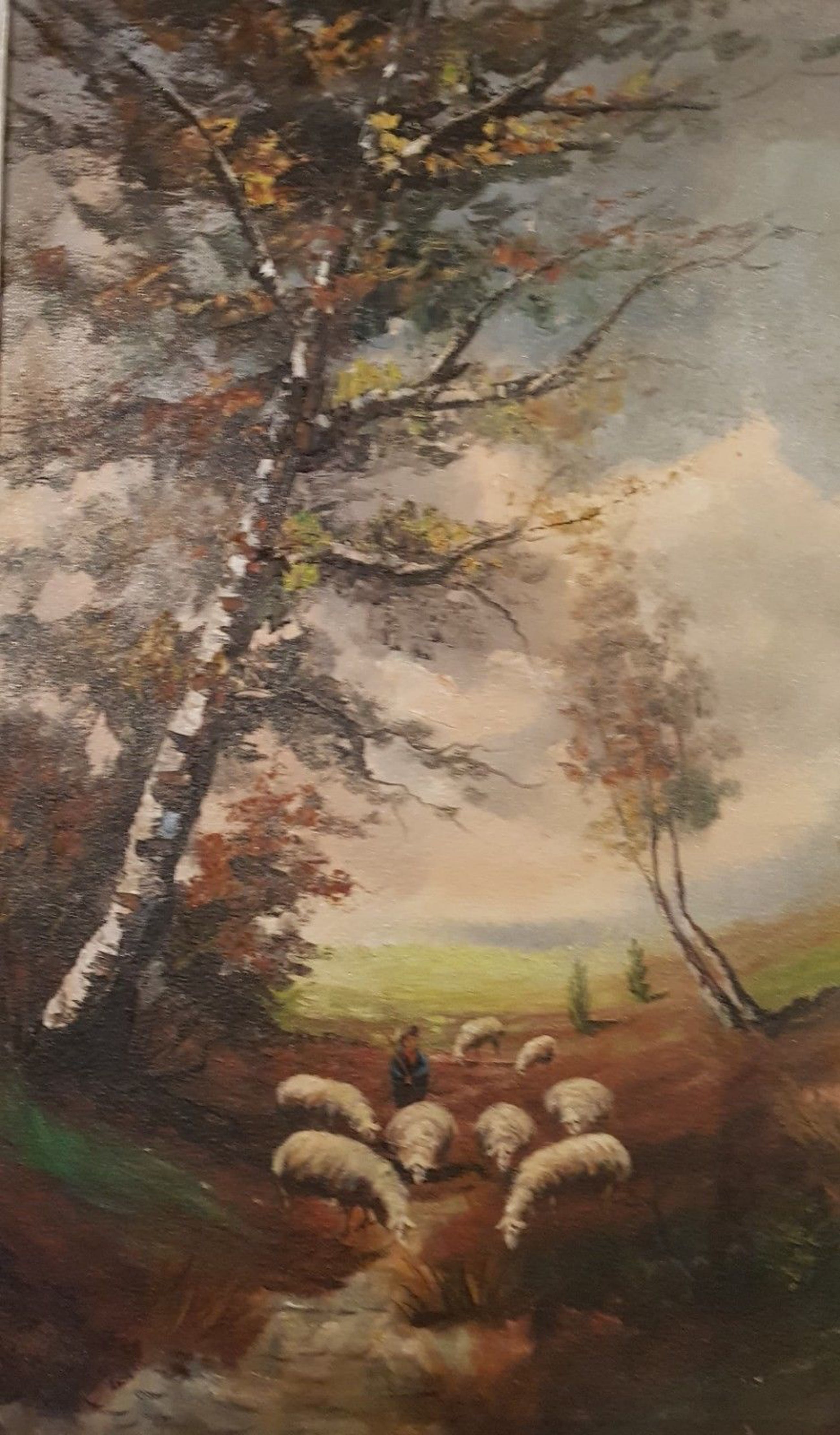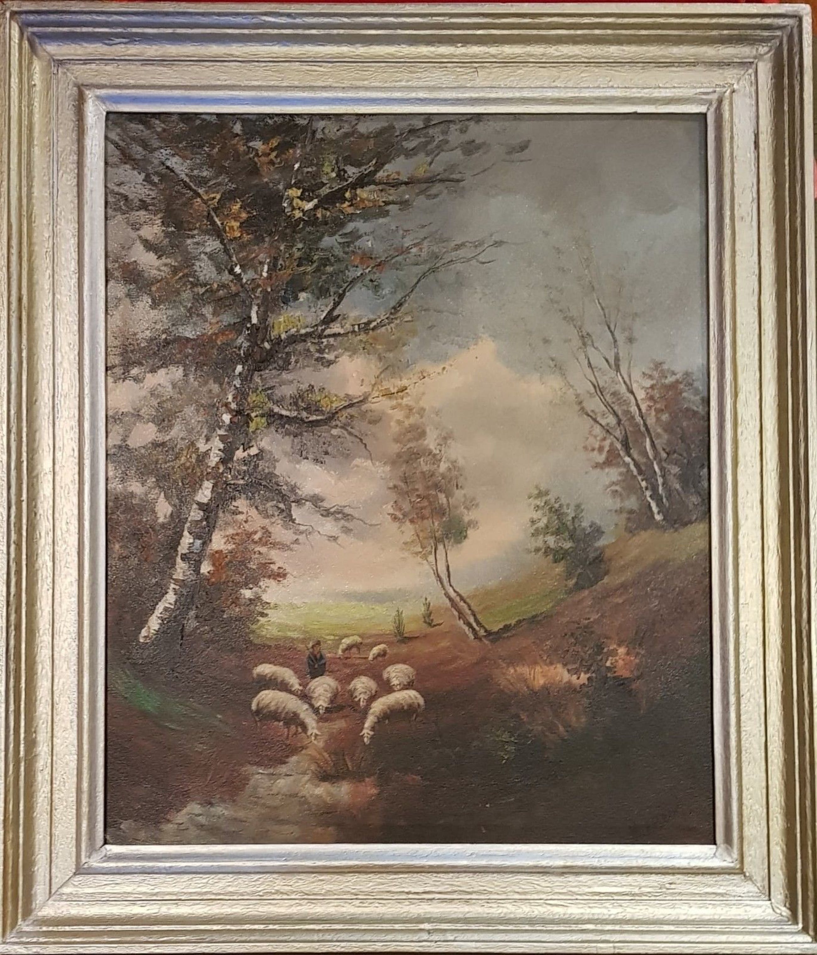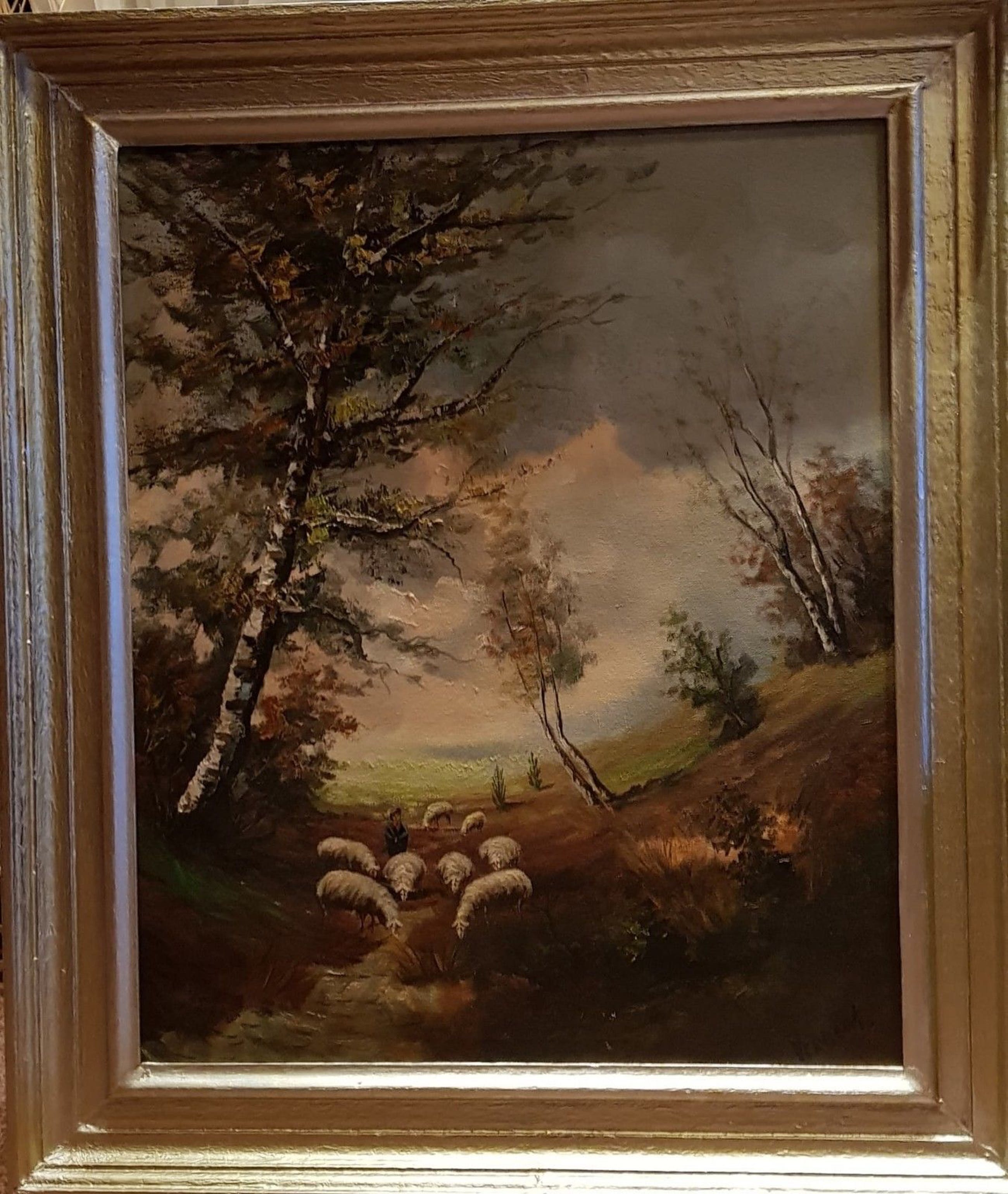 Herfst landschap met schapen!Buis, tekening, illustratie!Vanaf het midden van de 20e eeuw!Ondertekend rechtsonder!Mooi houten frame!