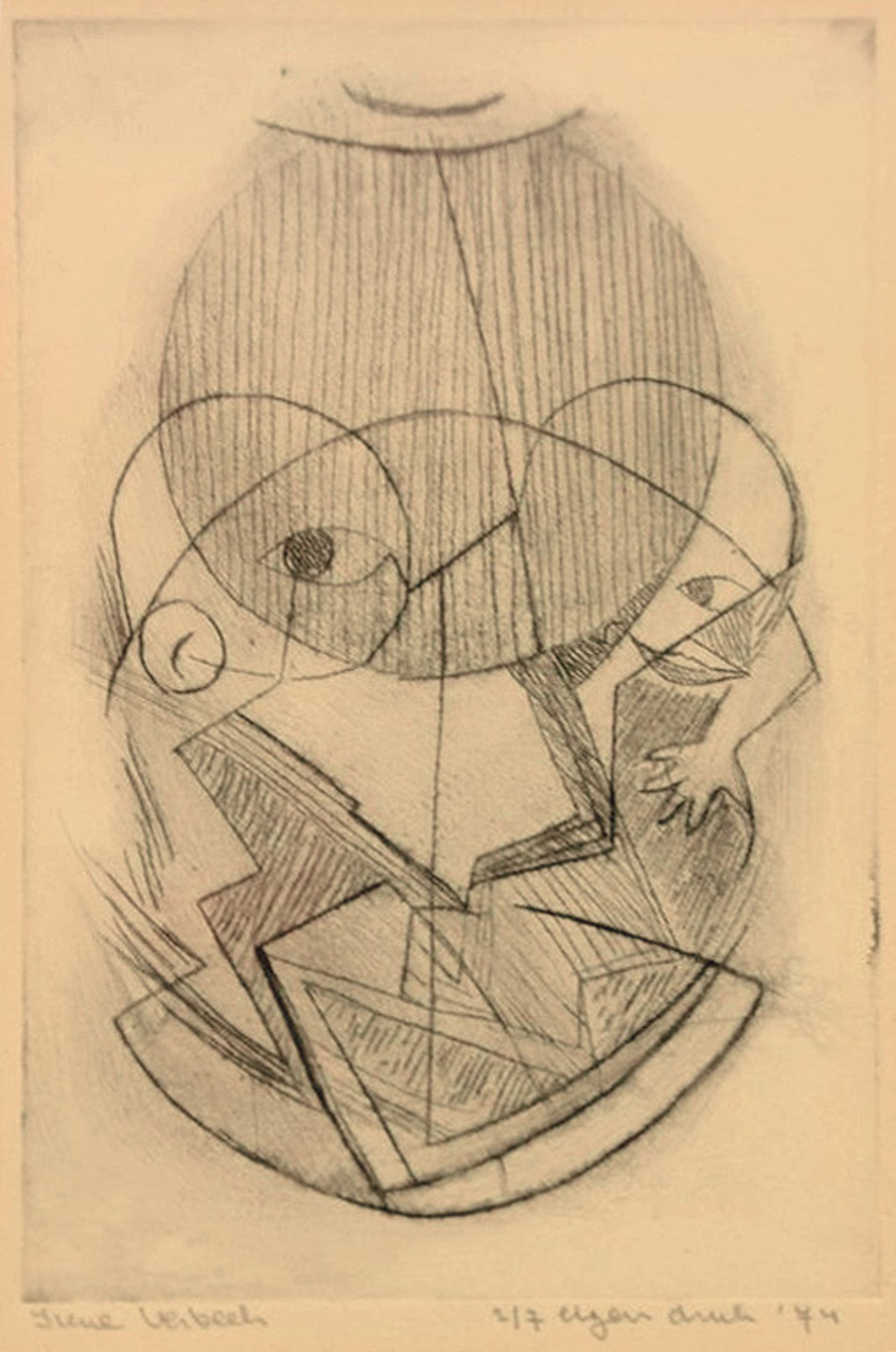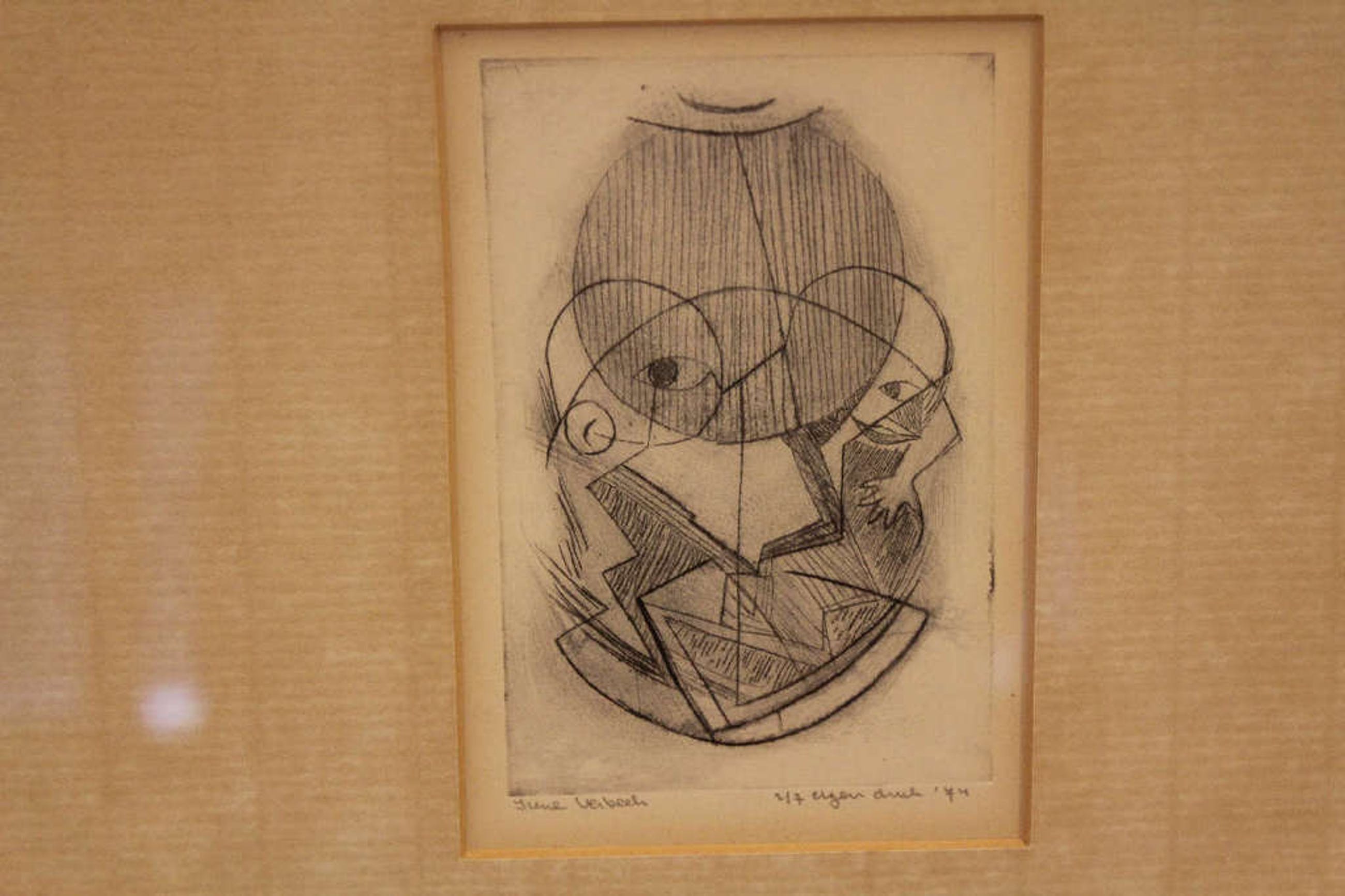 Een nette ets van Irene Verbeek. Het passe-partout van het kunstwerk is sterk vergeeld.
