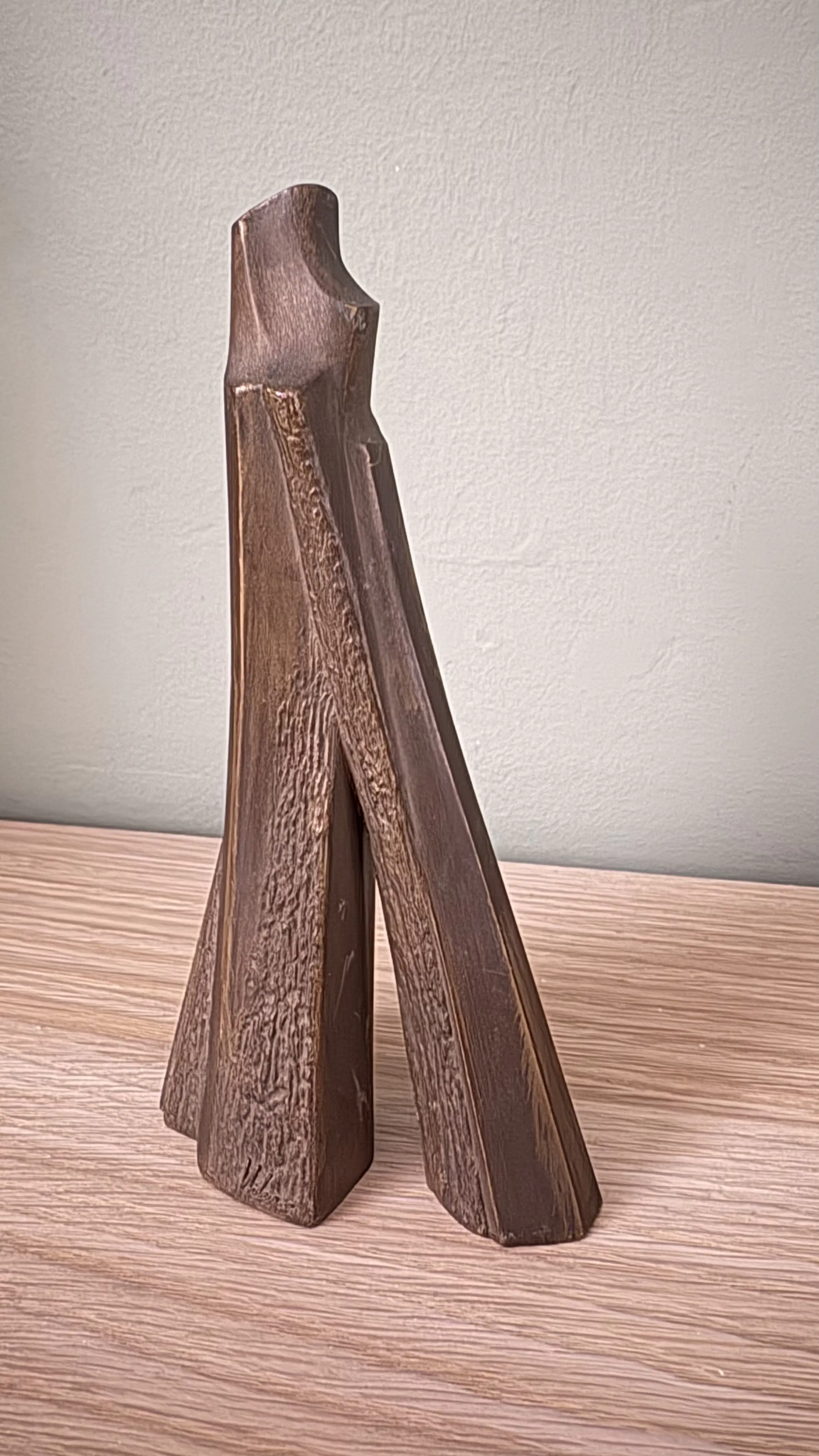 Abstract bronzen beeld 'De Geliefden' van Irene Vilar (1930-2008). Dit object, vervaardigd tussen 1945 en 1999, toont een abstracte weergave van twee figuren die elkaar omhelzen. Het massieve bronzen beeld is in goede staat en draagt een drukgesigneerde markering. Het beeld is 15 cm hoog, 7.5 cm breed en 4 cm diep. Oplage van 900 stuks.