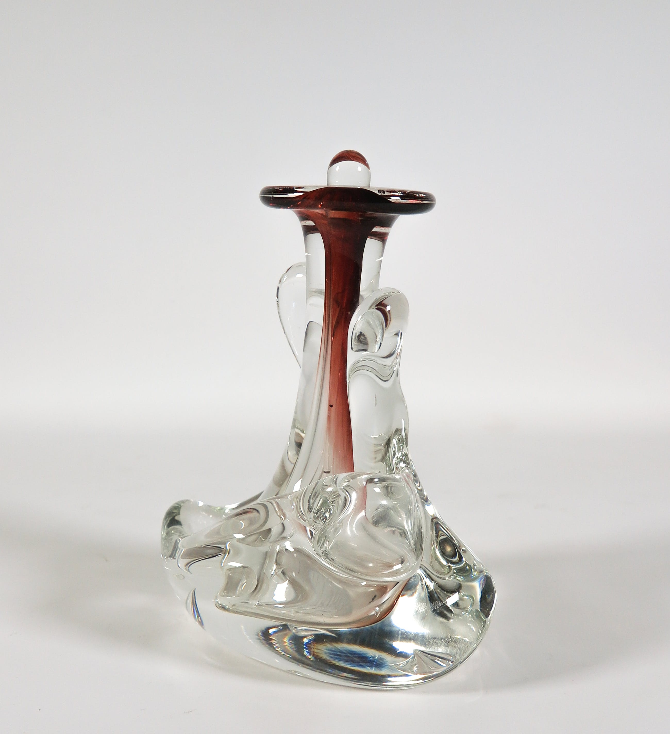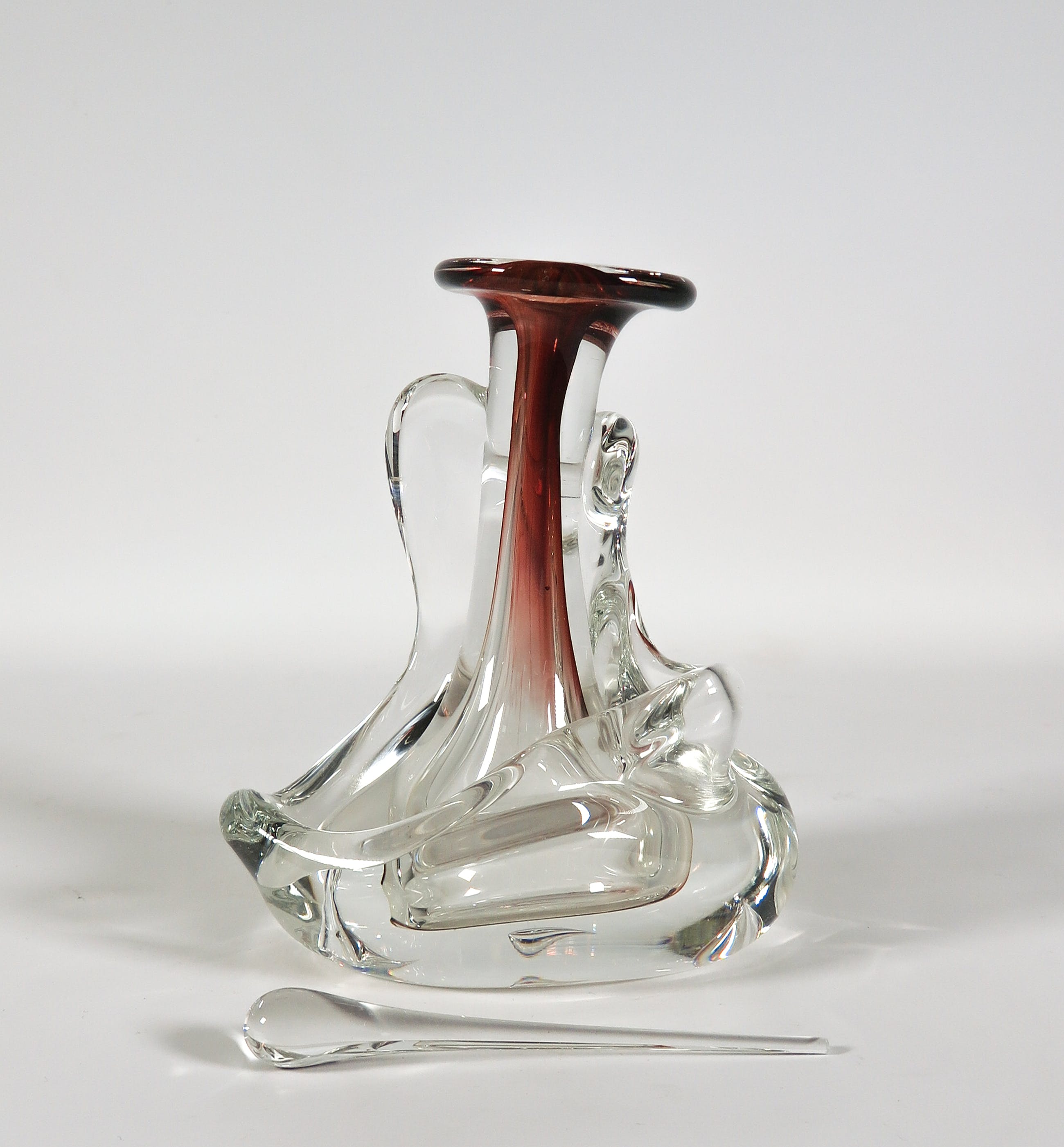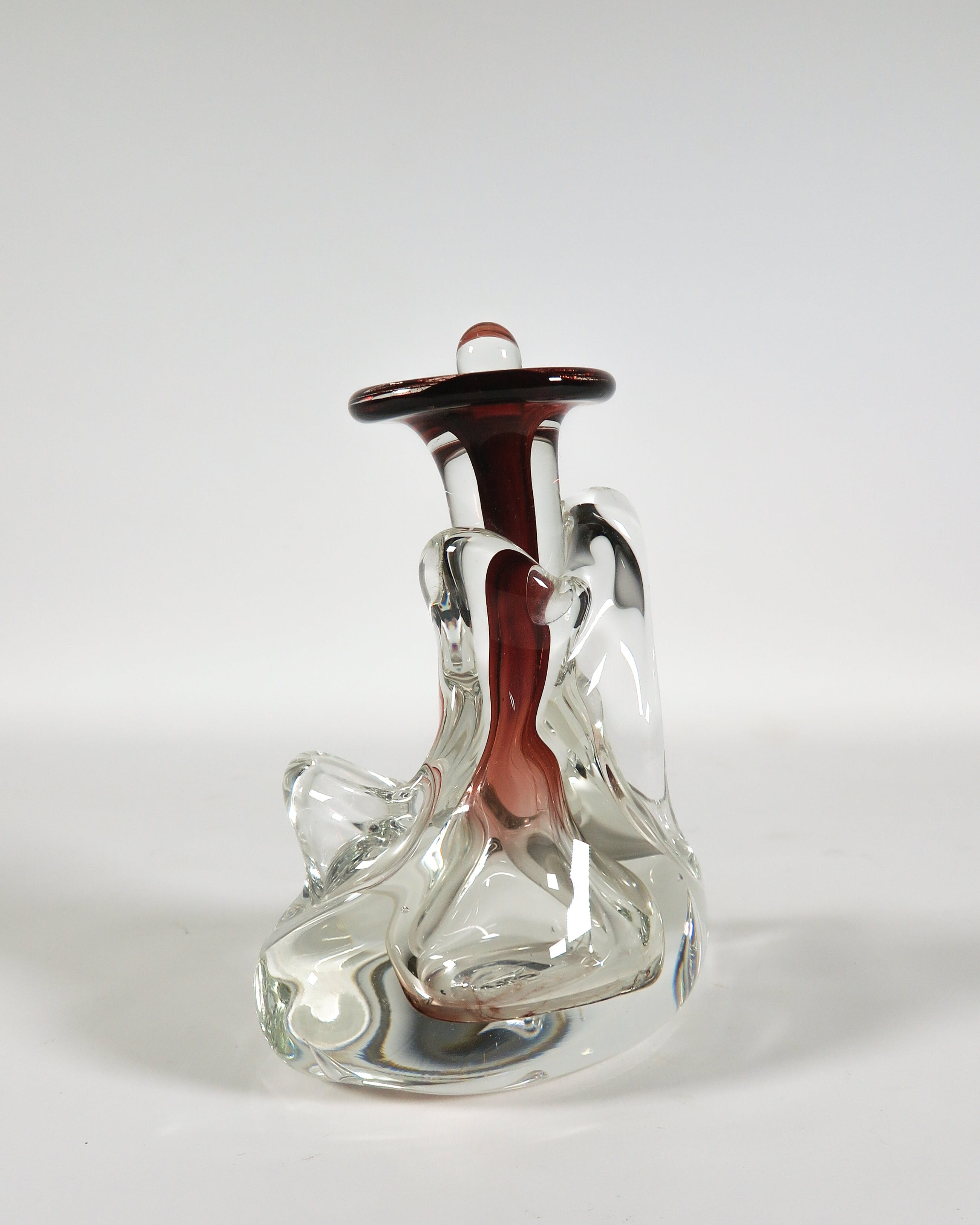 Vrijgevormde helderglazen fles met rode accenten.
