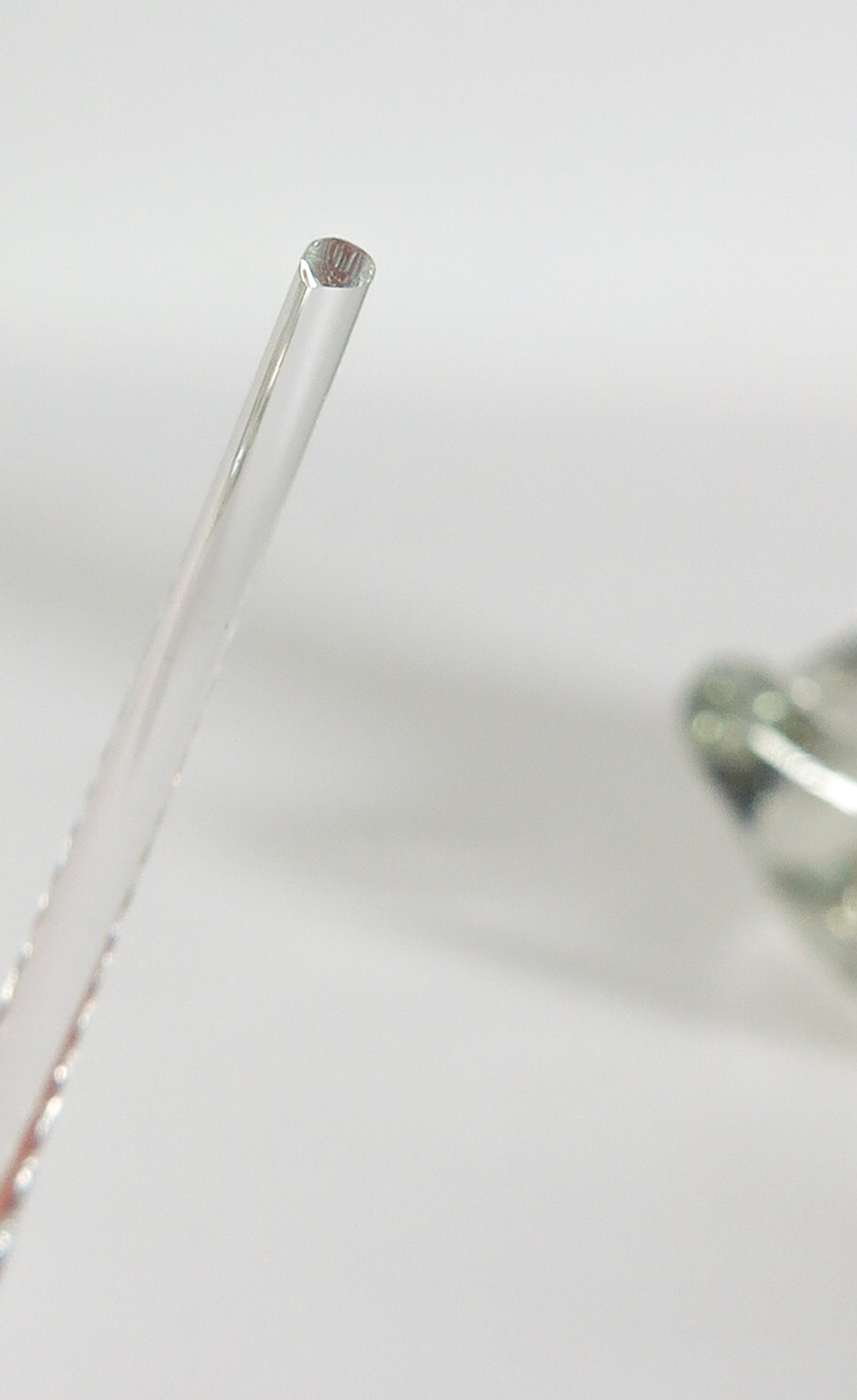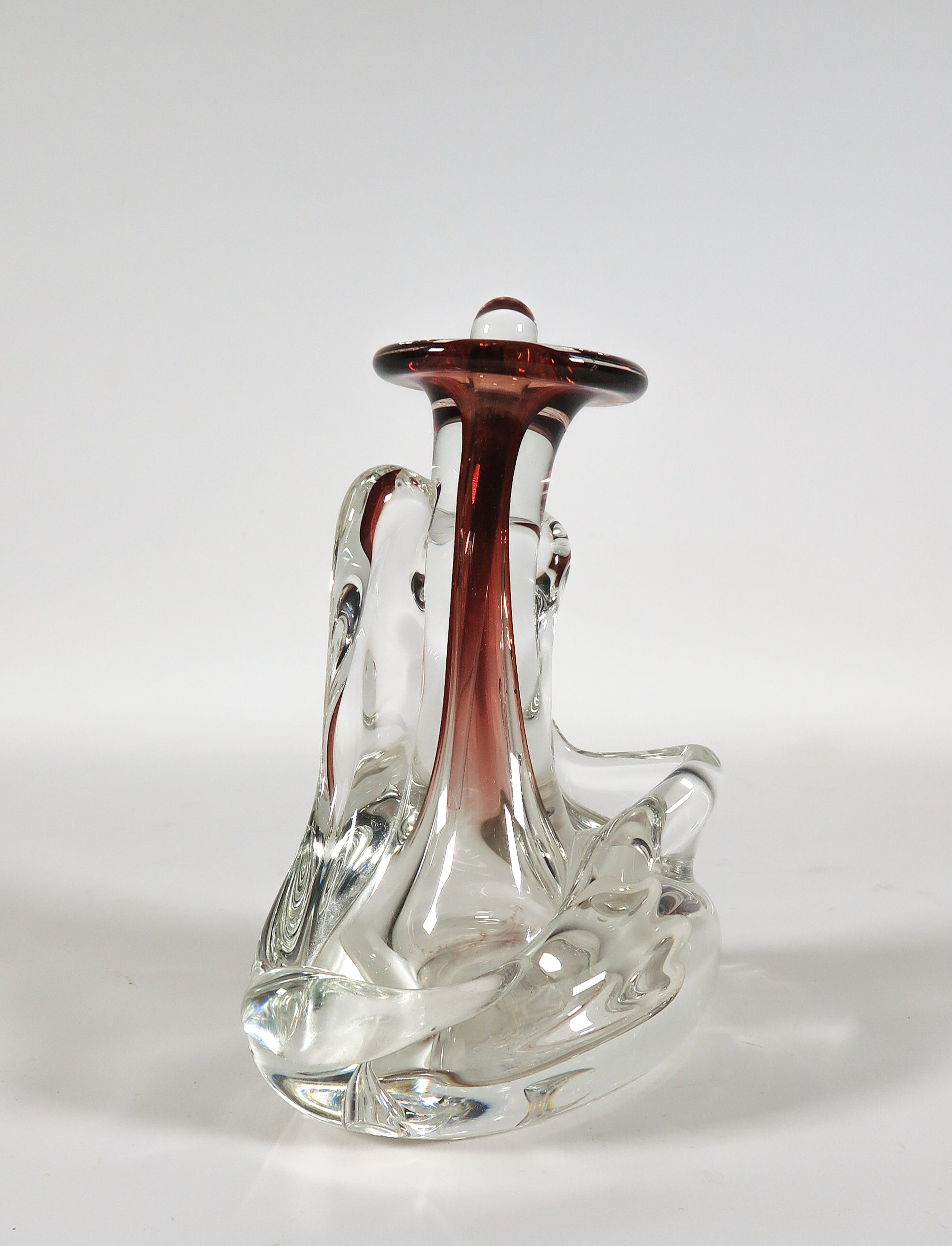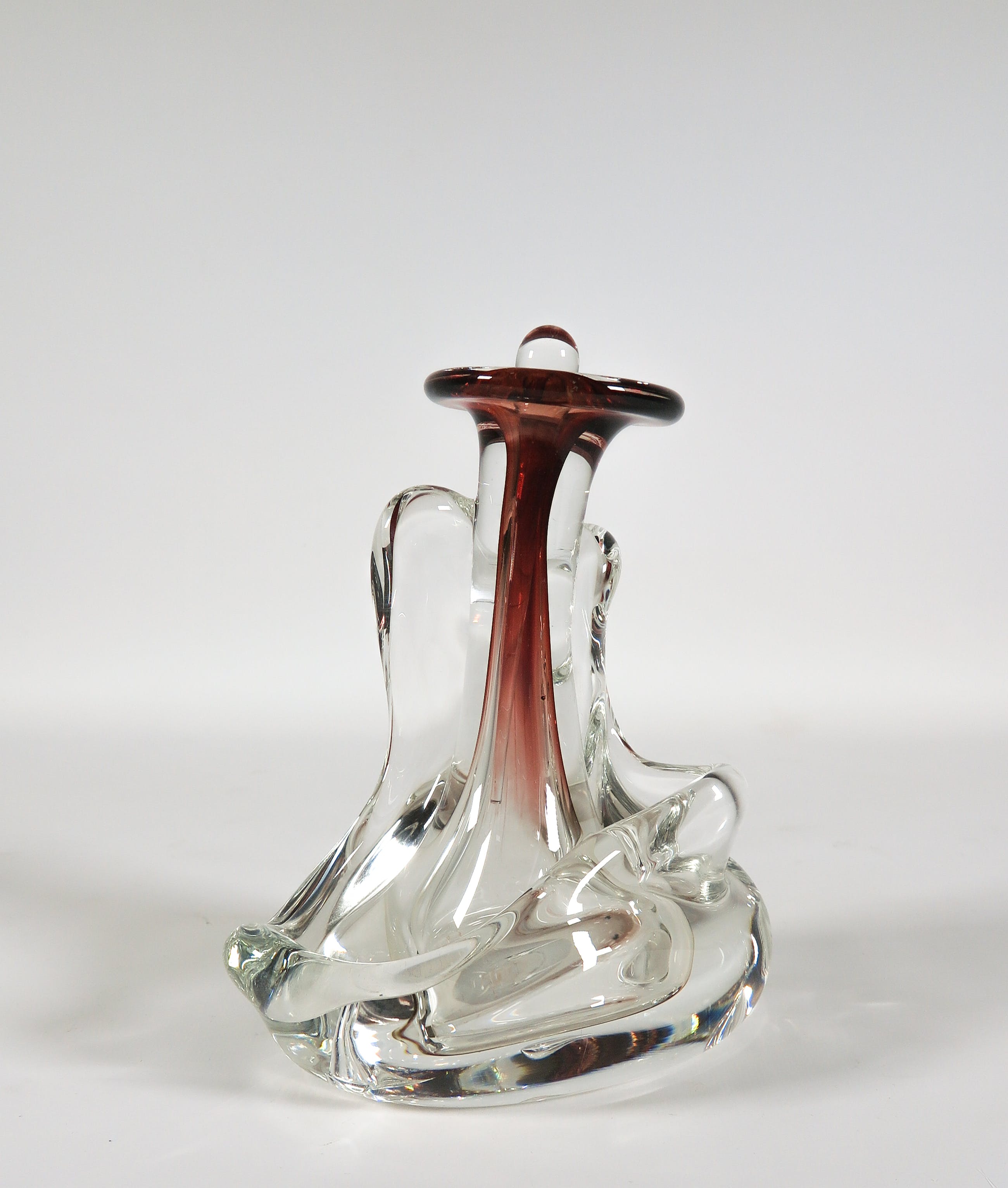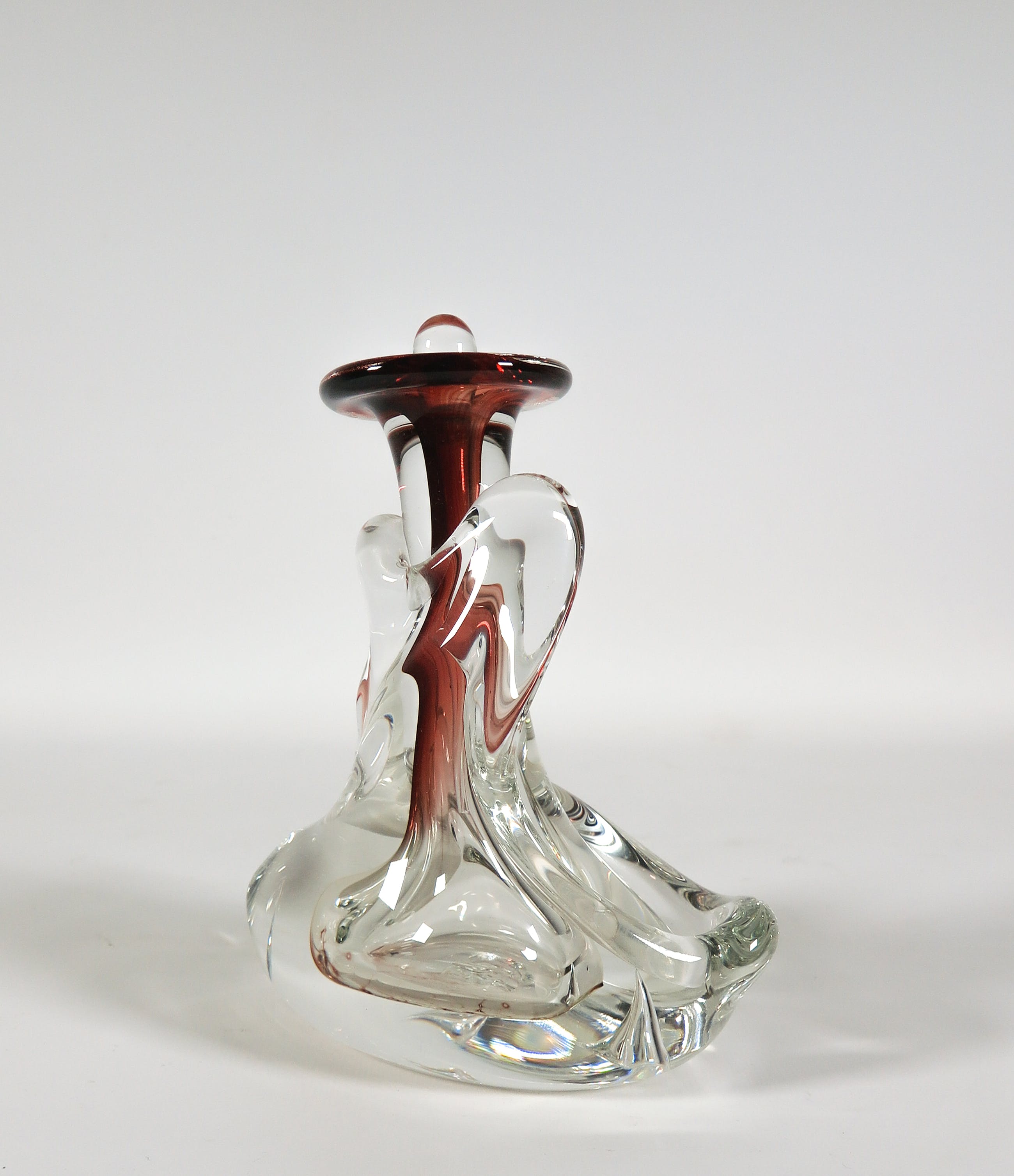 Vrijgevormde helderglazen fles met rode accenten.