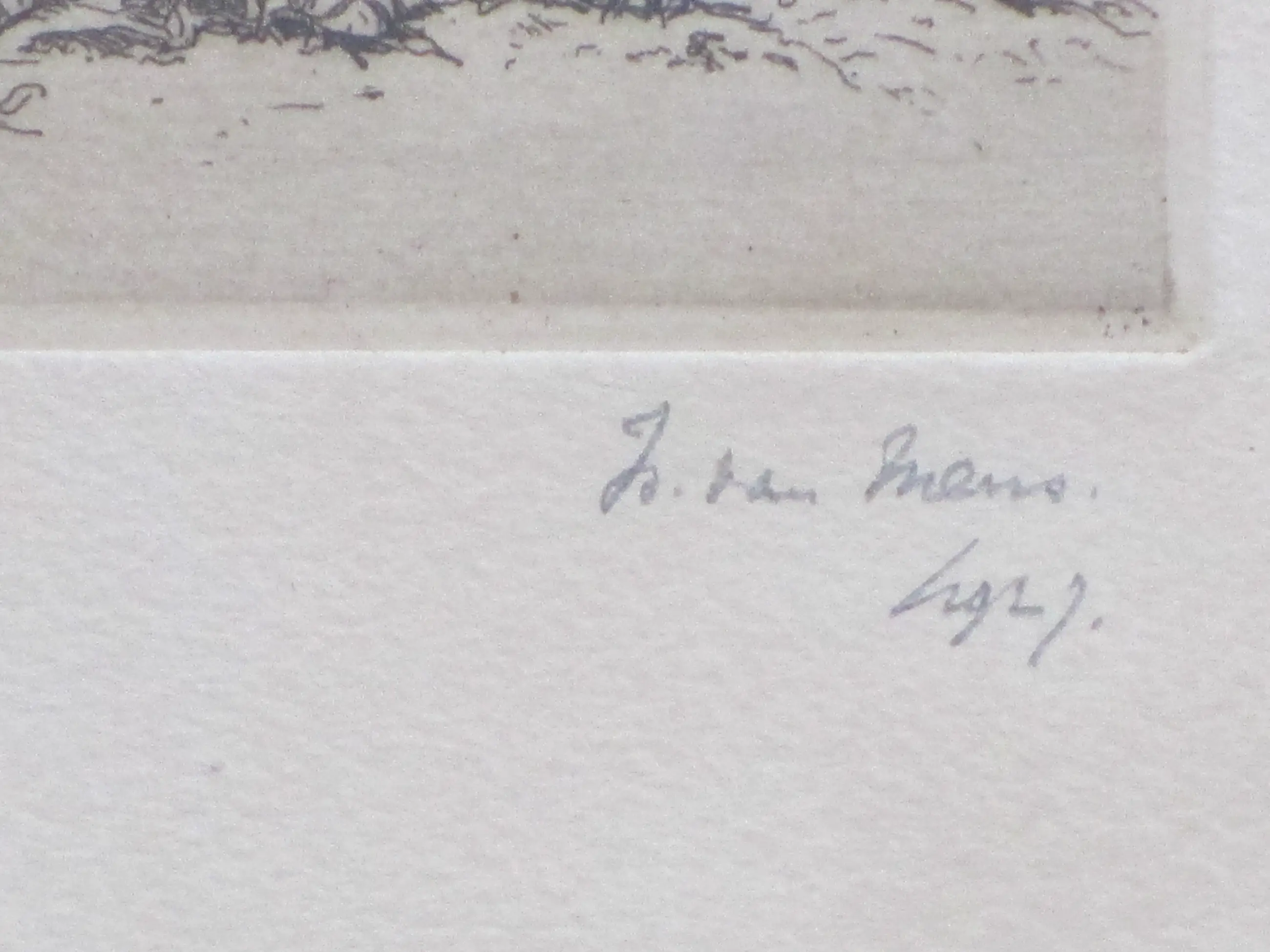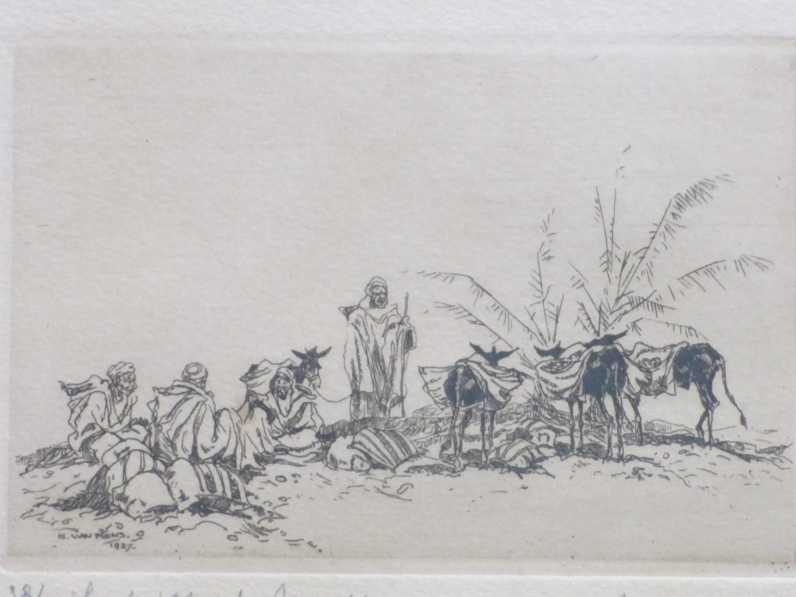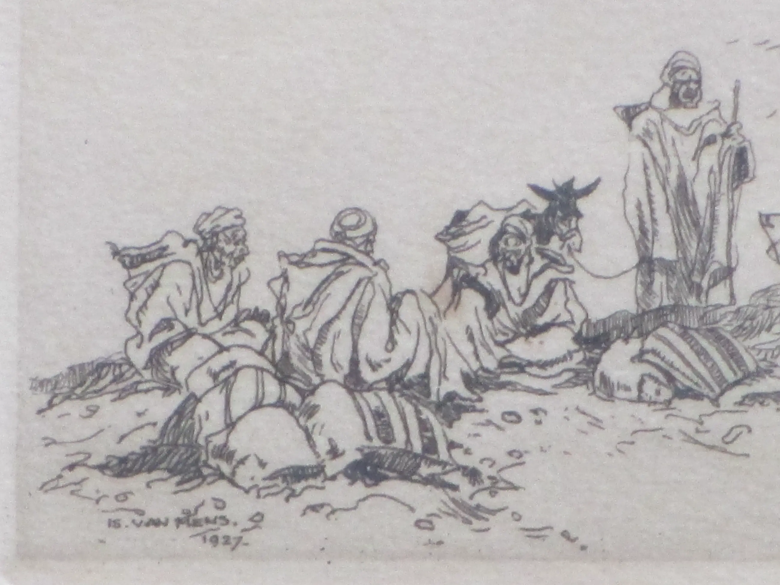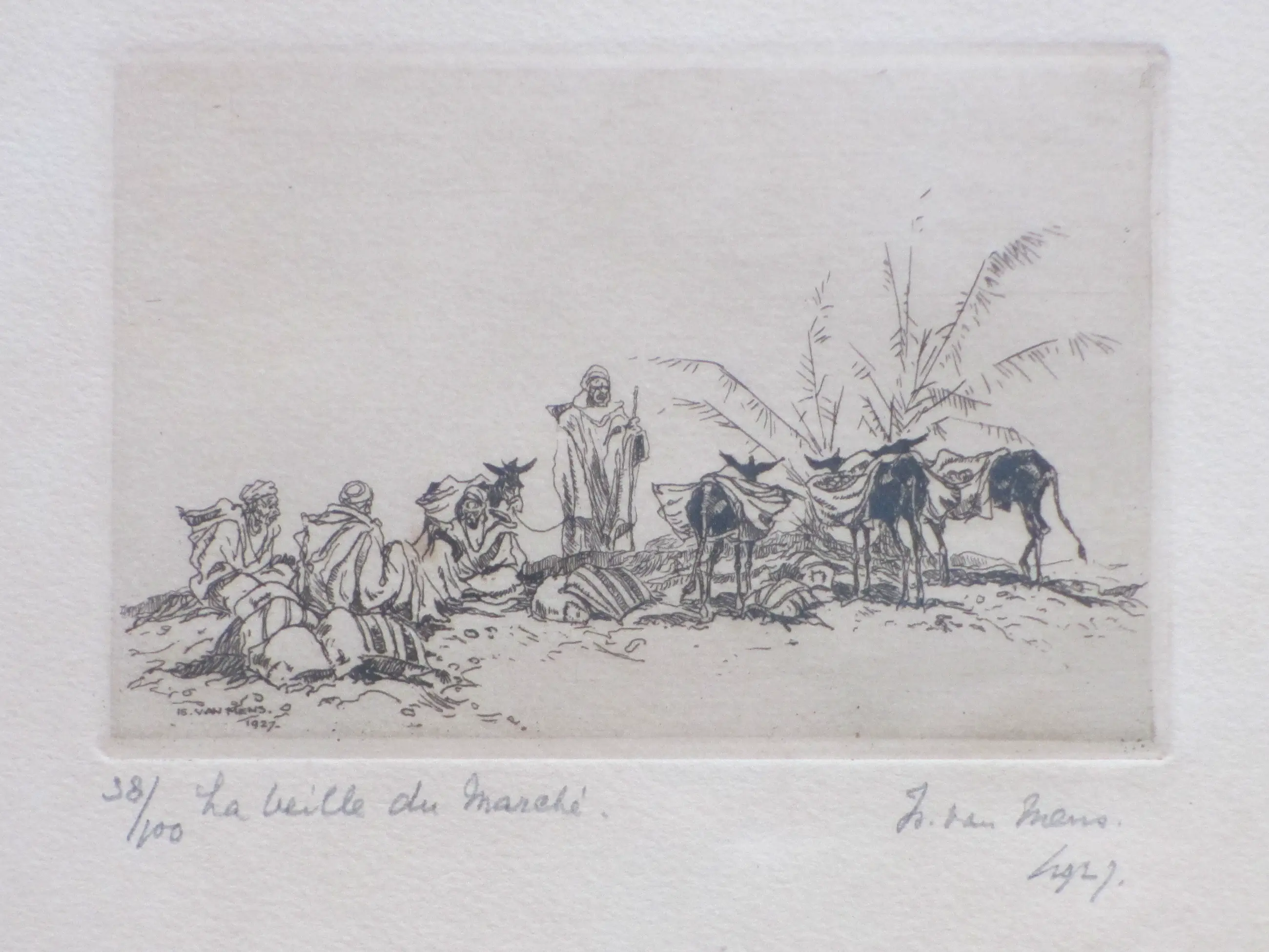 Ets door Isidore van Mens Voorstelling van de vooravond van de tocht met de ezels Gelijst, fraai getsoken origineel lijstje. Beeldmaat 8x11.5, lijstmaat 19x25 Gesigneerd en gedateerd in potlood r.o.: 'Is. van mens 1927' Genummerd en getiteld in potlood l.o.: '38/100 La veille du marché' Authenticiteit volledig gegarandeerd