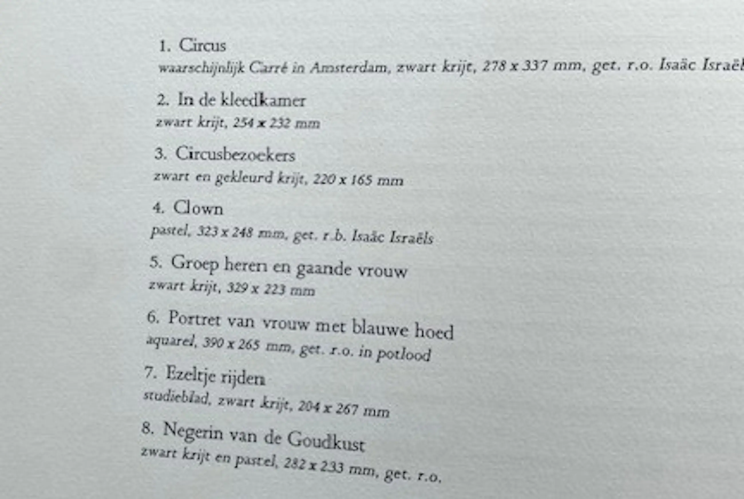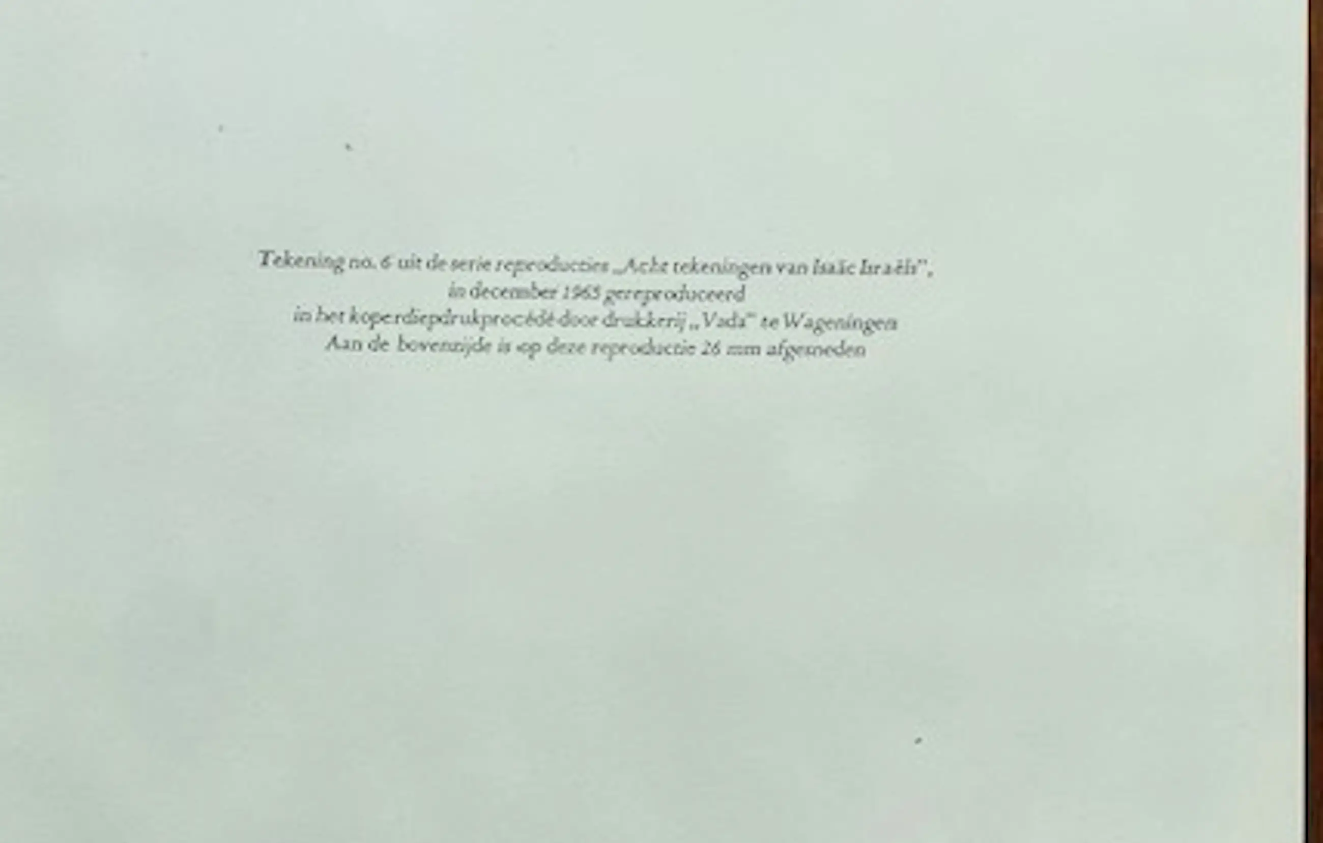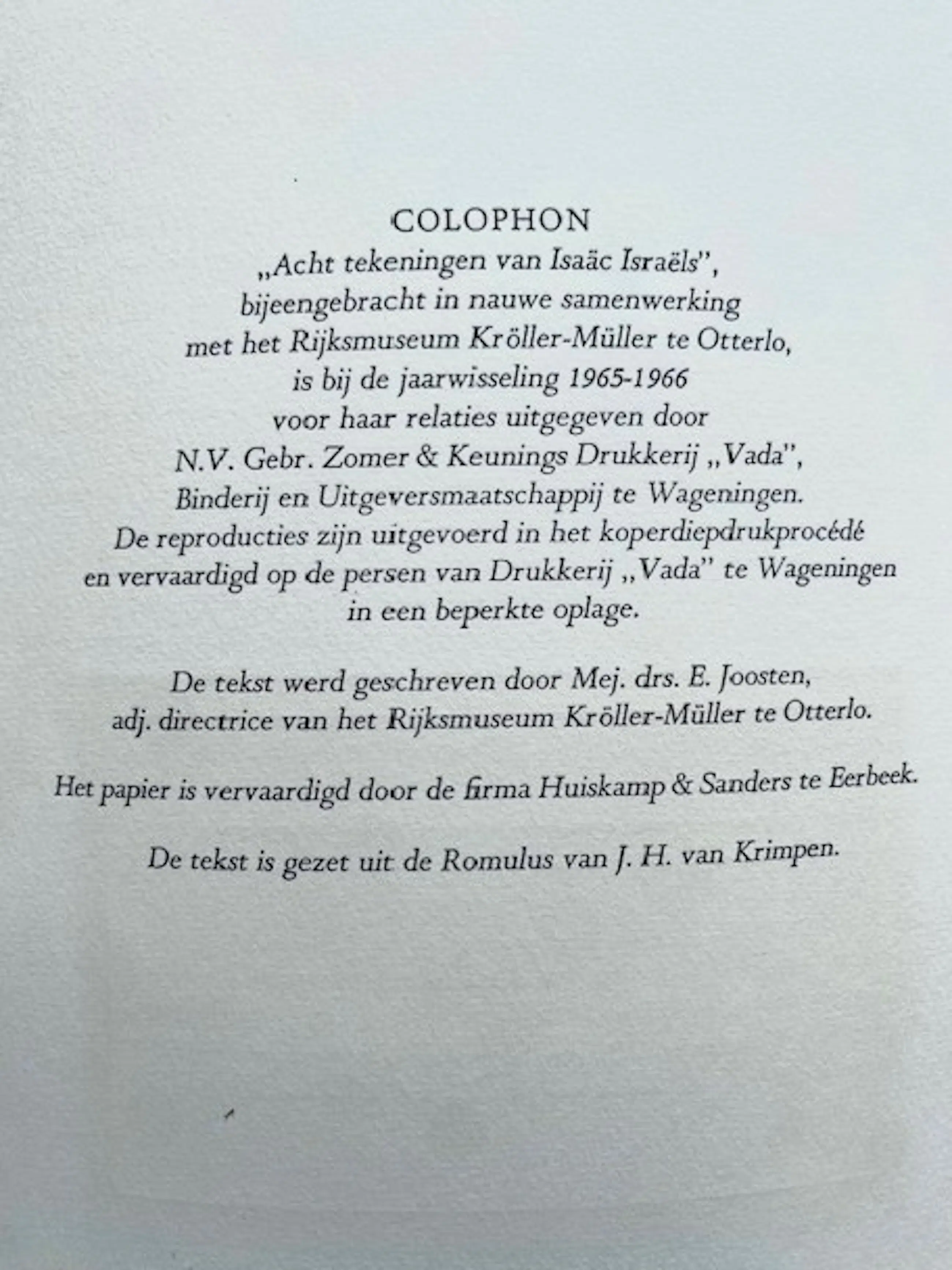 Deze map met 8 tekeningen van Isaac Israels dateert van de jaarwisseling 1965-1966. Toen heeft uitgever Gebr. Zomers en Keuning (drukkerij Vada) in nauwe samenwerking met het Rijks Museum Kröller Müller te Otterlo, deze map uitgegeven. De tekeningen zijn uitgevoerd dmv het koperdiepdrukprocedé (gravures). De map betrof een gelimiteerde oplage uitsluitend voor relaties van de uitgeverij / drukkerij.