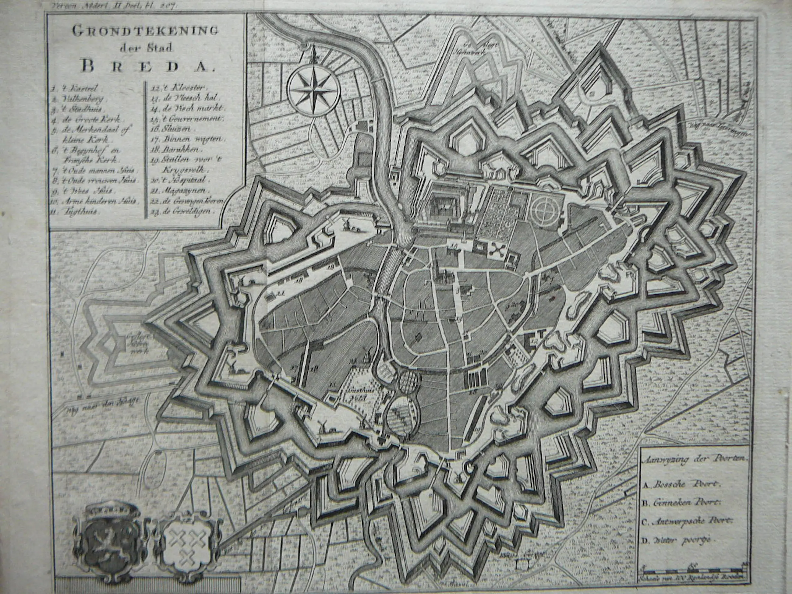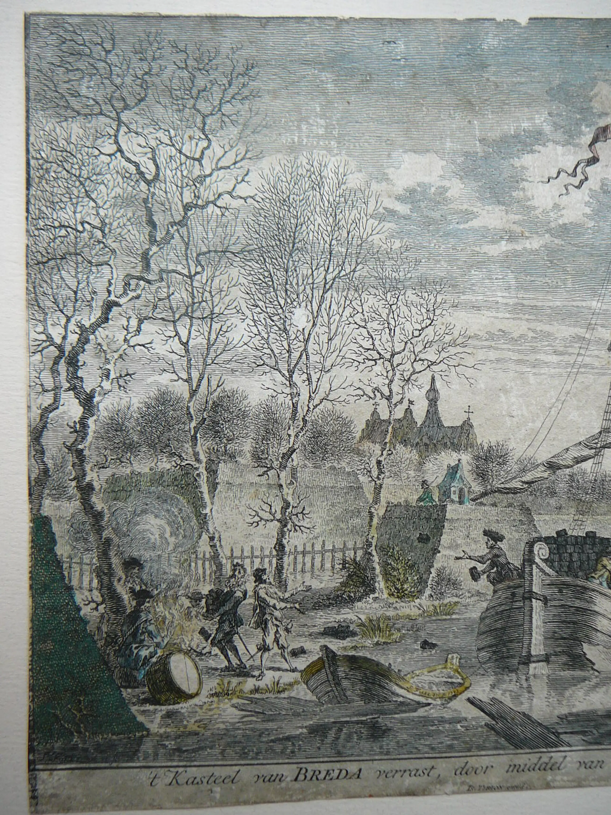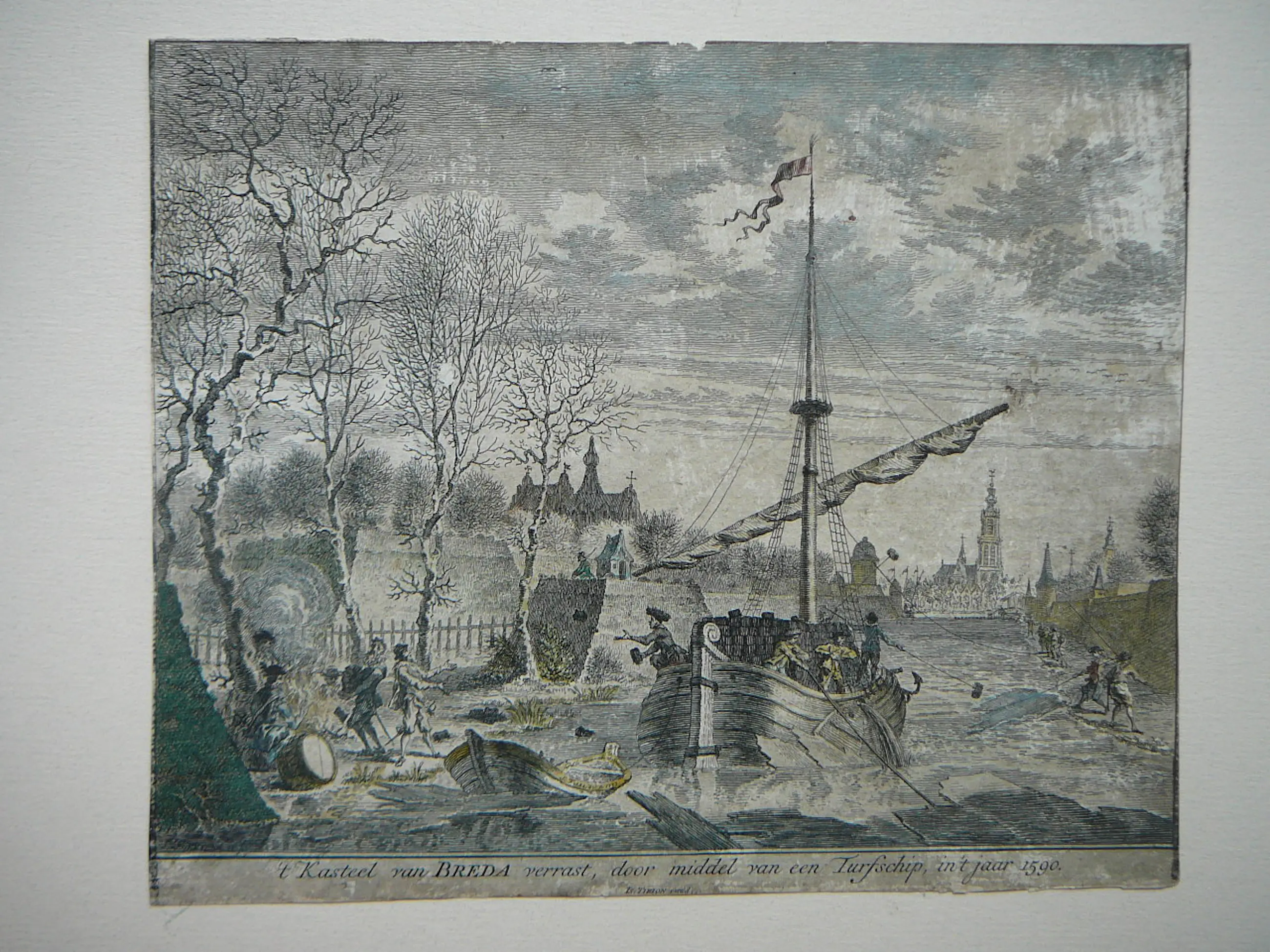 1 Grondtekeing der Stad Breda Door Isaak Tirion 1745 afm 16 x 19,3 cm 2 t Kasteel van Breda verrast , door middel van een Turfschip , in t jaar 1590 - ca. 1770