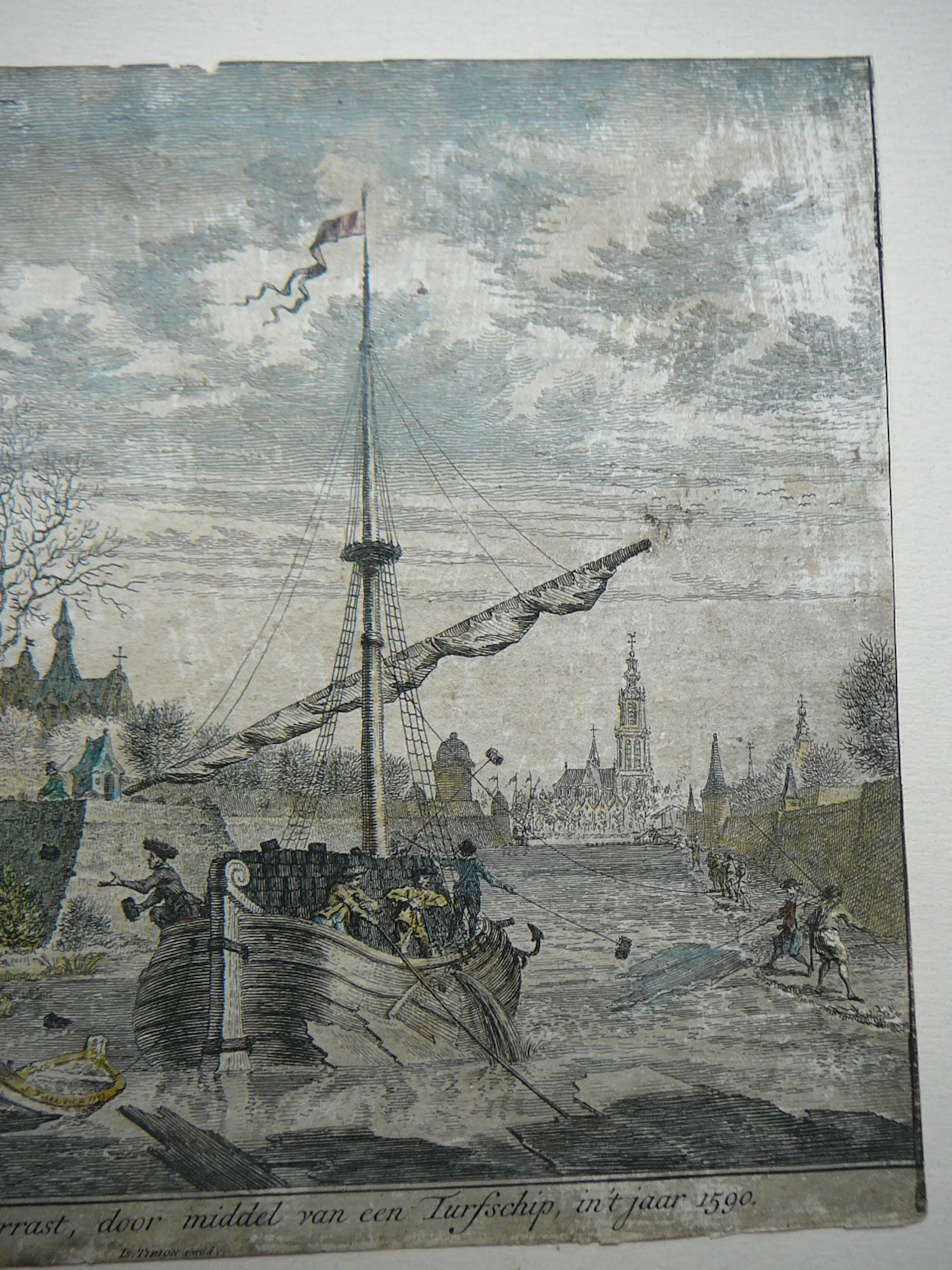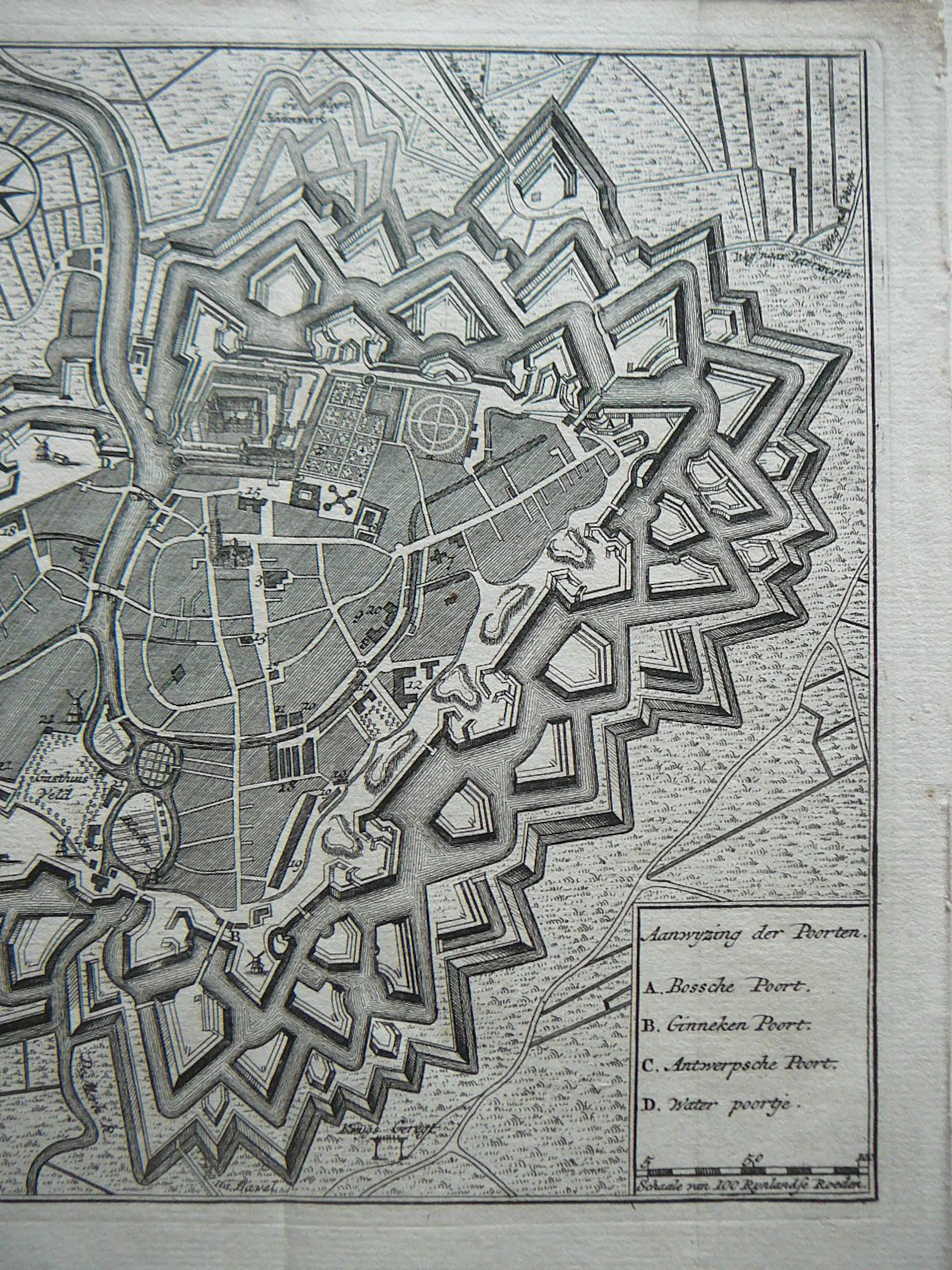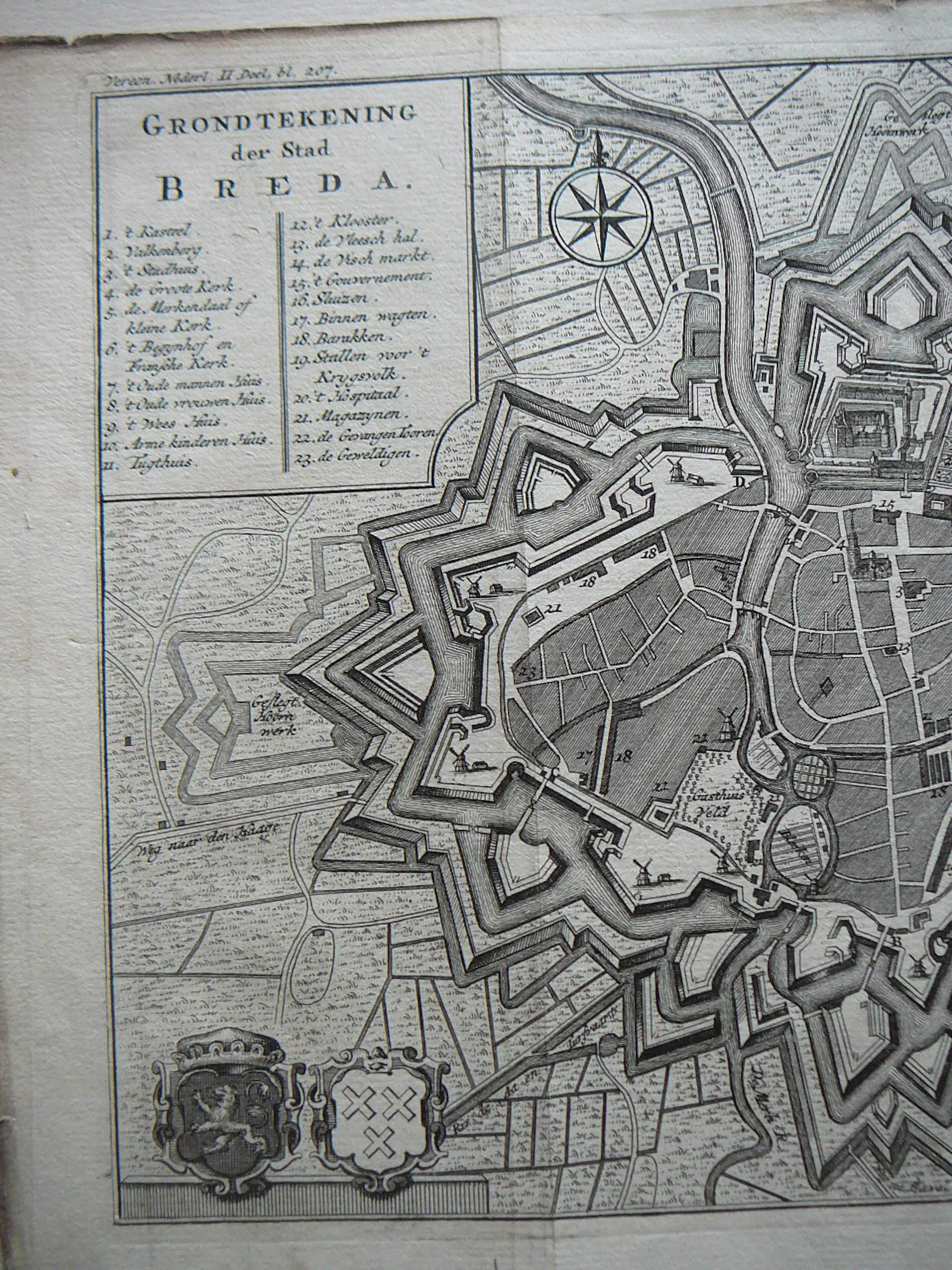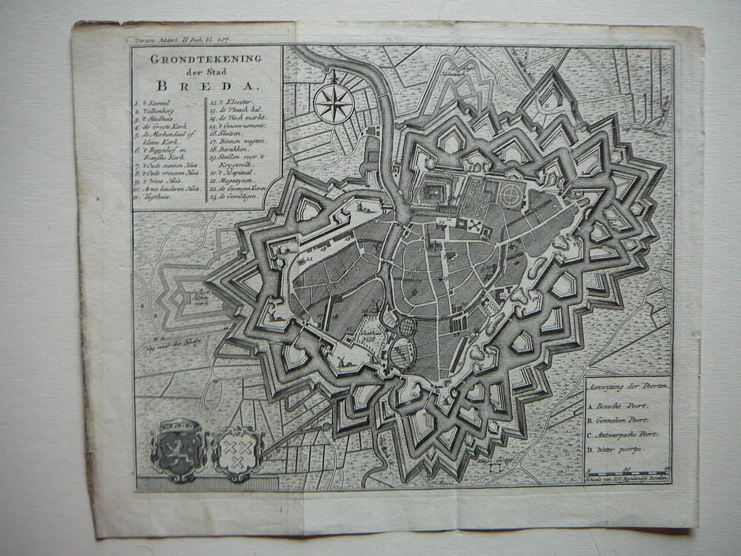 1 Grondtekeing der Stad Breda Door Isaak Tirion 1745 afm 16 x 19,3 cm 2 t Kasteel van Breda verrast , door middel van een Turfschip , in t jaar 1590 - ca. 1770