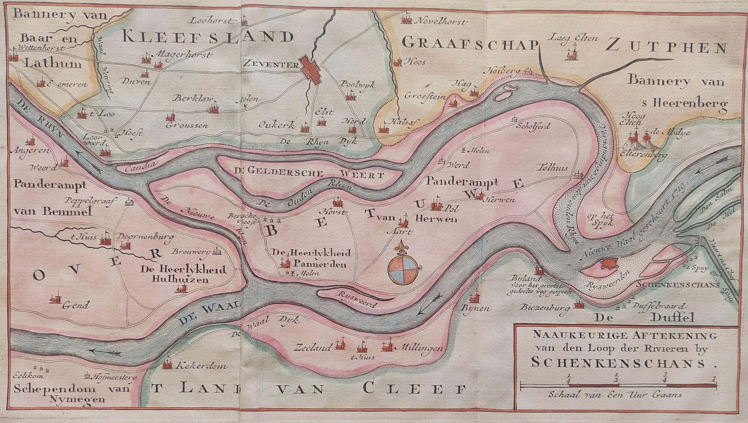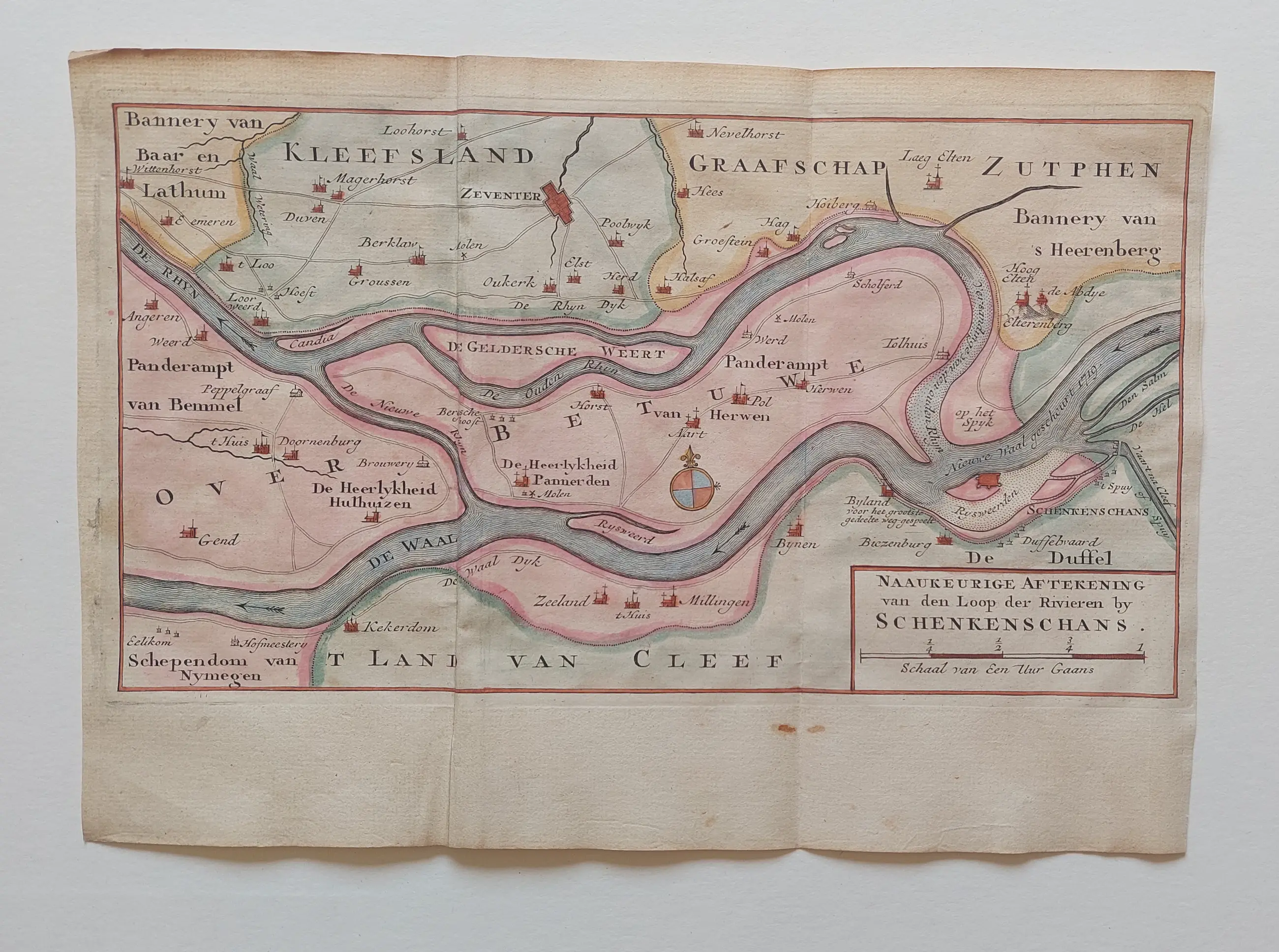 Titel rechtsonder; in het midden een windroos. Schenkenschans behoorde eerder tot Nederland. Thans behoort de plaats bij Duitsland en is de naam Schenkenschanz.