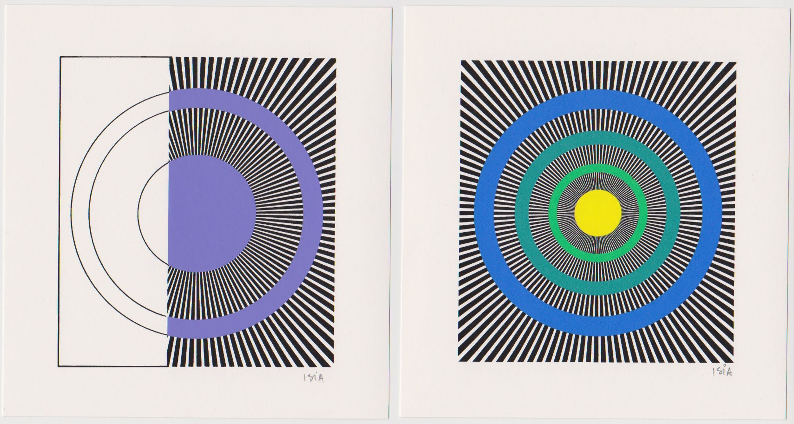 Twee fraaie handgesigneerde lithografien van Isia Leviant. Titels: Geometrische Composities I en II. Afmetingen: 15 x 14 cm.