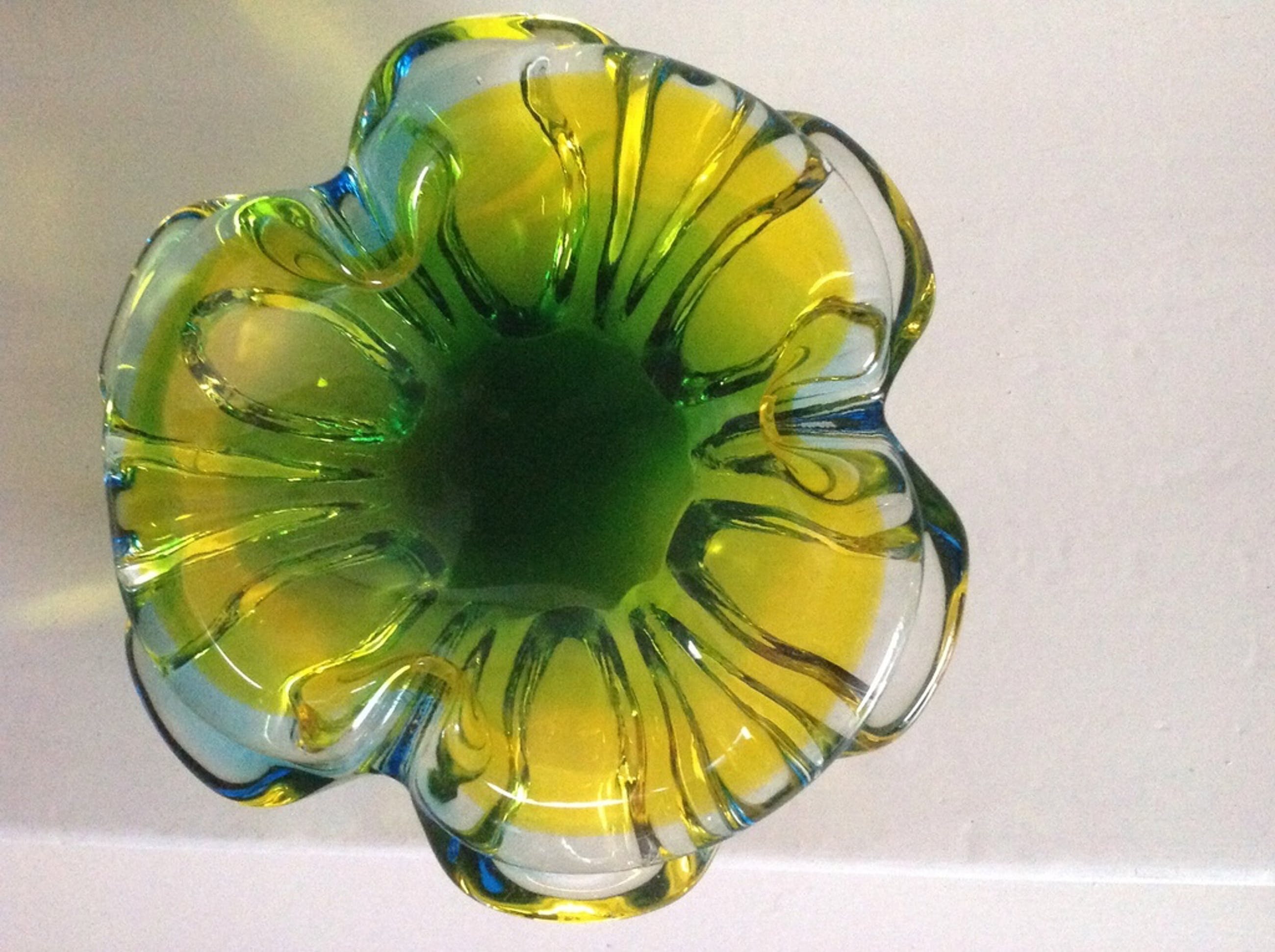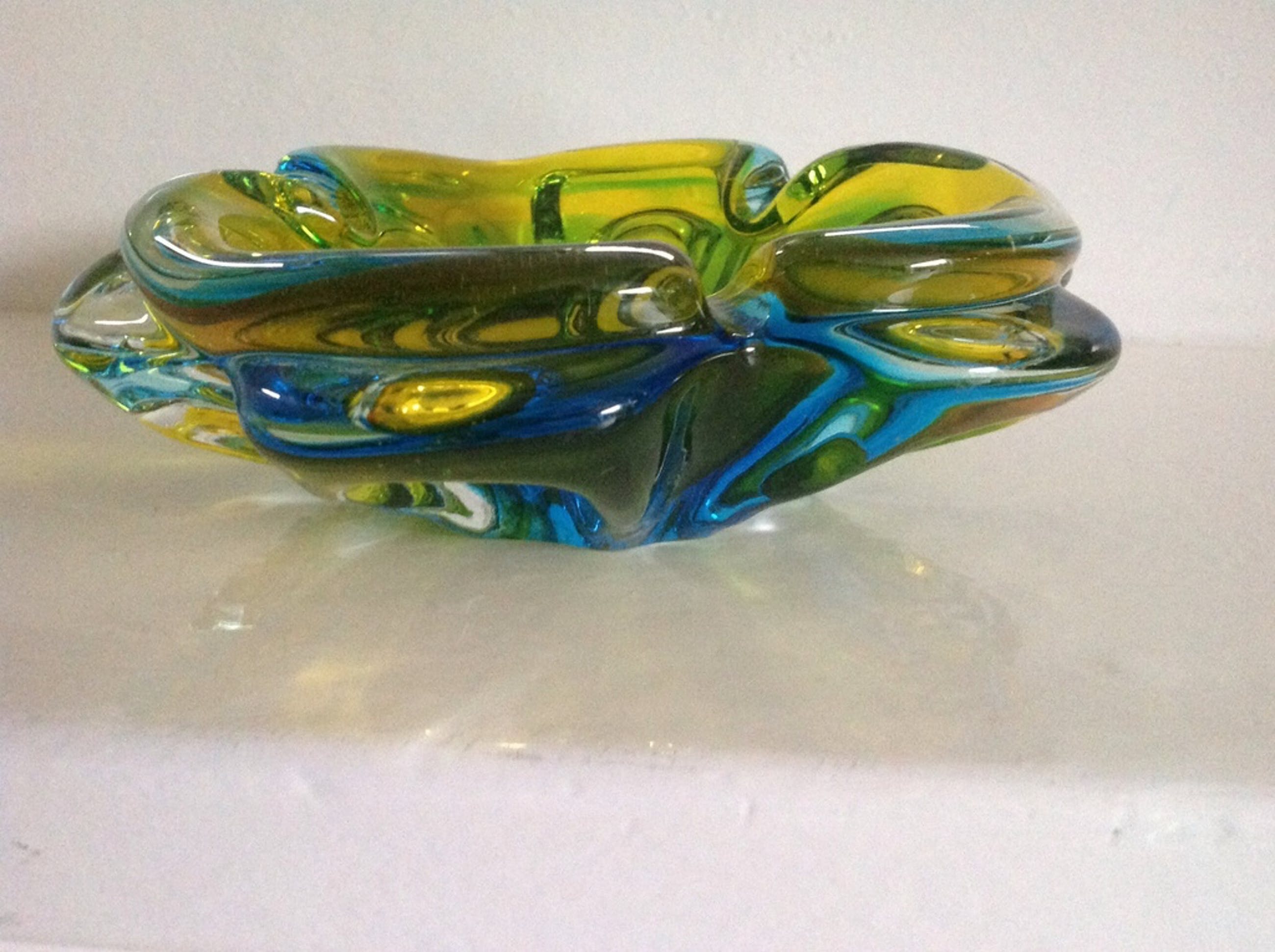 Mooie kleurstelling van geel groen blauw deze Italiaanse asbak met een doorsnede van 19,5 cm en een hoogte van 6 cm. Heeft gebruikssporen zoalskrasje op voetstuk onder.