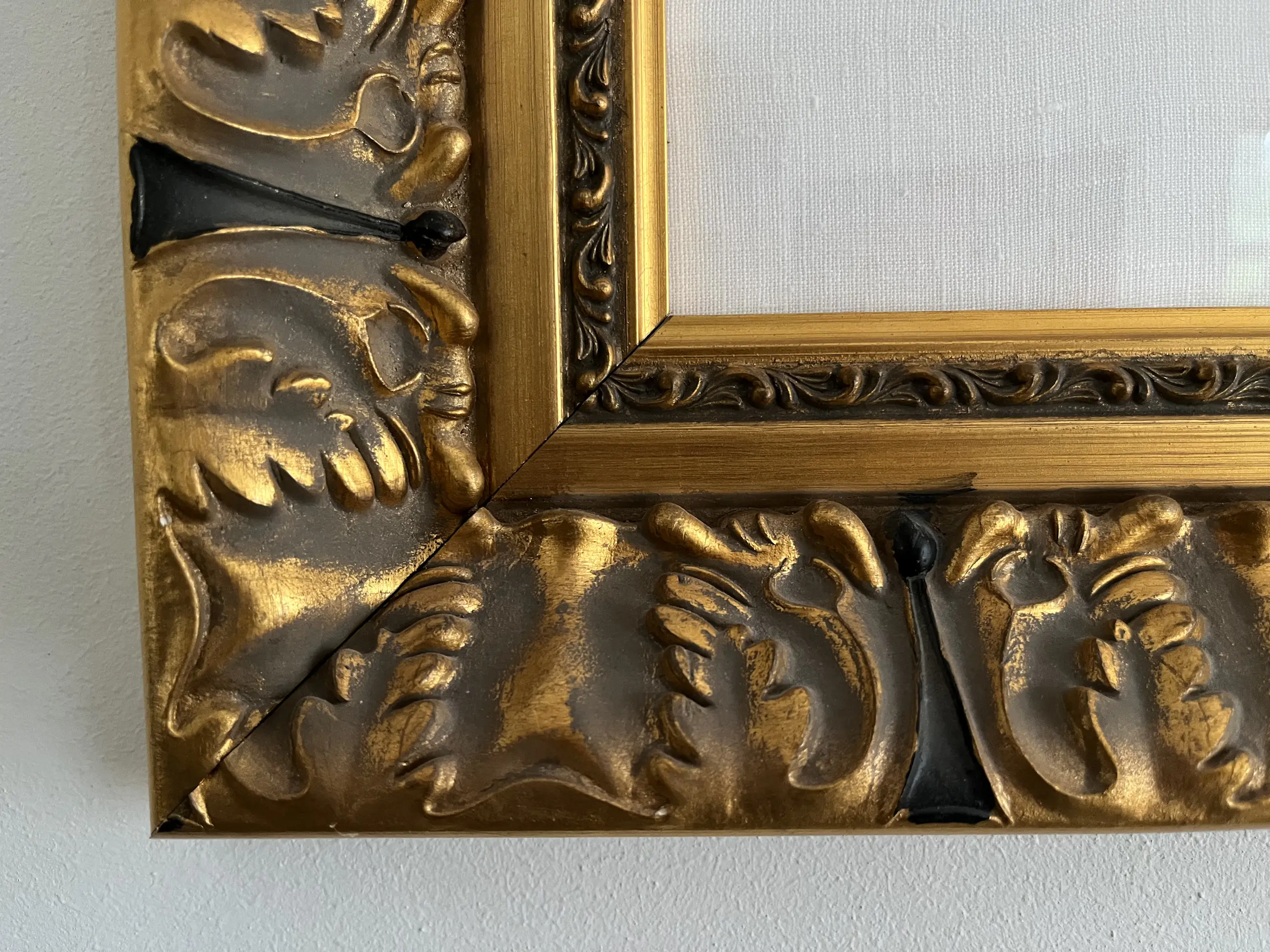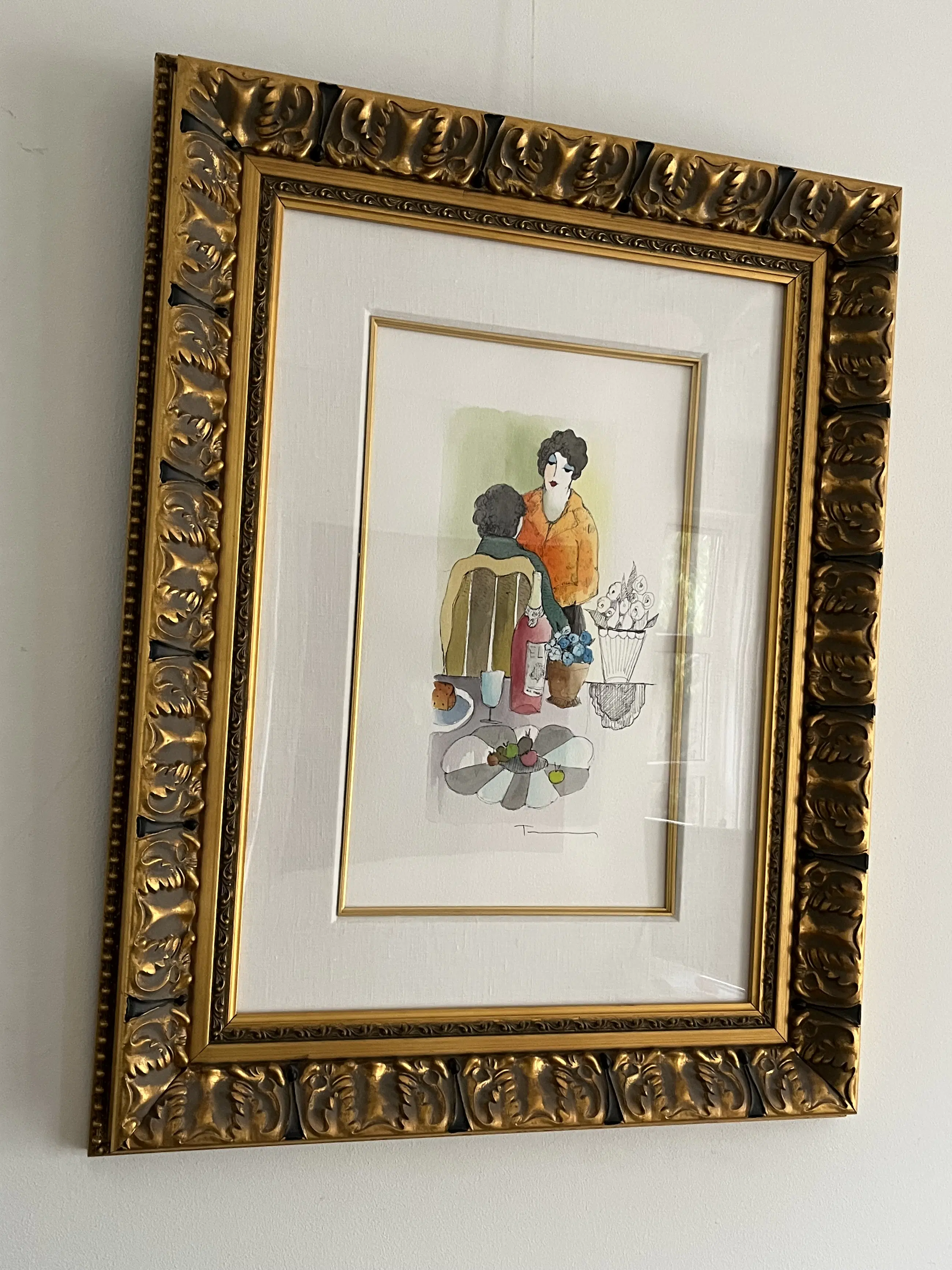 Romantisch, sfeervol tafereel gelijst in monumentale, goudkleurige lijst. Lijst heeft minimale gebruikssporen, welke in de bewerkte lijst niet of nauwelijks opvallen.