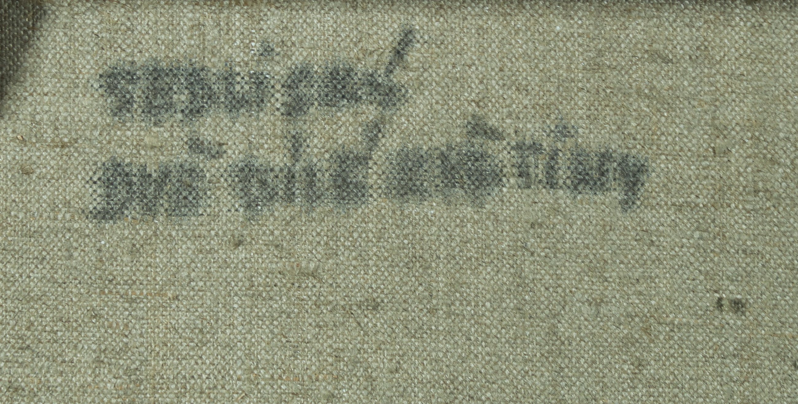 | Een paar lichte beschadigingen in de bovenste deel van de voorstelling. Het doek zit iets los in de lijst. | |