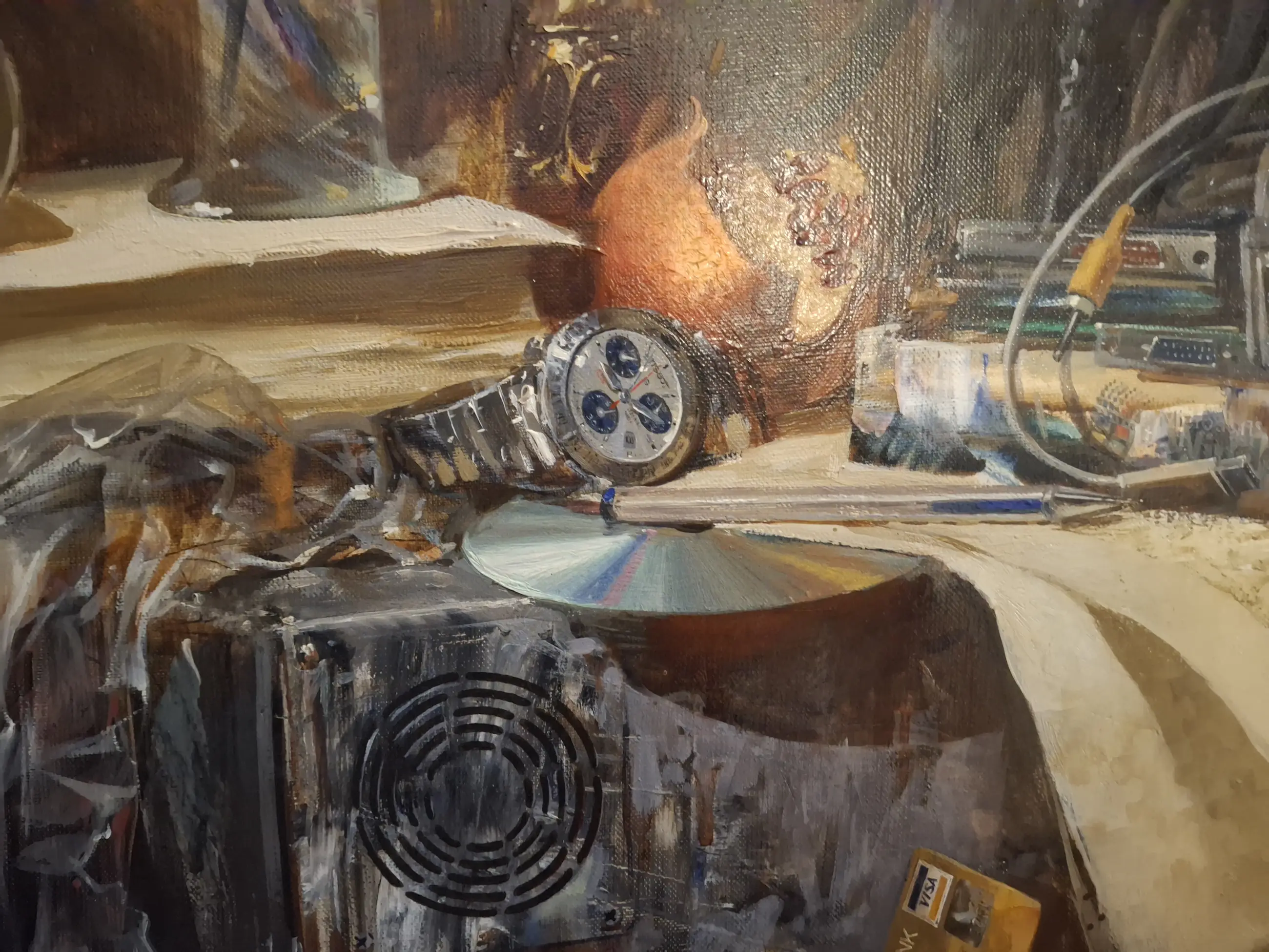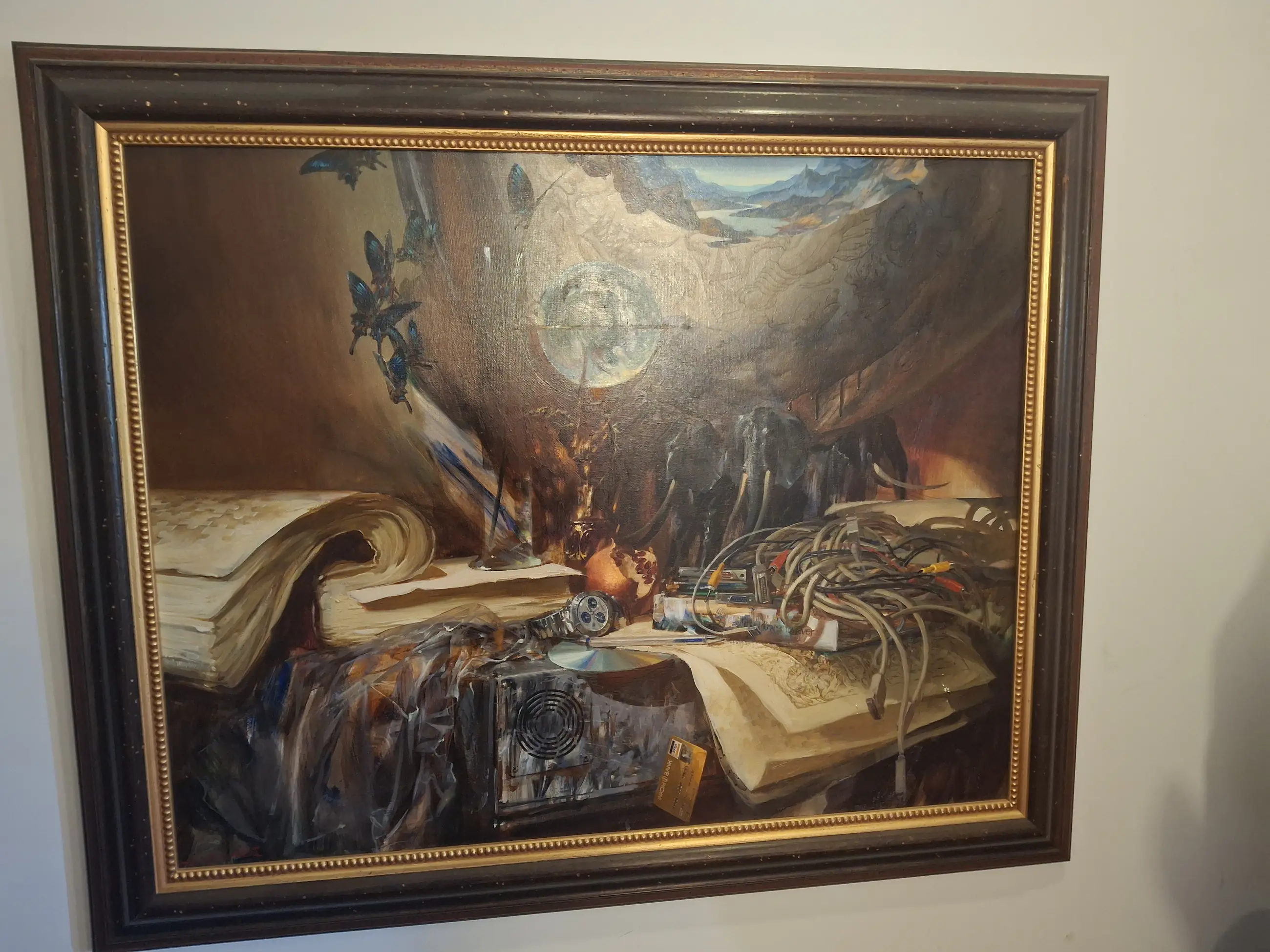 Bijzonder intrigerend schilderij. Elke keer als je kijkt zie je iets nieuws t blijft intrigerend. Het is door de taxateur bekeken en is met deze prijs gekomen. Ik heb ervan genoten maar ga nu verhuizen waardoor t helaas niet meer passend is