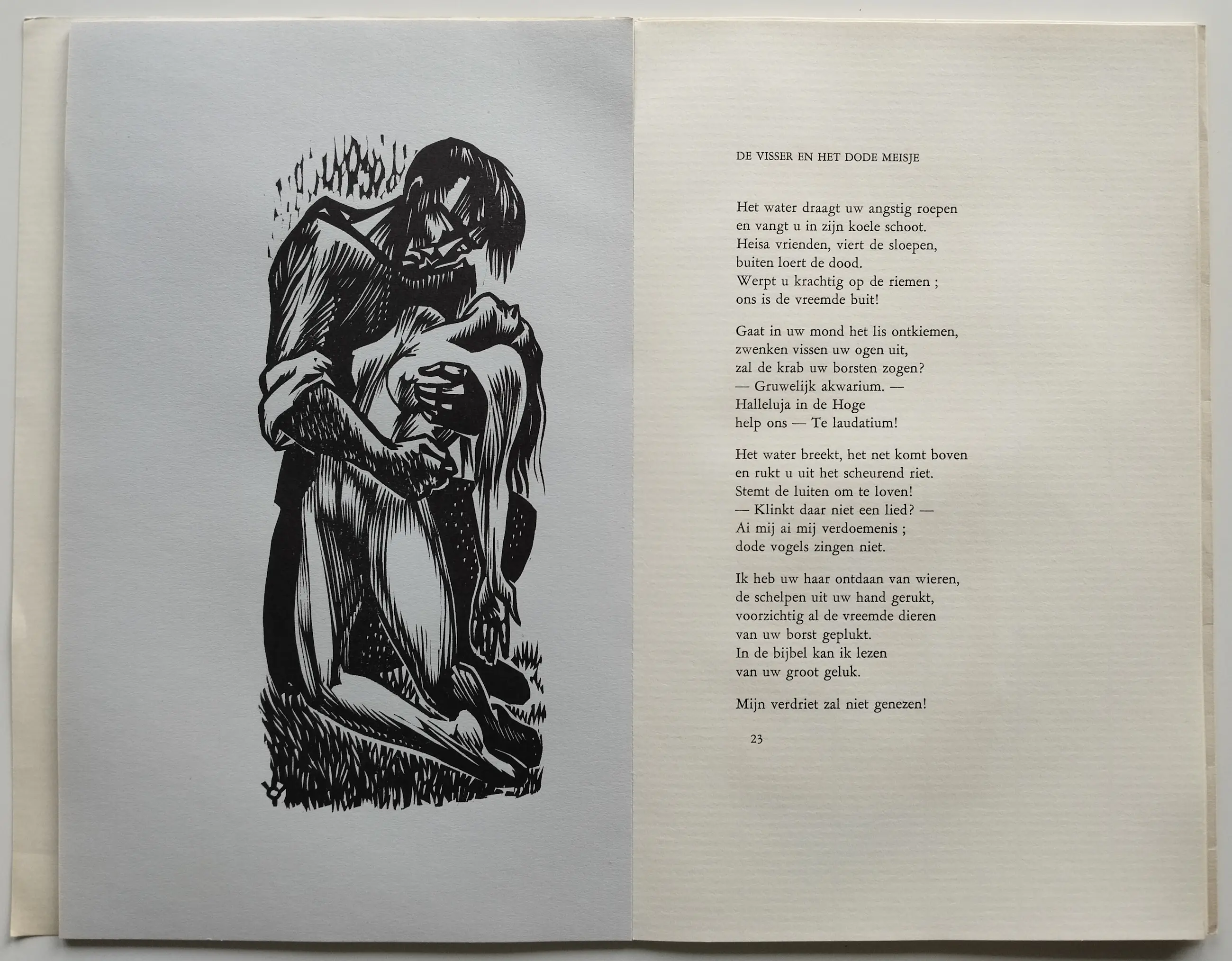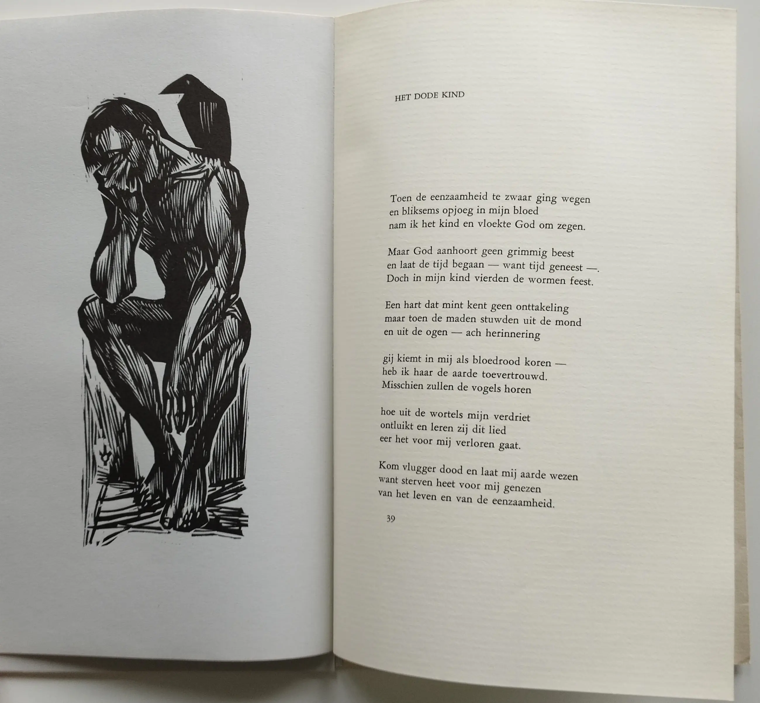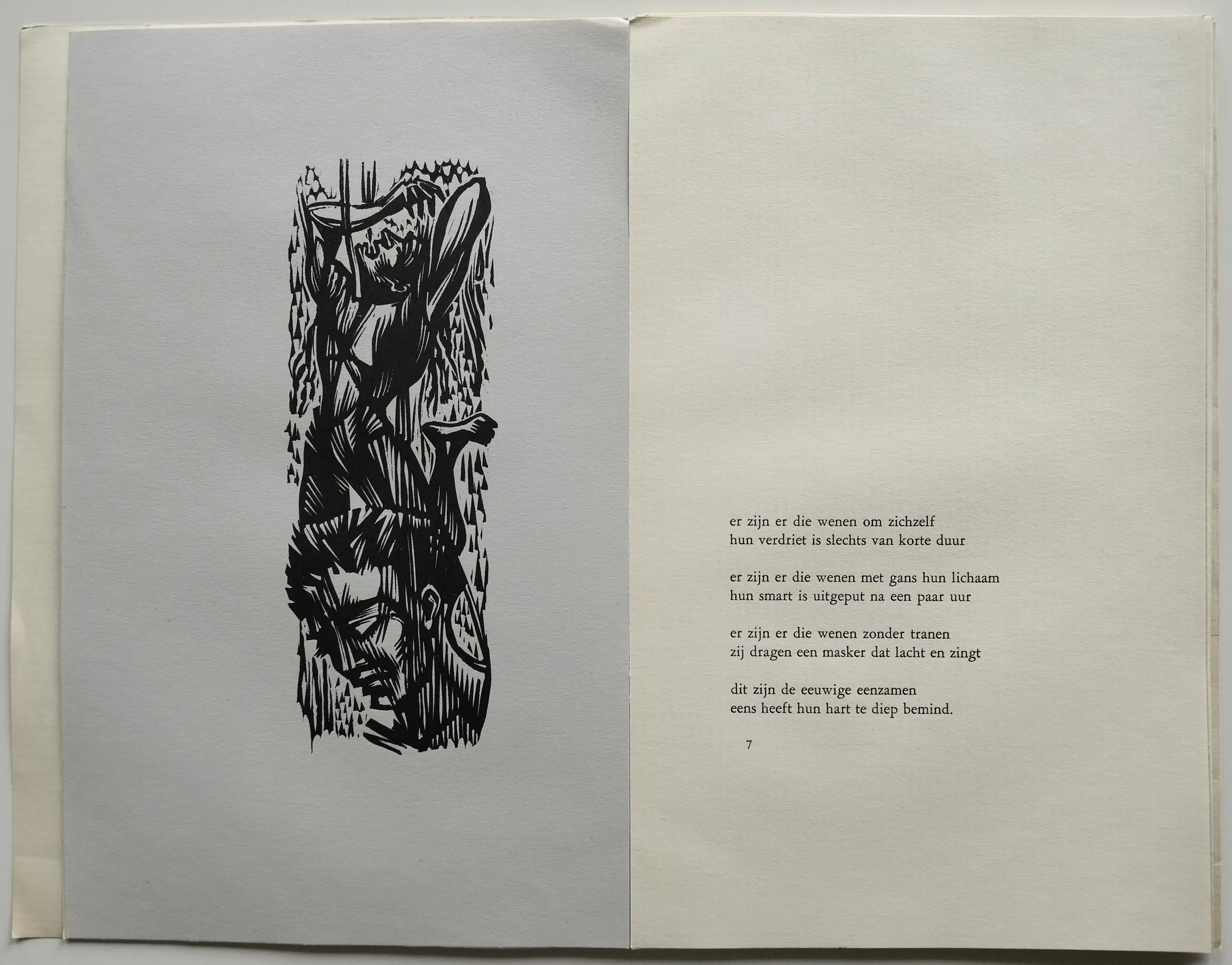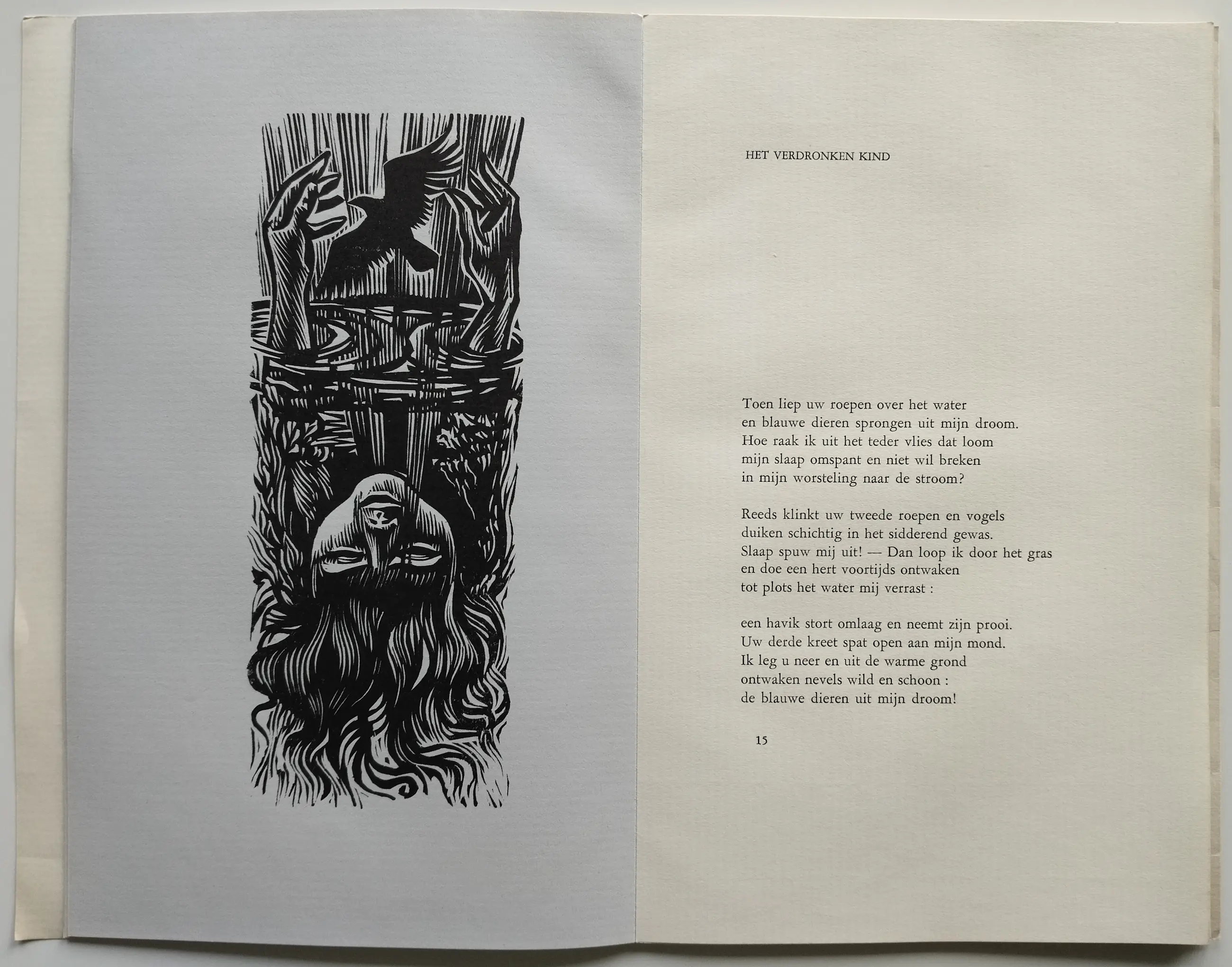 Op de kaft zitten wat vlekjes en wat kleine vouwtjes en kreukjes. De inhoud zit los in de kaft en is niet meer 1 geheel. De houtsneden en tekst bladen zijn in prima staat.