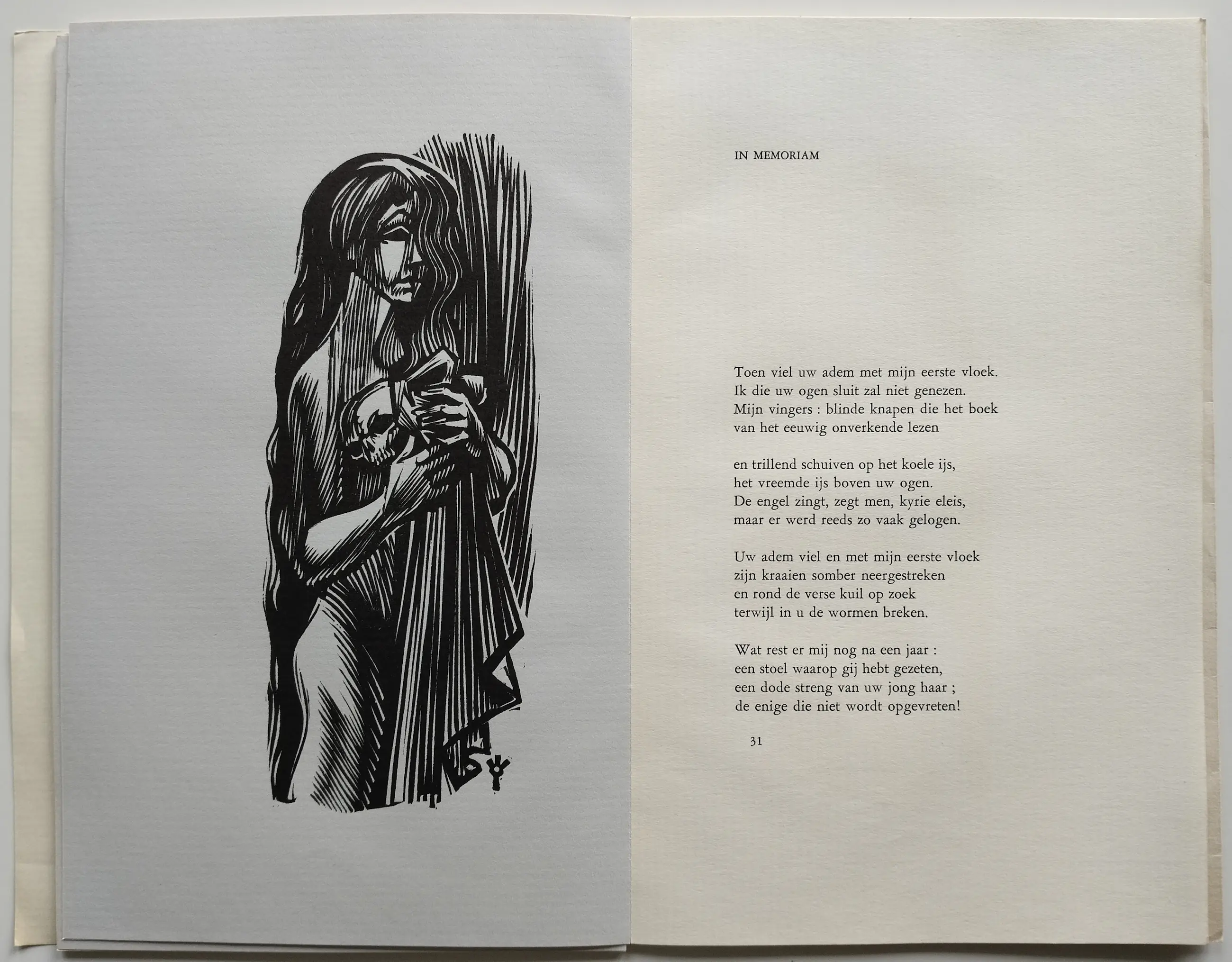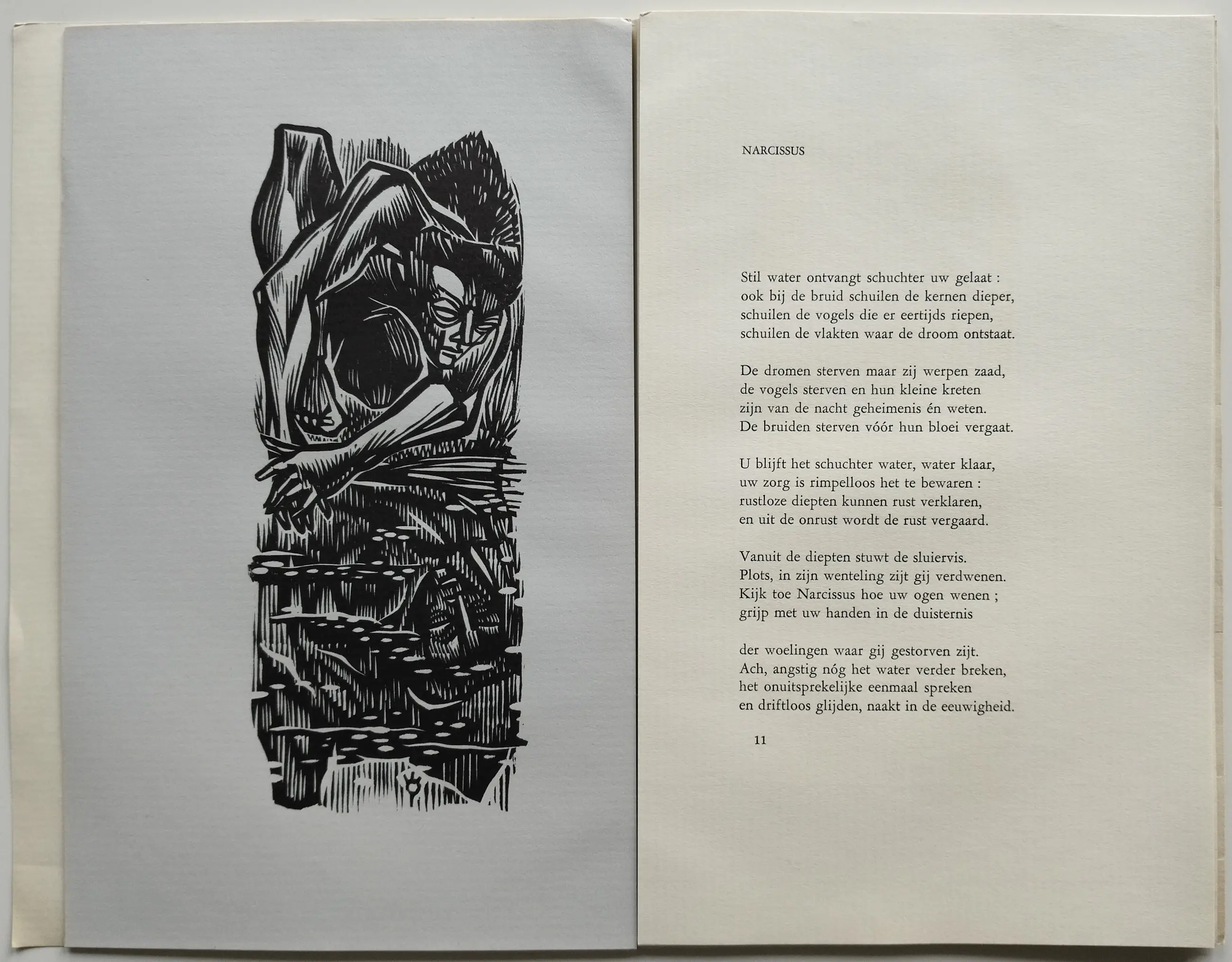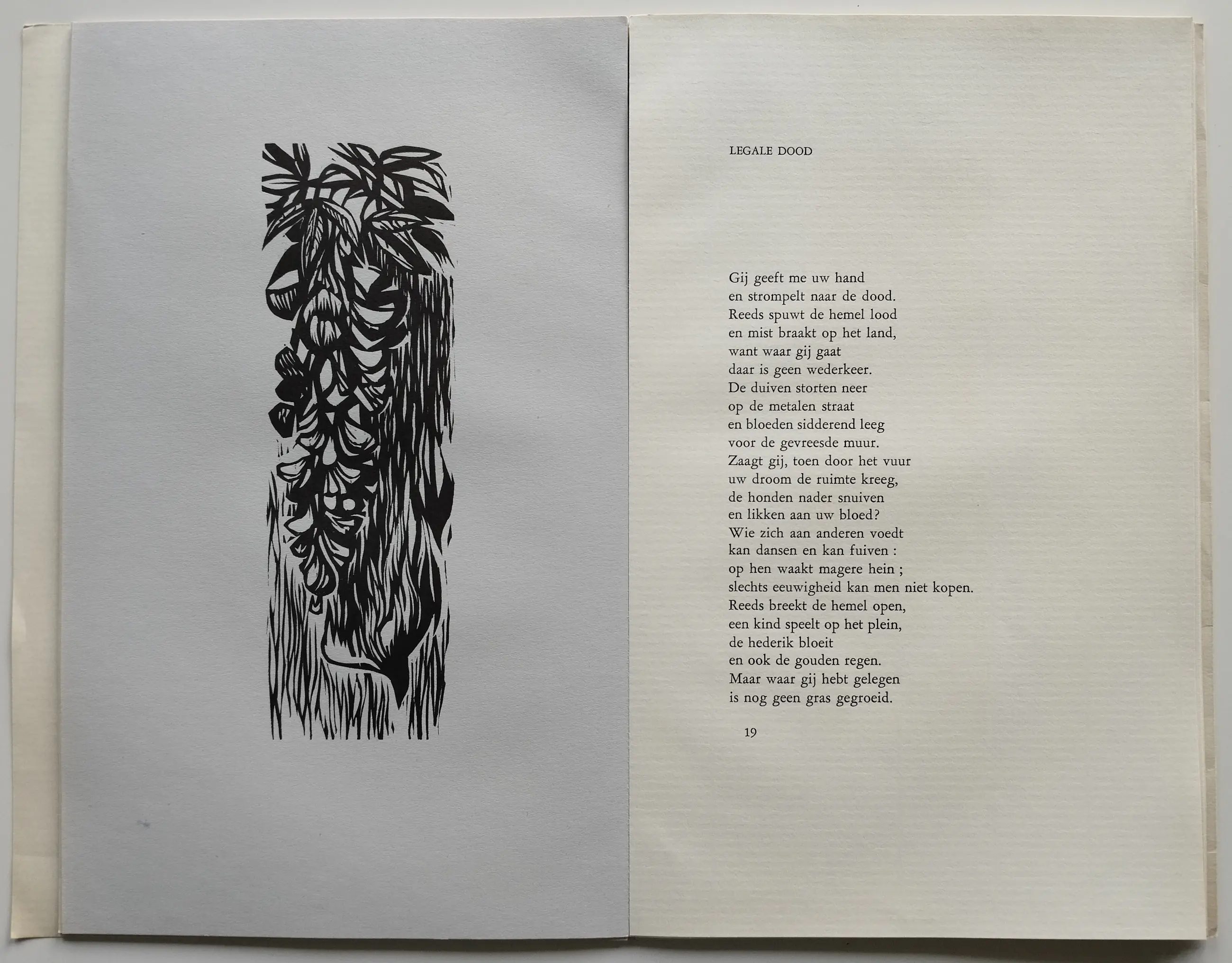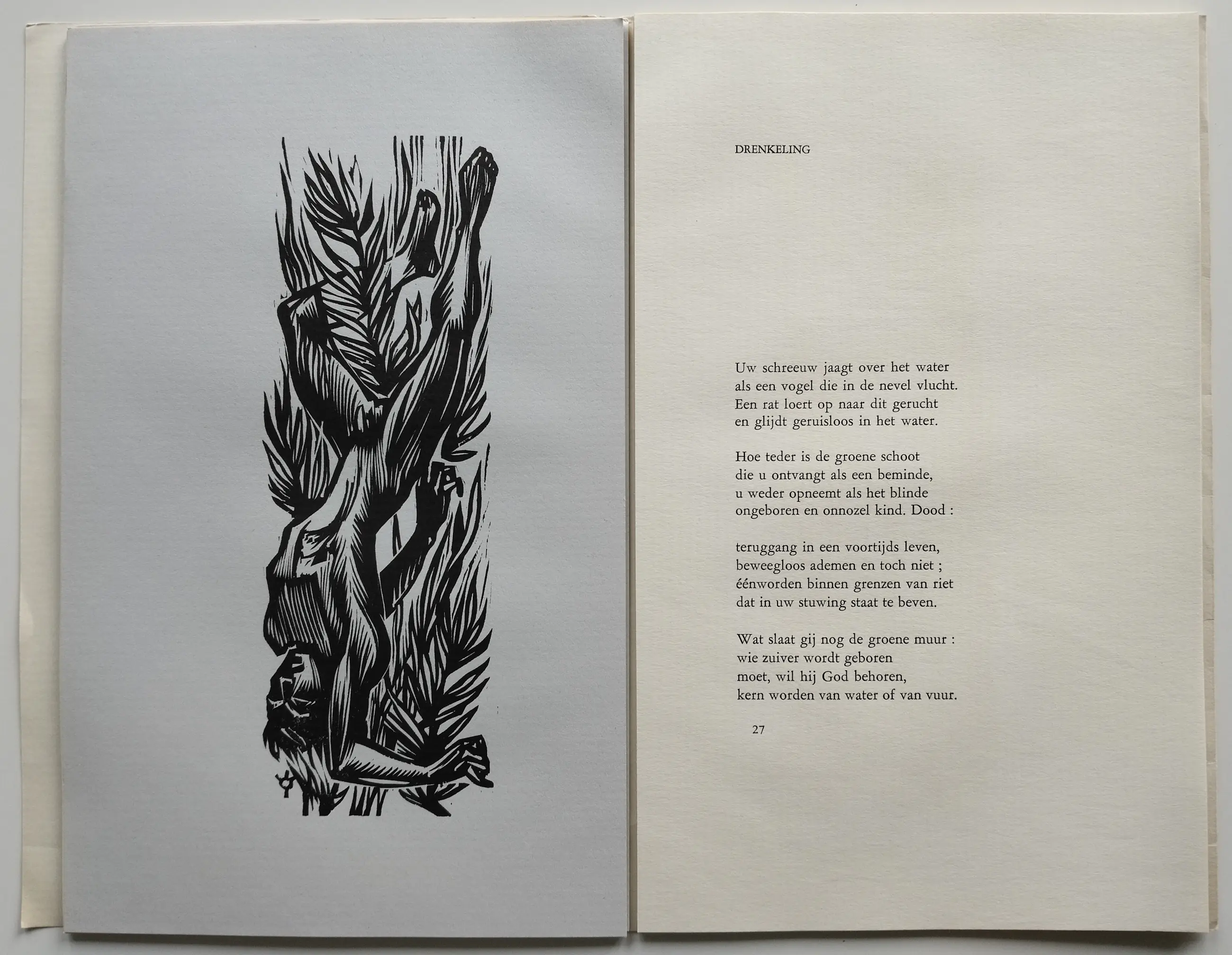 Op de kaft zitten wat vlekjes en wat kleine vouwtjes en kreukjes. De inhoud zit los in de kaft en is niet meer 1 geheel. De houtsneden en tekst bladen zijn in prima staat.