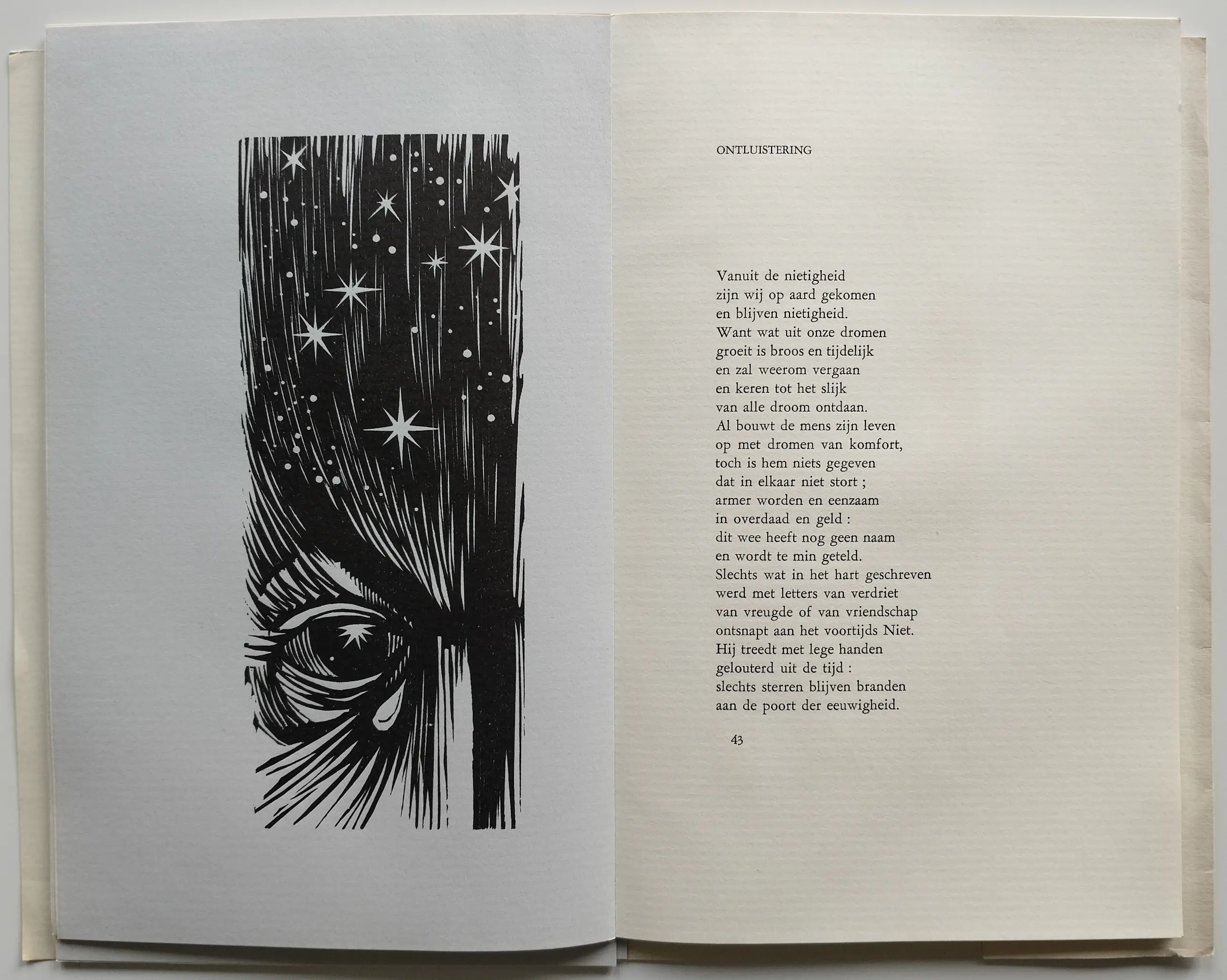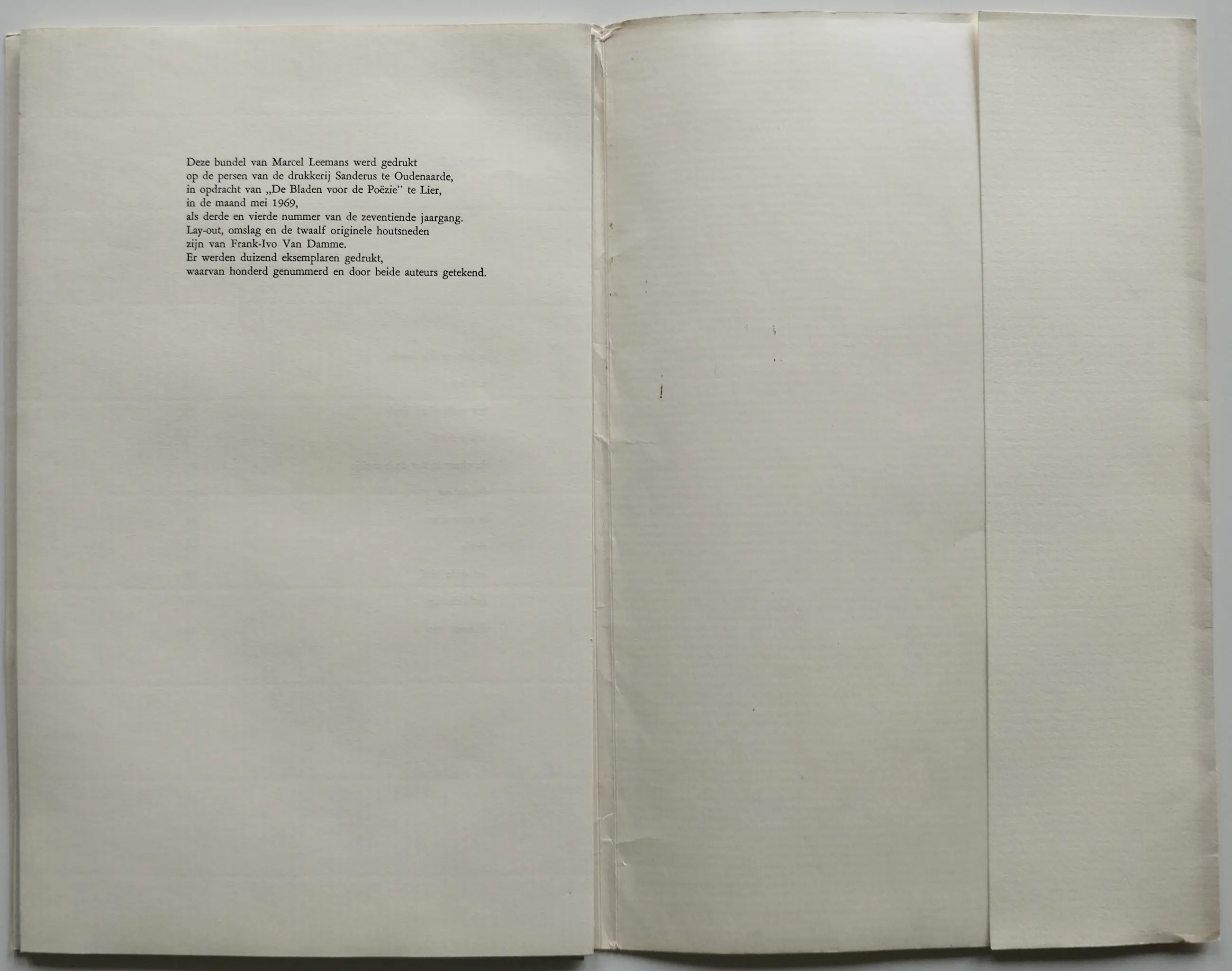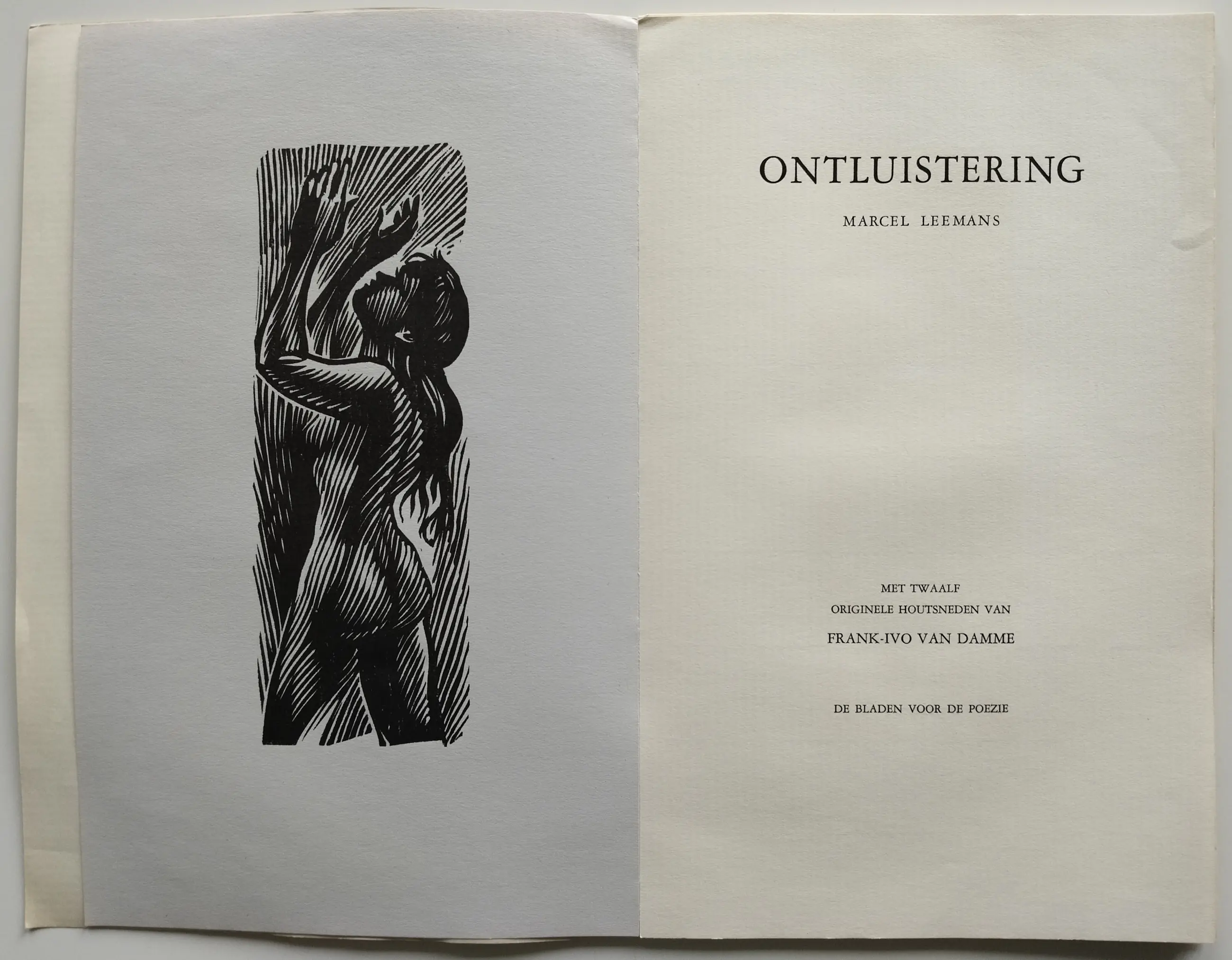 Boekwerk de Ontluistering van Marcel Leemans met 12 originele houtsneden van Frank-Ivo van Damme (1932), Gedrukt in uit 1969 met een oplage van 1000 stuks. Afmeting boekje 28 x 18 cm (hxb) Op de kaft zitten wat vlekjes en wat kleine vouwtjes en kreukjes. De inhoud zit los in de kaft en is niet meer 1 geheel. De houtsneden en tekst bladen zijn in prima staat.