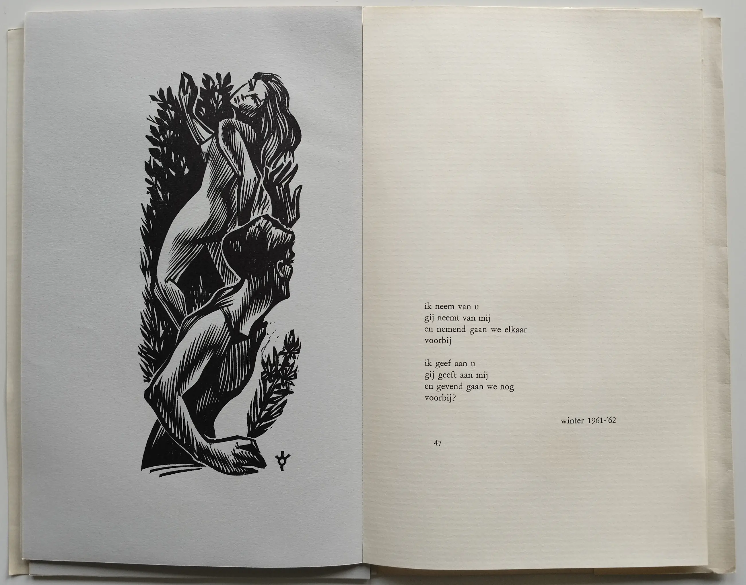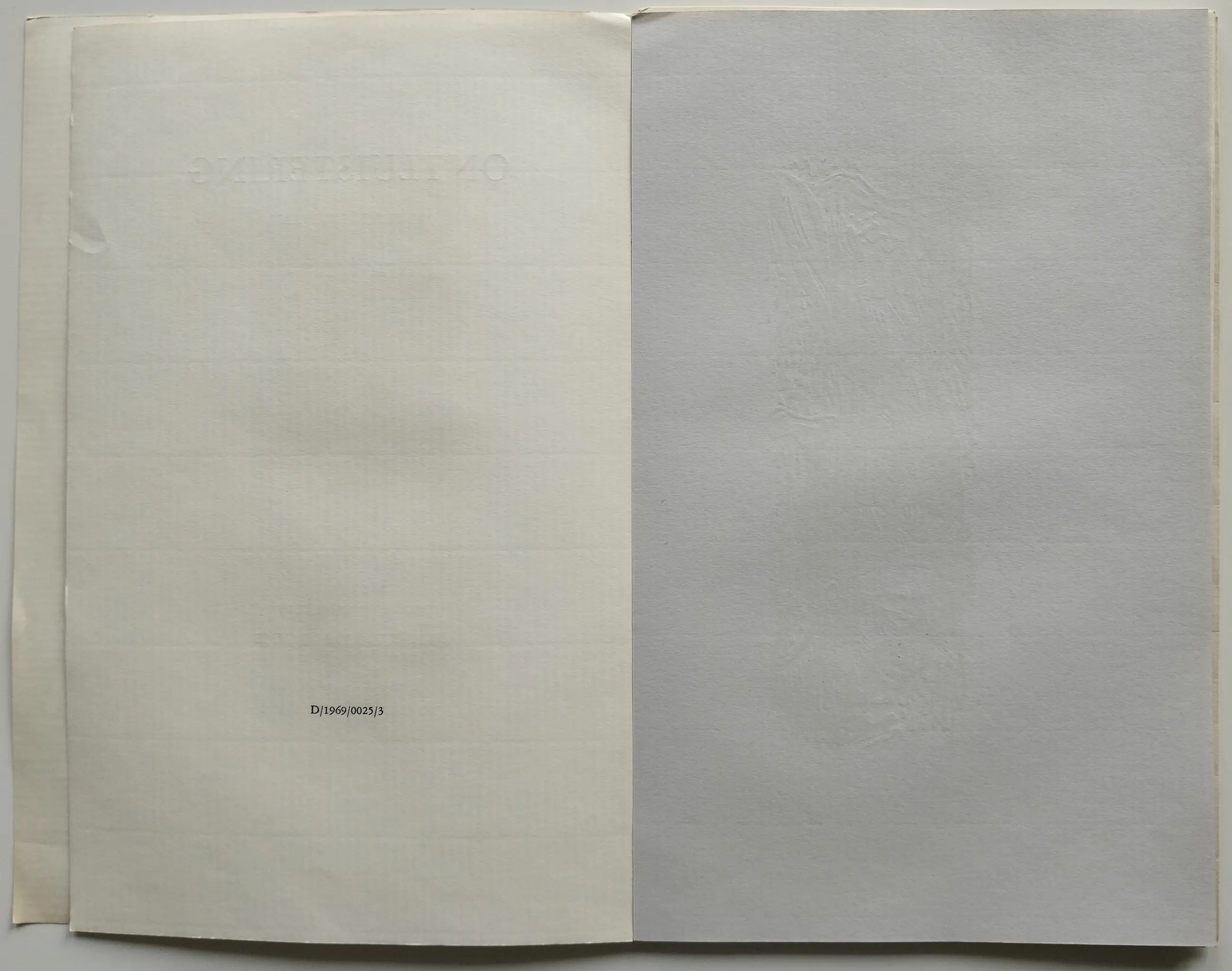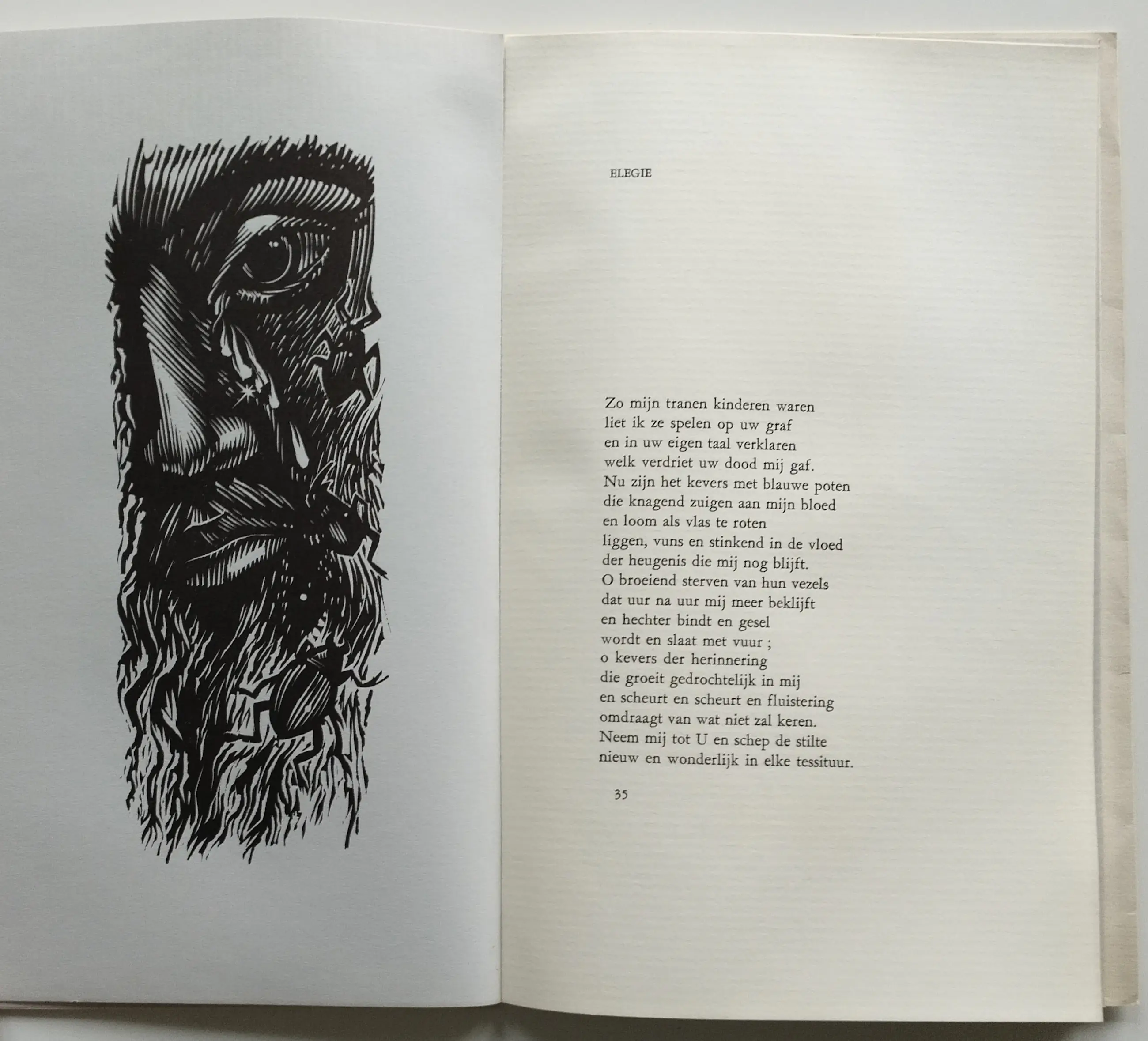 Boekwerk de Ontluistering van Marcel Leemans met 12 originele houtsneden van Frank-Ivo van Damme (1932), Gedrukt in uit 1969 met een oplage van 1000 stuks. Afmeting boekje 28 x 18 cm (hxb) Op de kaft zitten wat vlekjes en wat kleine vouwtjes en kreukjes. De inhoud zit los in de kaft en is niet meer 1 geheel. De houtsneden en tekst bladen zijn in prima staat.