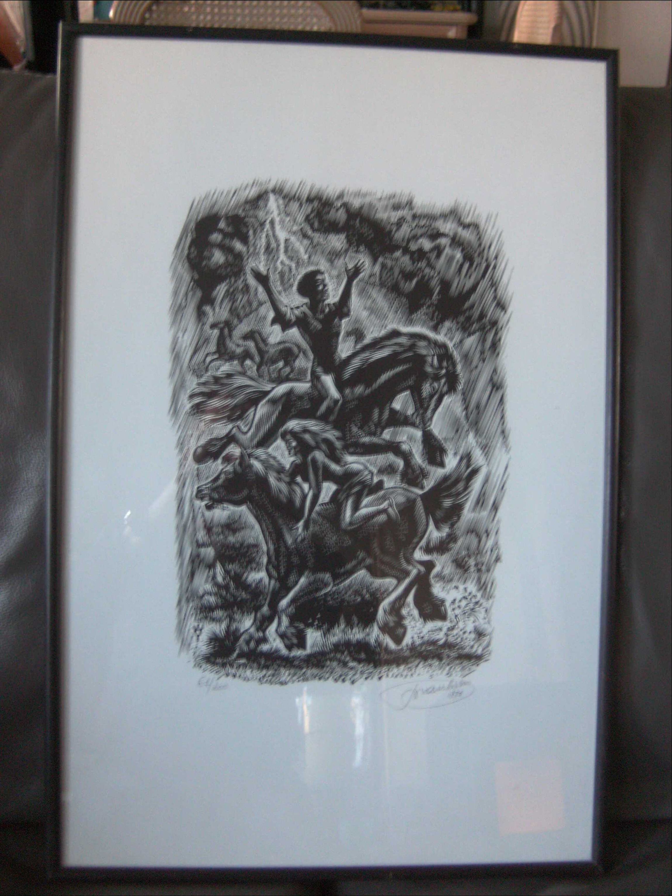 Zeer mooie houtgravure van de kunstenaar Frank-Ivo van Damme. Geboren 1932. Werkje dateert van 1971. De Walkuren-rit genaamd.