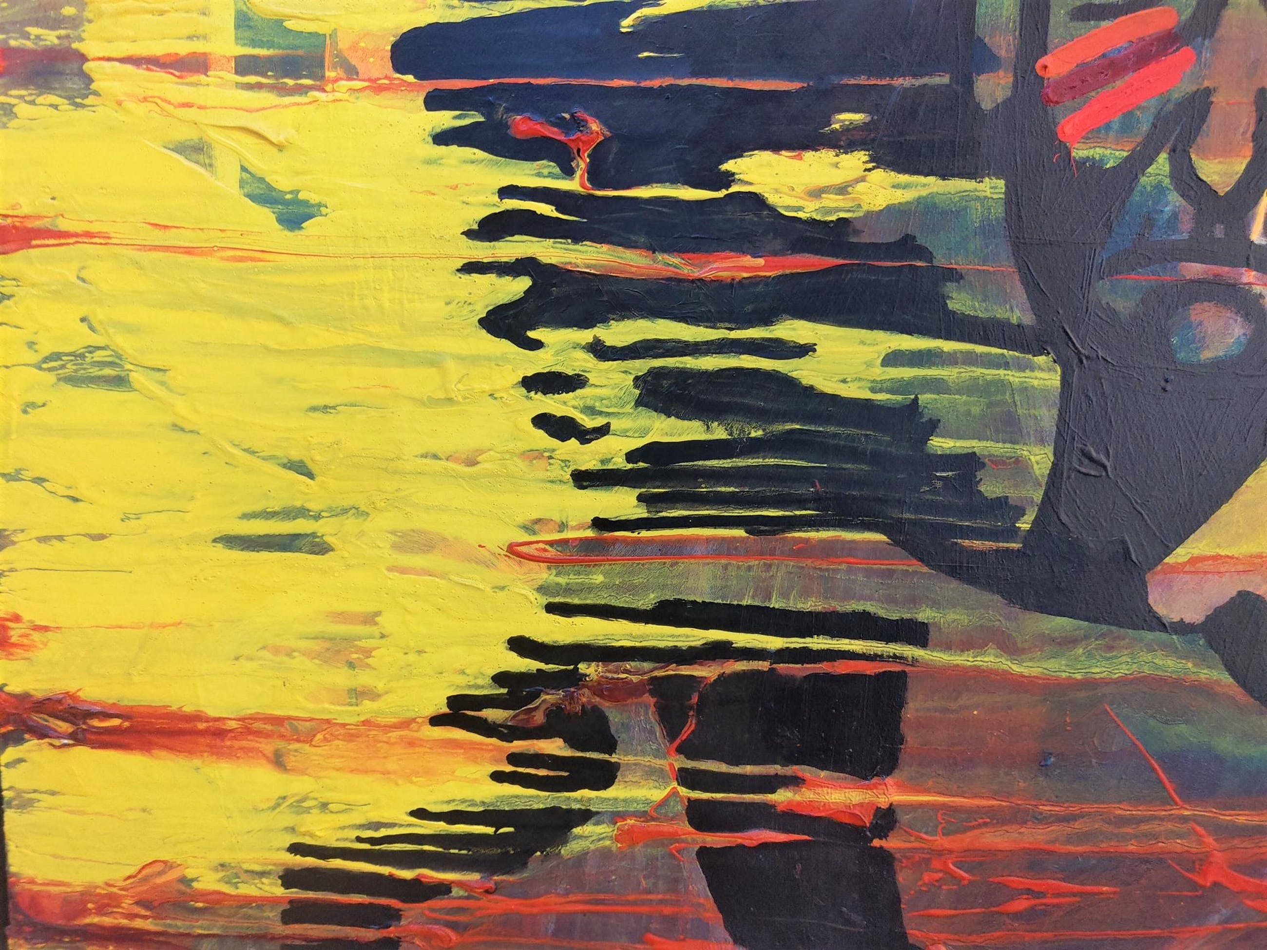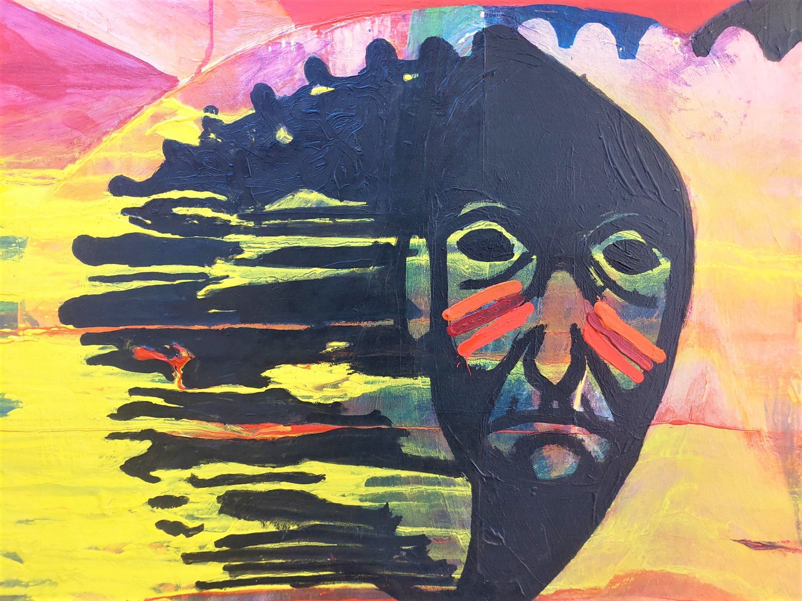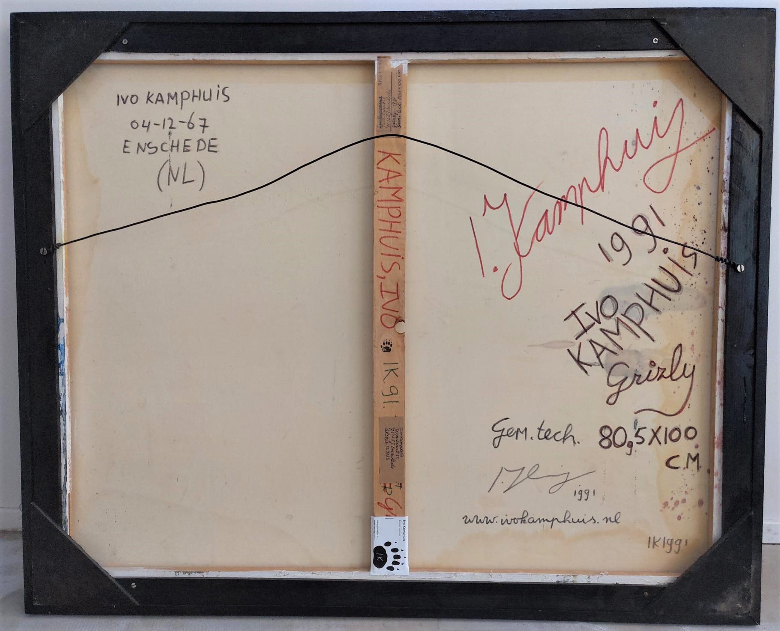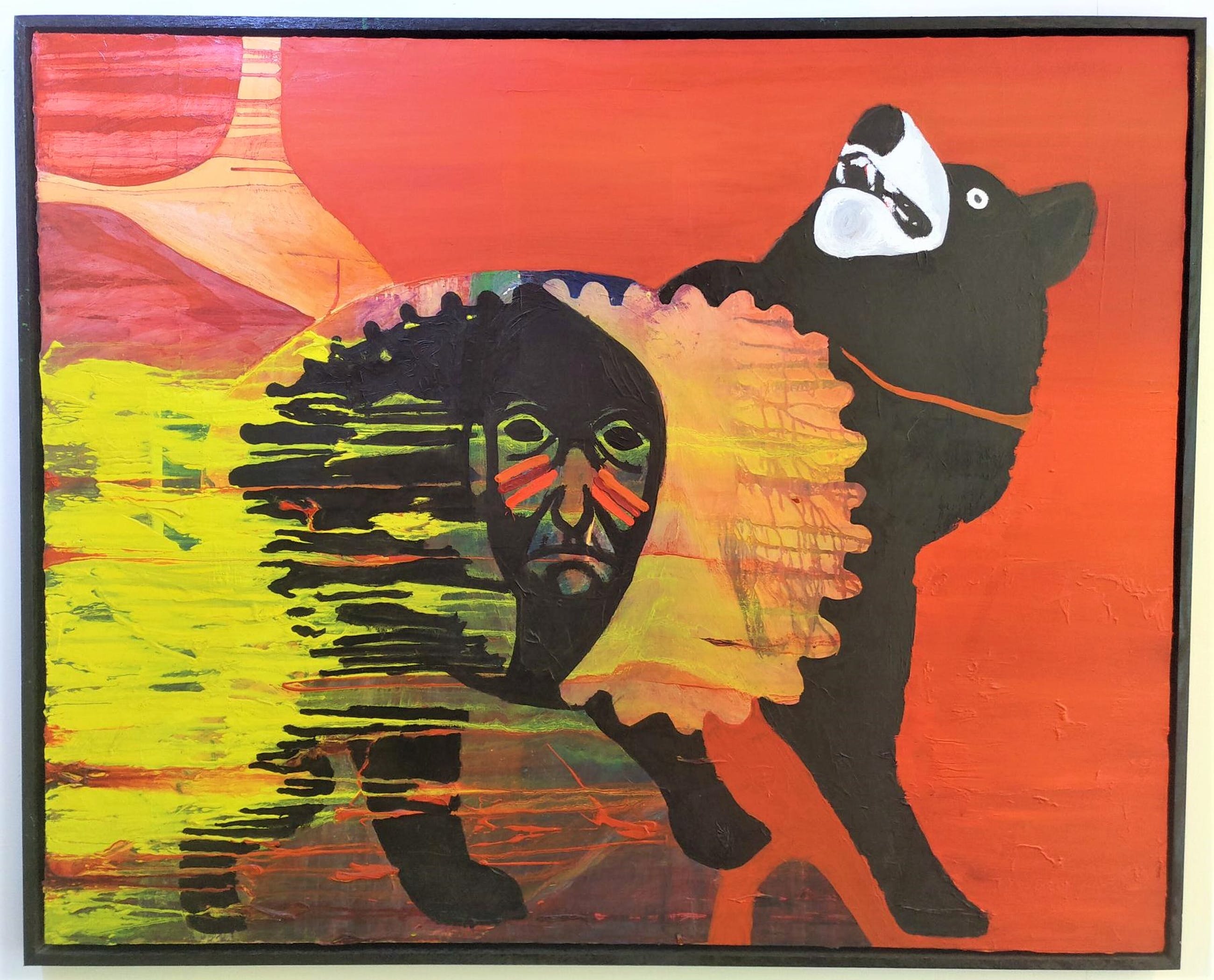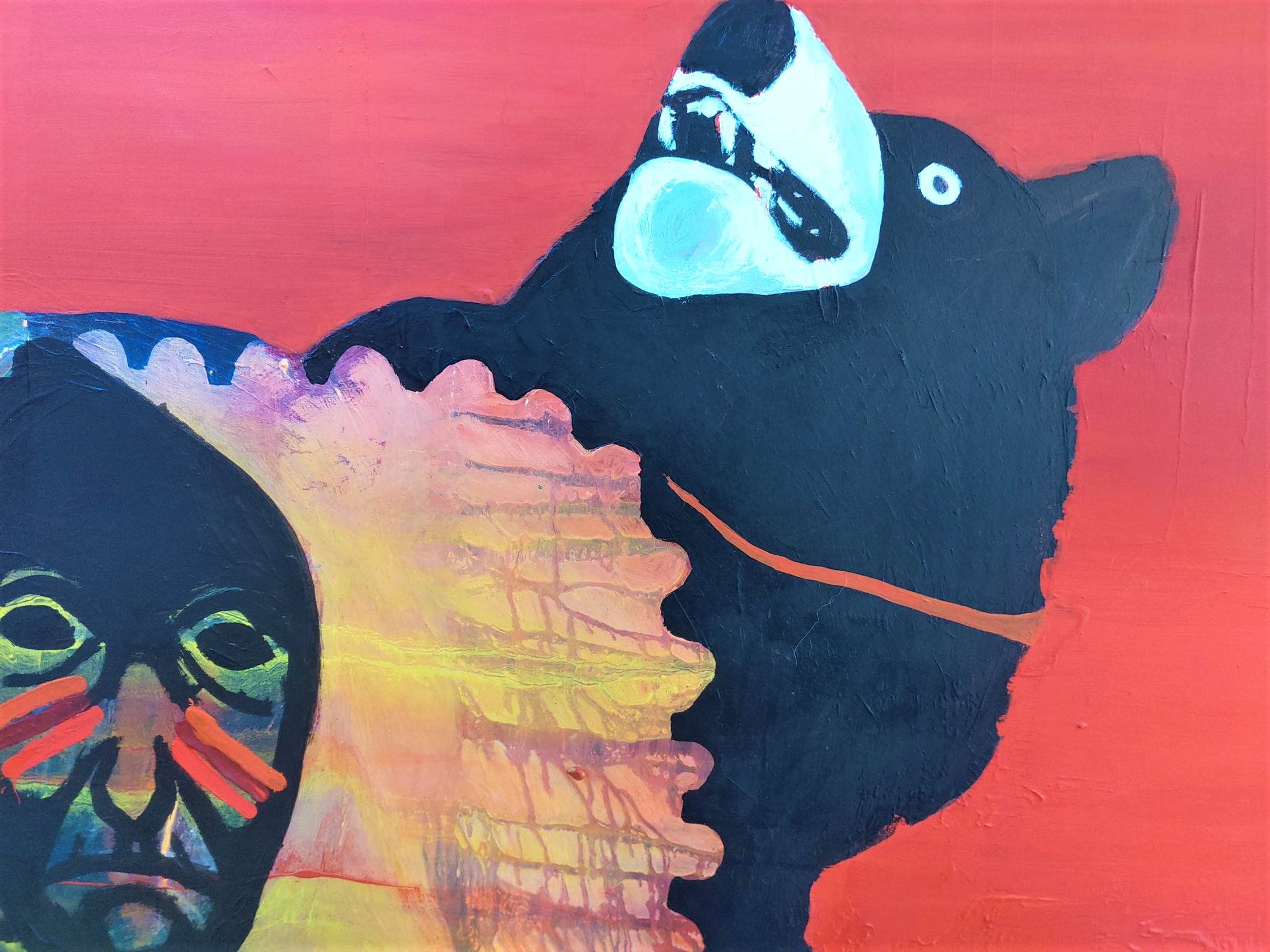 Prachtig werk met grizzly beer en portret van sjaman in abstract landschap. Zowel acryl als olieverf op canvas incl. zwarte houten lijst.
