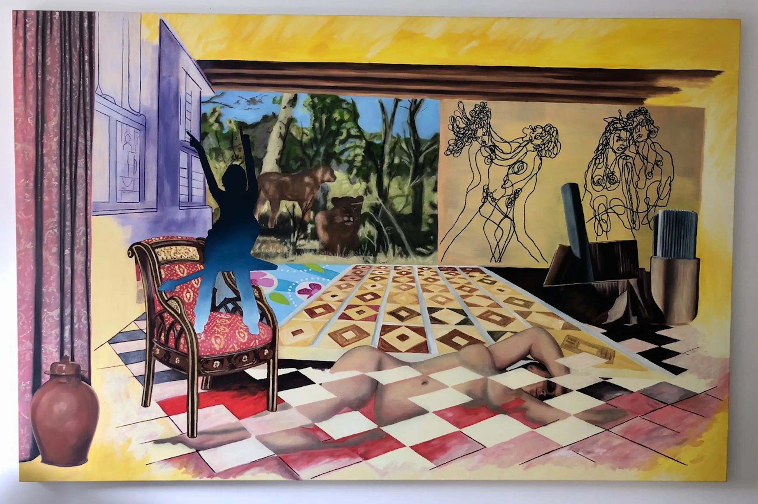 De blik dwaalt tussen interieur en landschap, tussen lichaam, schaduw en herinnering. Door de gelaagde beeldtaal onderzoekt het schilderij de relatie tussen realiteit, perceptie en de innerlijke wereld.
