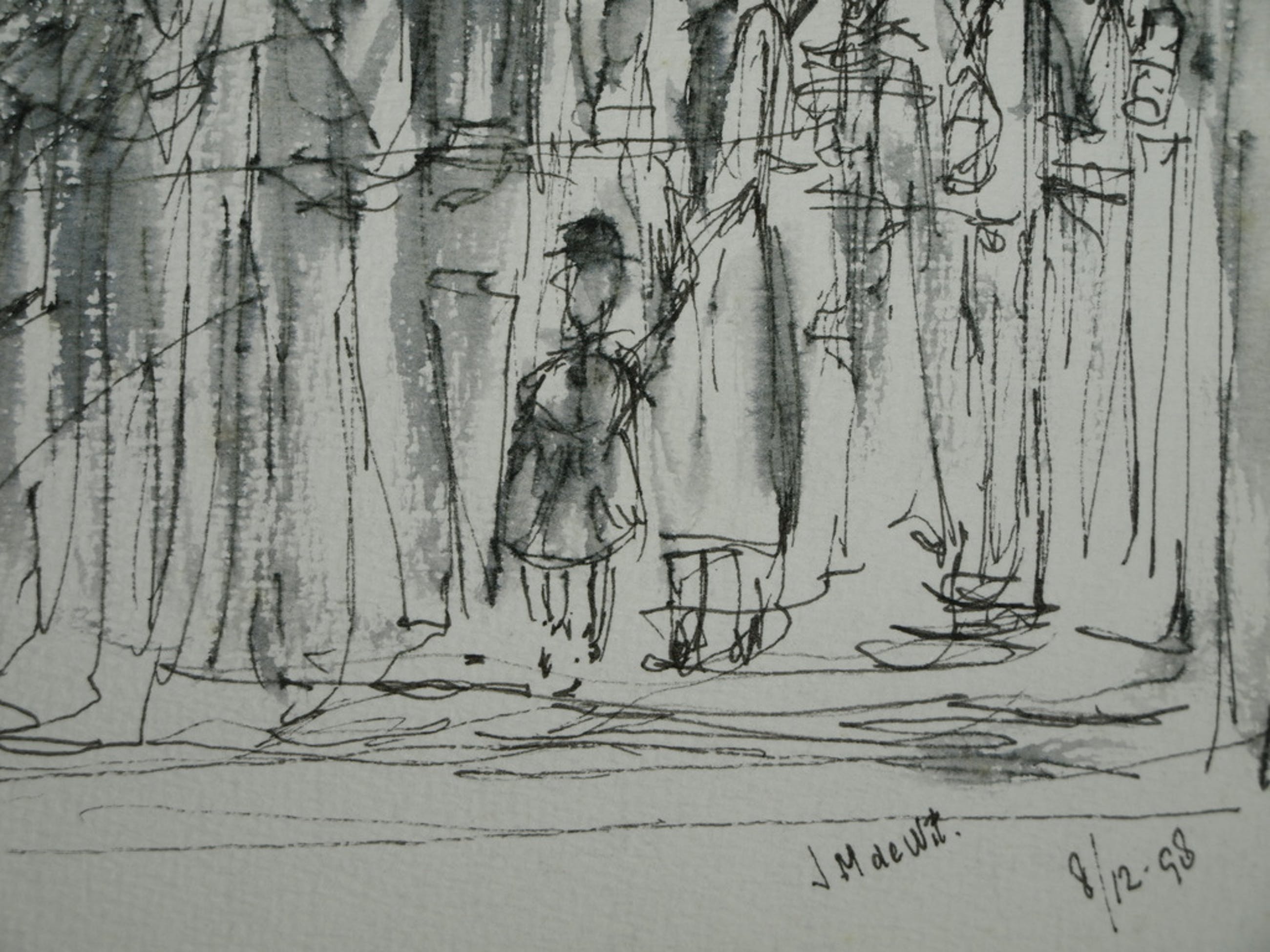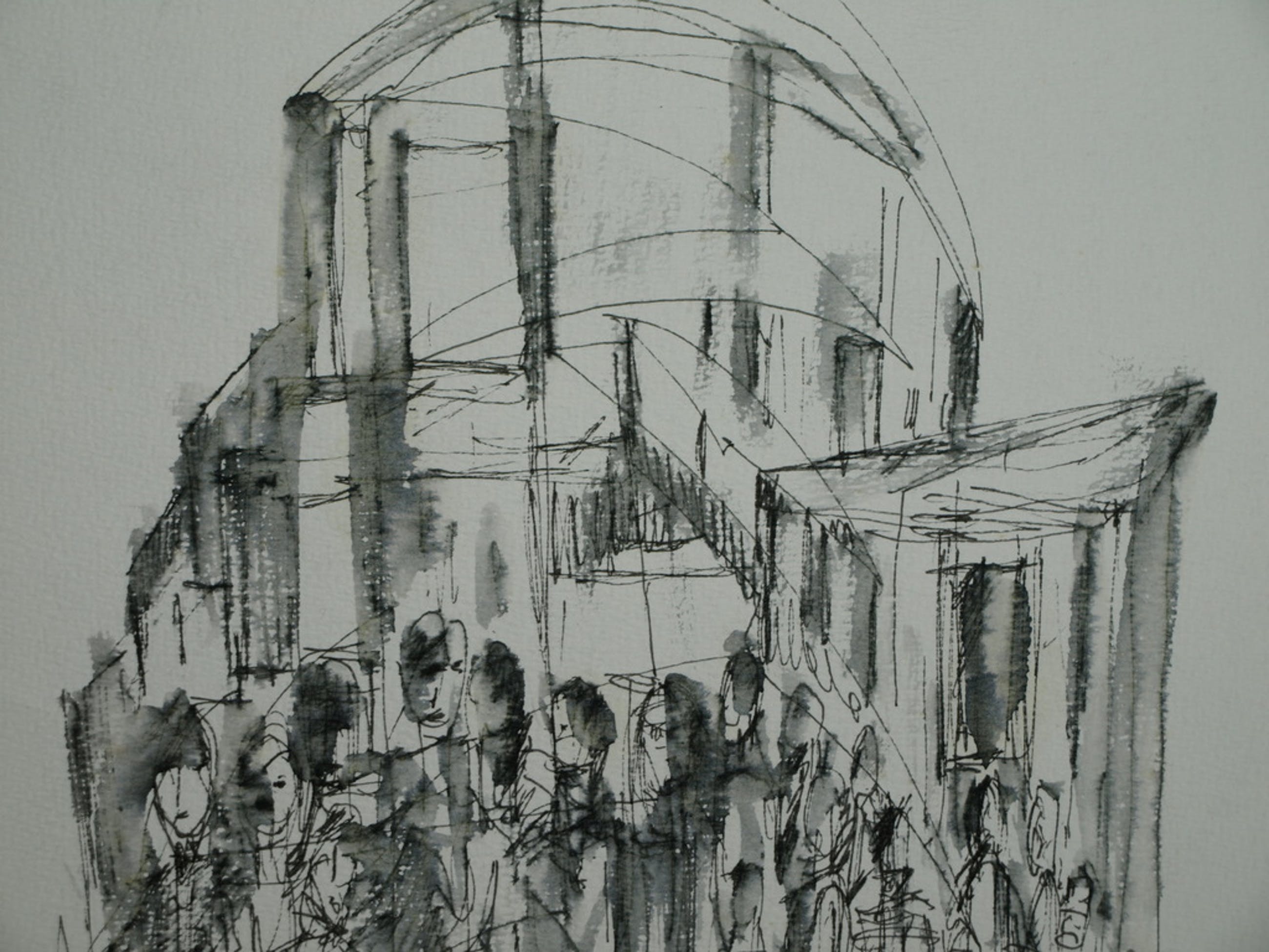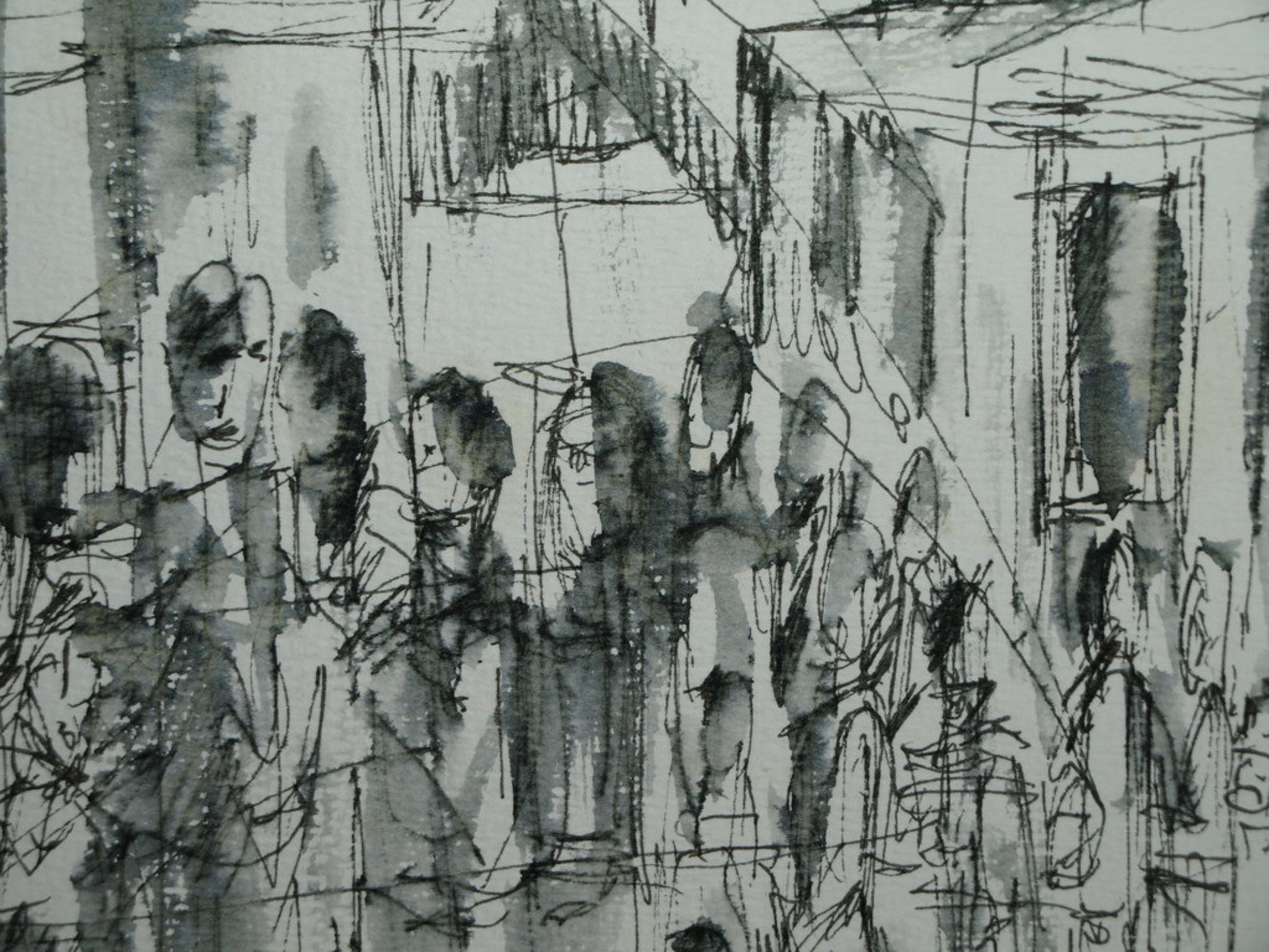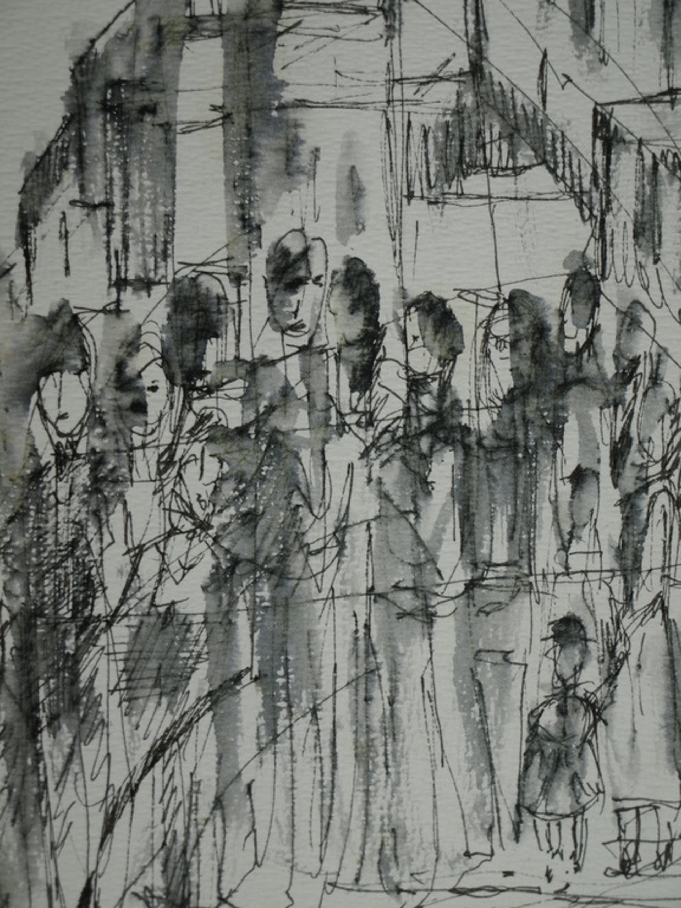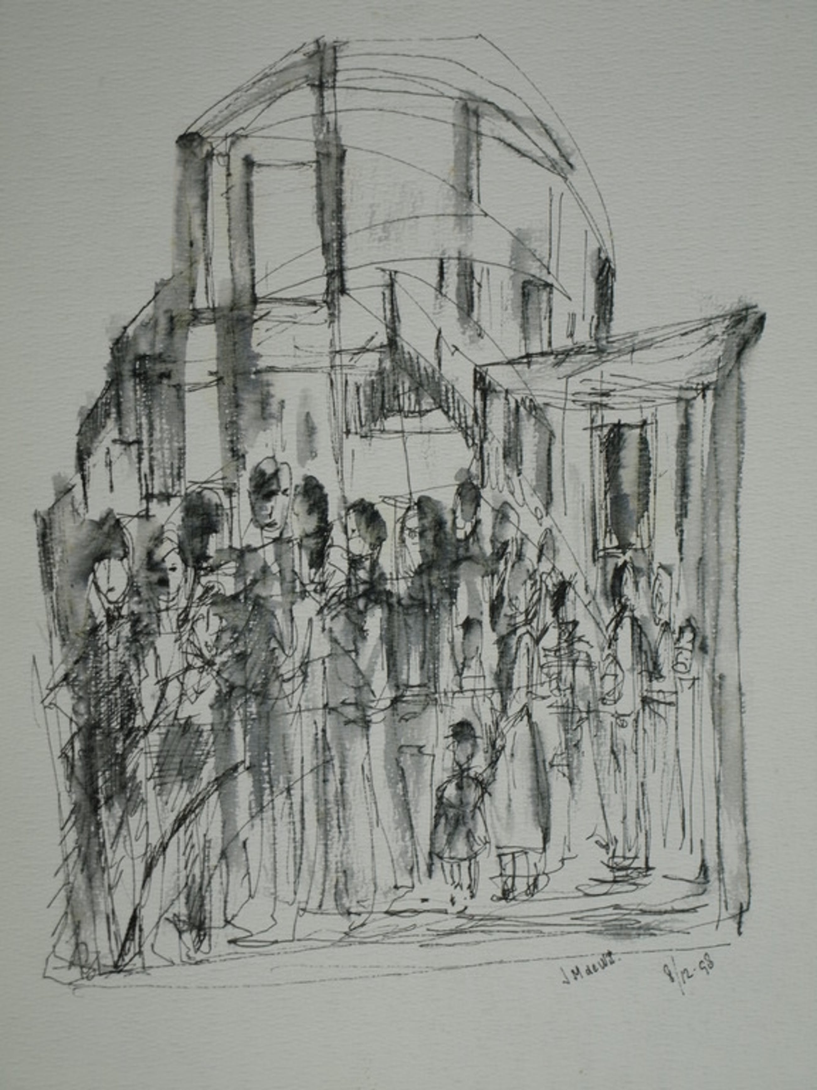 Een pentekening met daarop een groep mensen in de rij, of wachtend, voor een gebouw (een synagoge?).