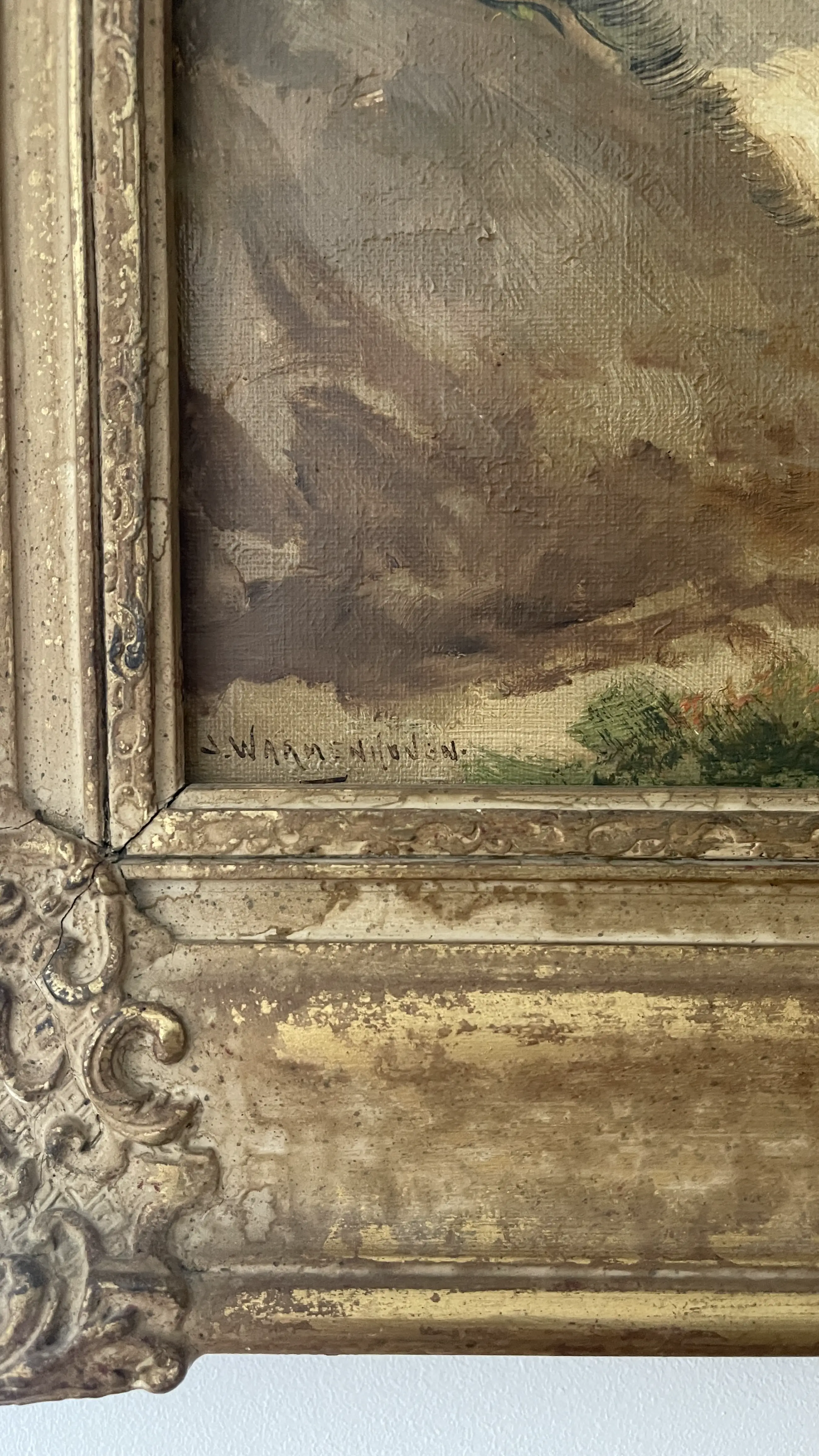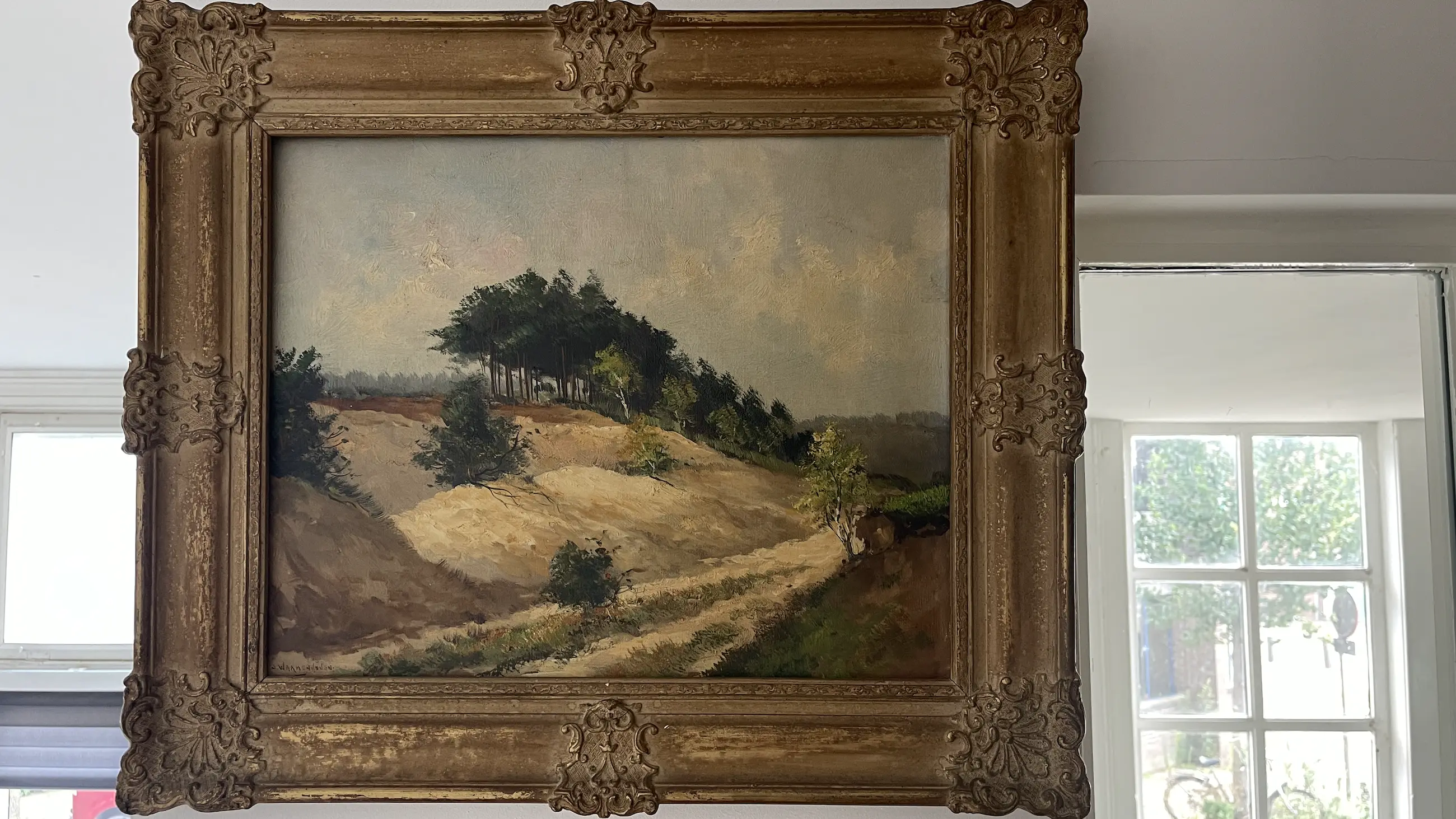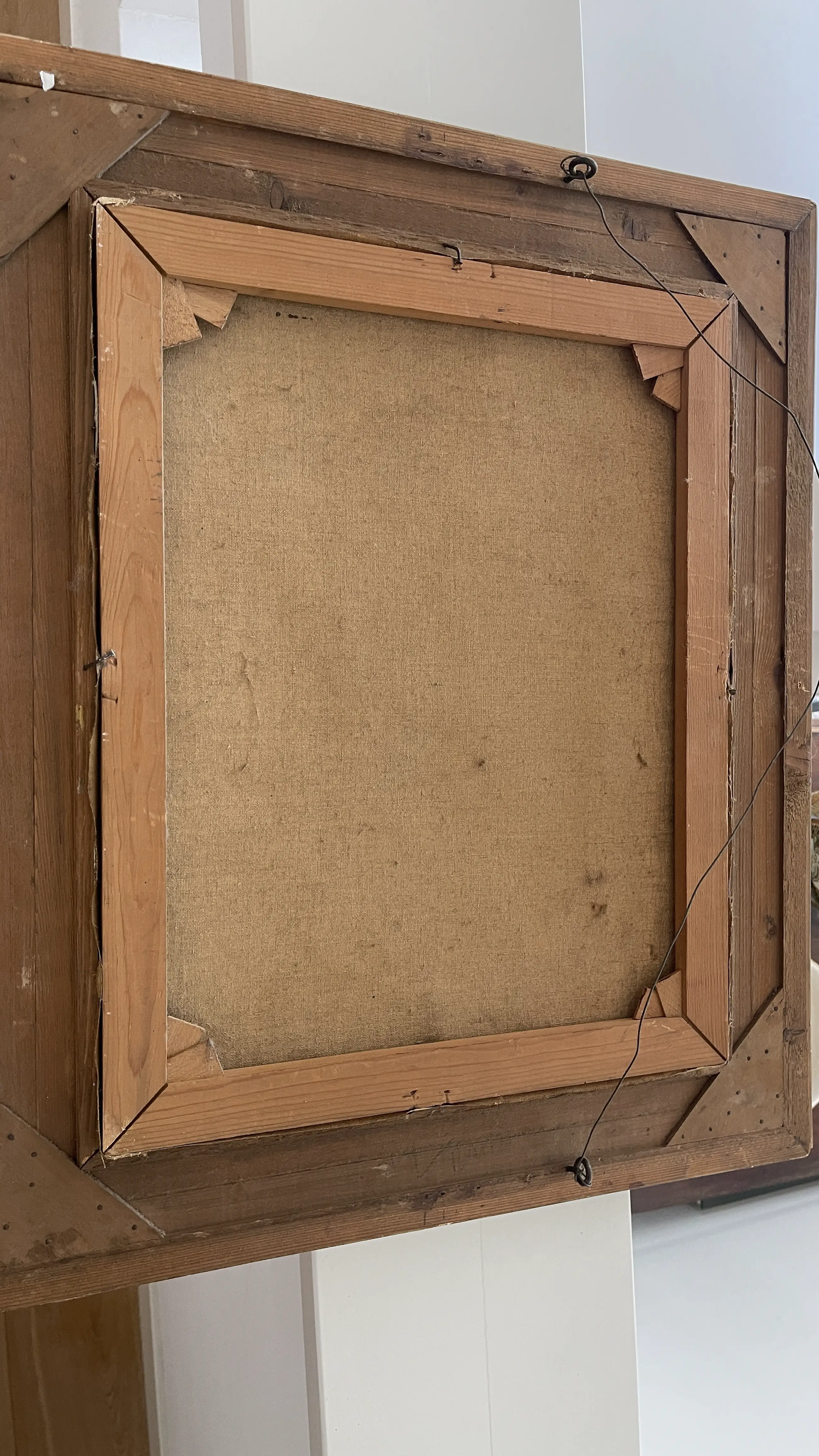 Gekocht op een veiling, lijkt met originele lijst. Wegens verhuizing verkoop ik deze. Mooi landschap, vermoed alleen dat schoonmaken loont.